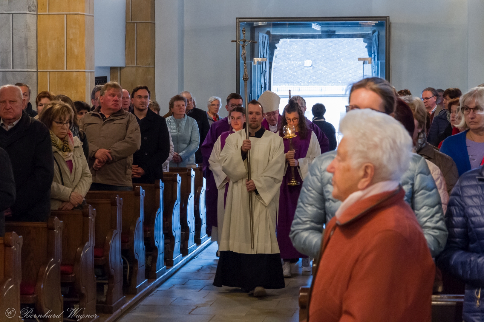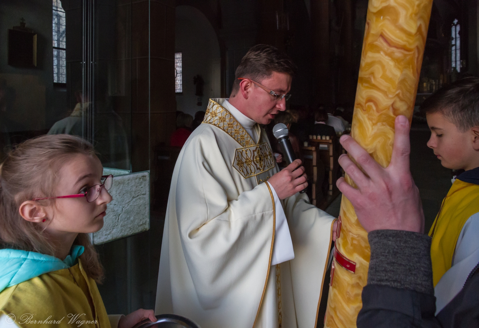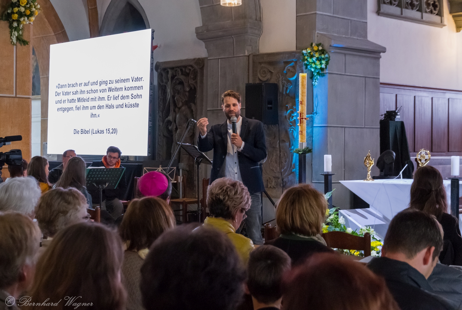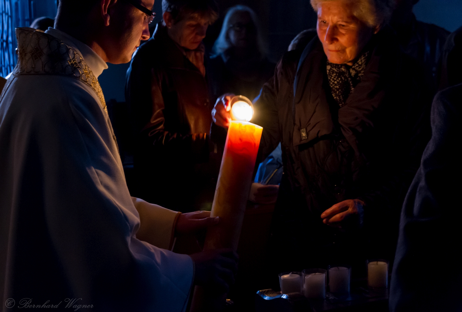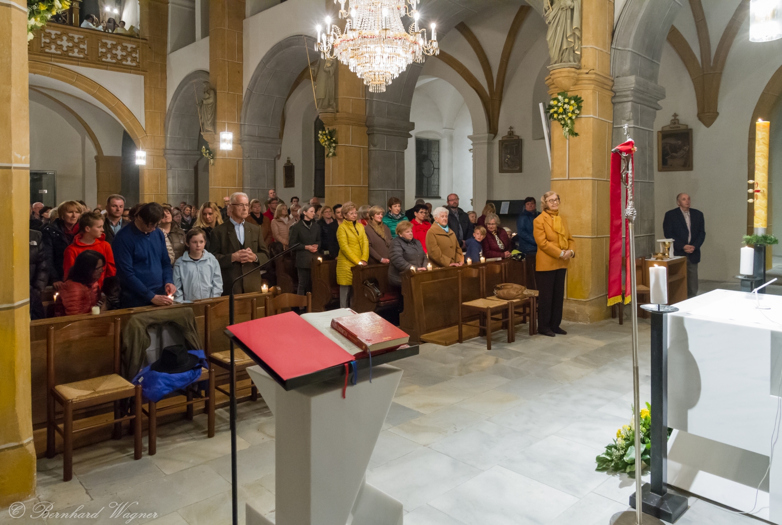 Schließlich zogen Provisor Kranicki und die Ministranten mit der brennenden Osterkerze in die dunkle Kirche ein und schritten langsam den Mittelgang hinauf zum Volksaltar. Unterwegs gab es drei Stationen bei denen er den Ruf „Lumen Christi“, in der deutschen Fassung: „Christus das Licht“, sang. Für die Gläubigen waren eigene kleine Osterkerzen in Bechern vorbereitet und jene, die beim Einzug in den Bankreihen neben dem Gang standen, konnten das Osterlicht direkt von der Osterkerze übernehmen, die anderen wiederum bekamen es von ihren jeweiligen Nachbarinnen und Nachbarn dargereicht sodass sich der Kirchenraum in eindrucksvoller Weise rasch mit brennenden Lichtern erfüllte.