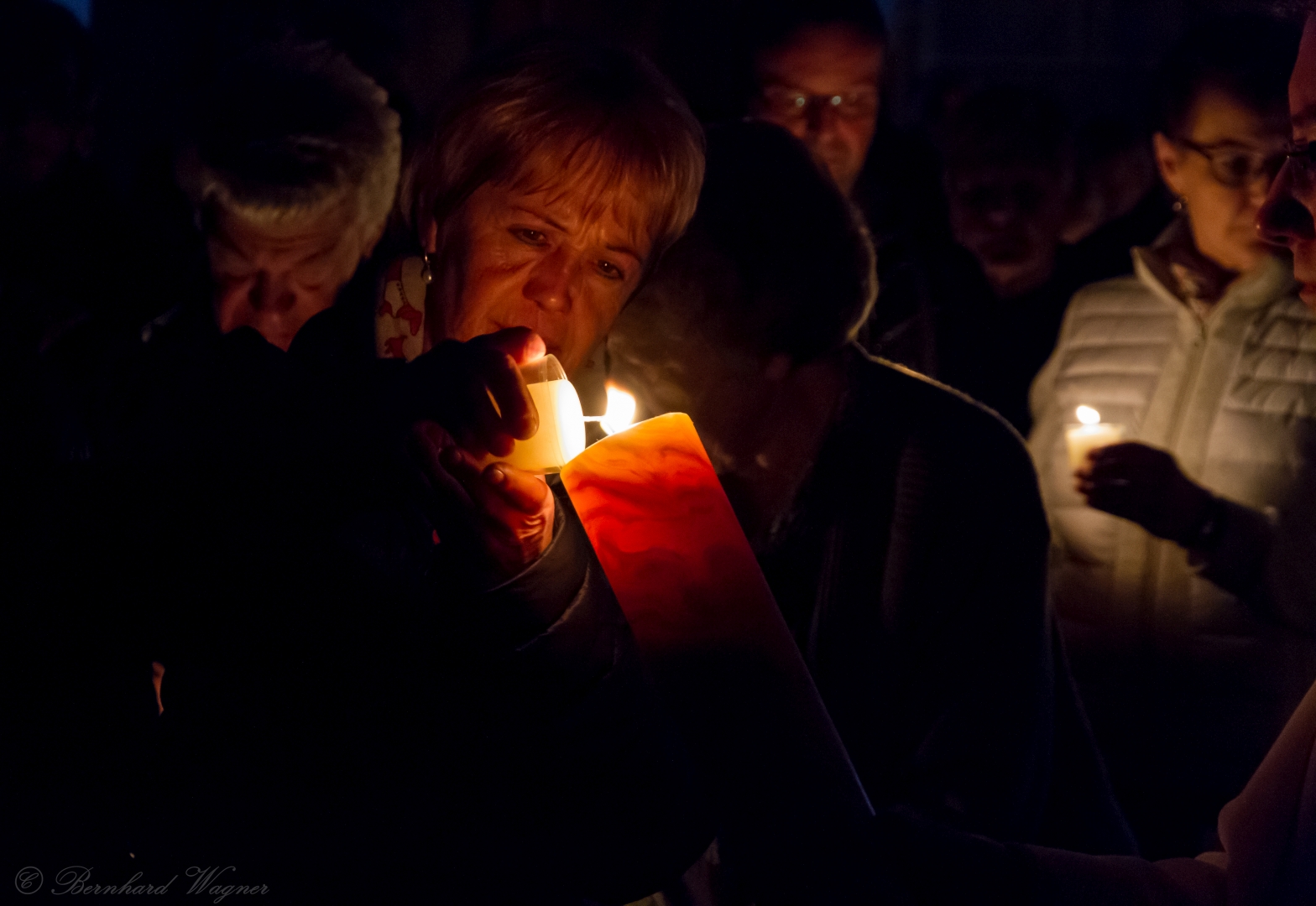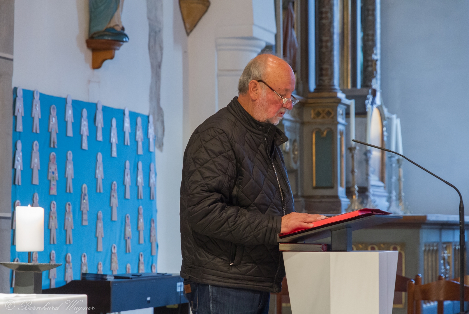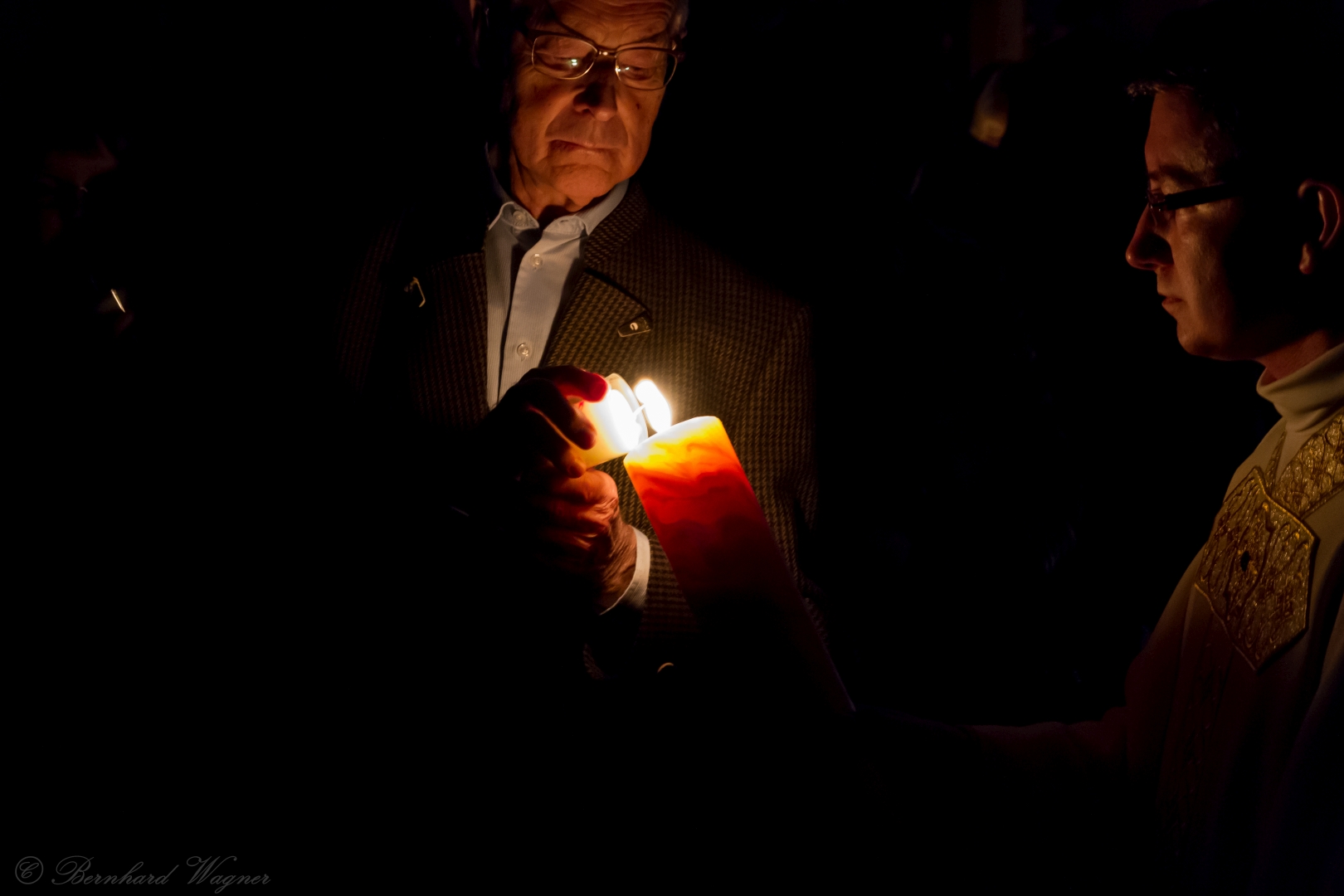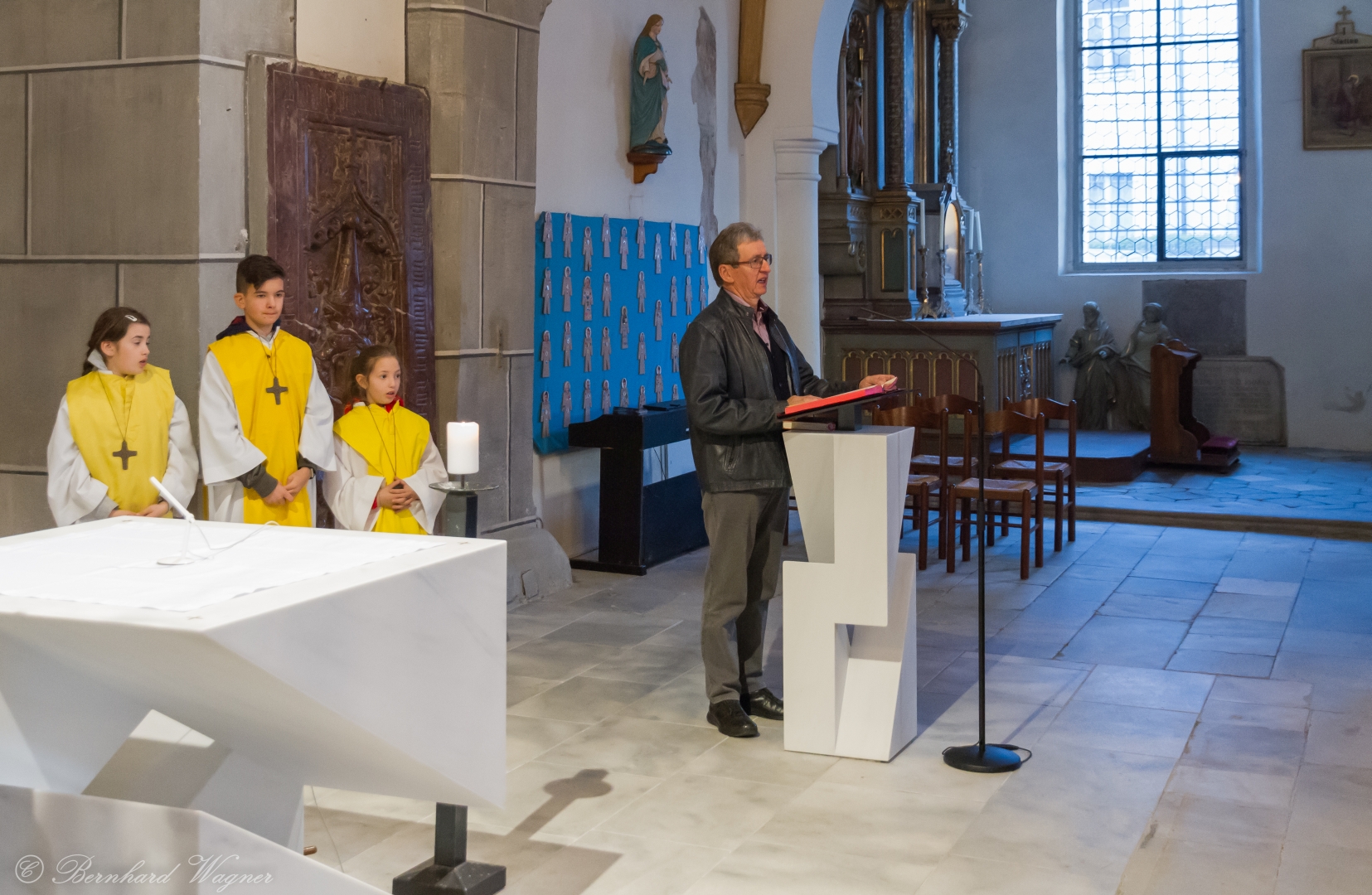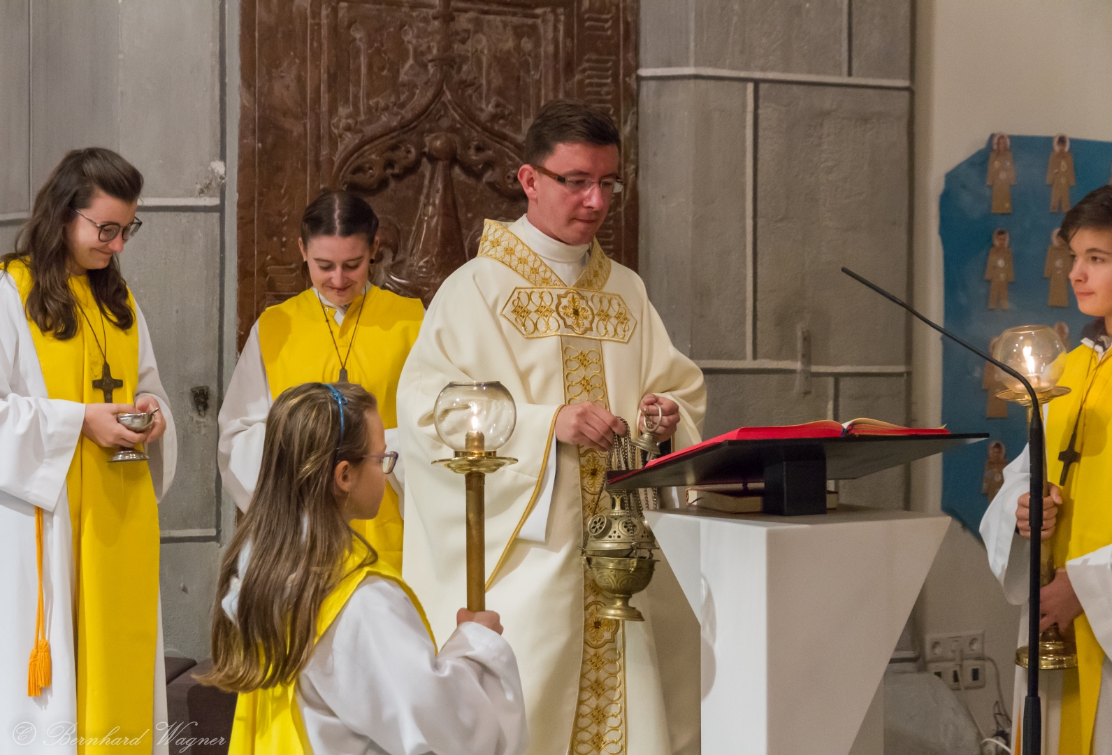 Schließlich zogen Provisor Kranicki und die Ministranten mit der brennenden Osterkerze in die dunkle Kirche ein und schritten langsam den Mittelgang hinauf zum Volksaltar. Unterwegs gab es drei Stationen bei denen er den Ruf „Lumen Christi“, in der deutschen Fassung: „Christus das Licht“, sang. Für die Gläubigen waren eigene kleine Osterkerzen in Bechern vorbereitet und jene, die beim Einzug in den Bankreihen neben dem Gang standen, konnten das Osterlicht direkt von der Osterkerze übernehmen, die anderen wiederum bekamen es von ihren jeweiligen Nachbarinnen und Nachbarn dargereicht sodass sich der Kirchenraum in eindrucksvoller Weise rasch mit brennenden Lichtern erfüllte.
