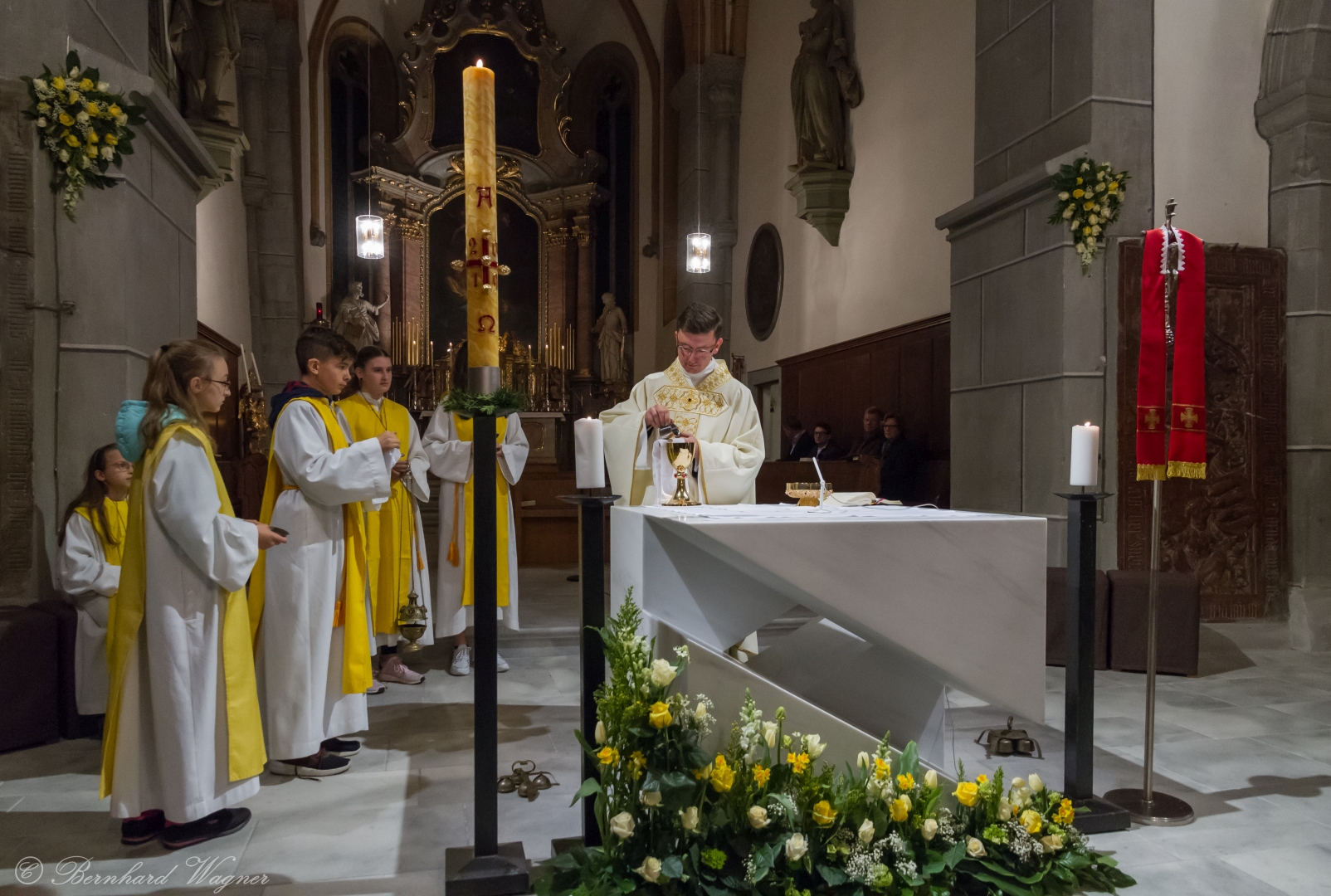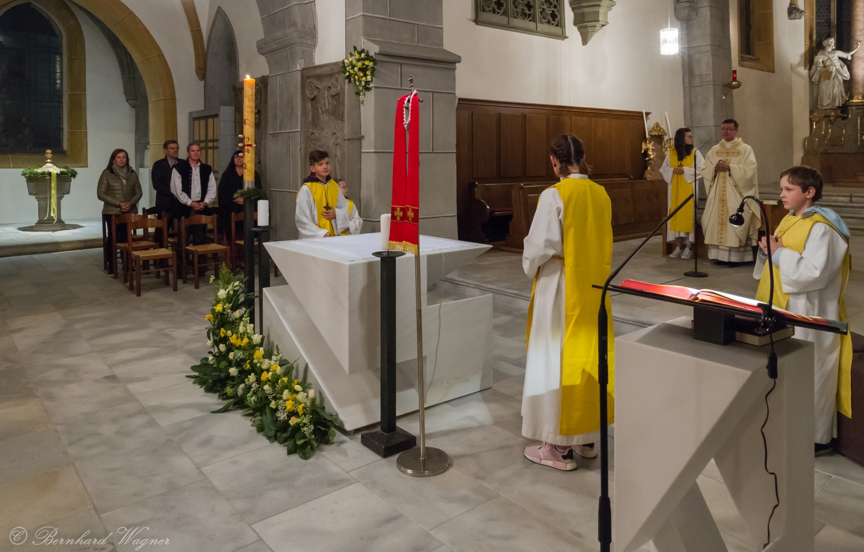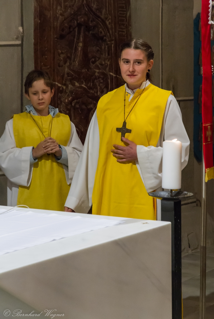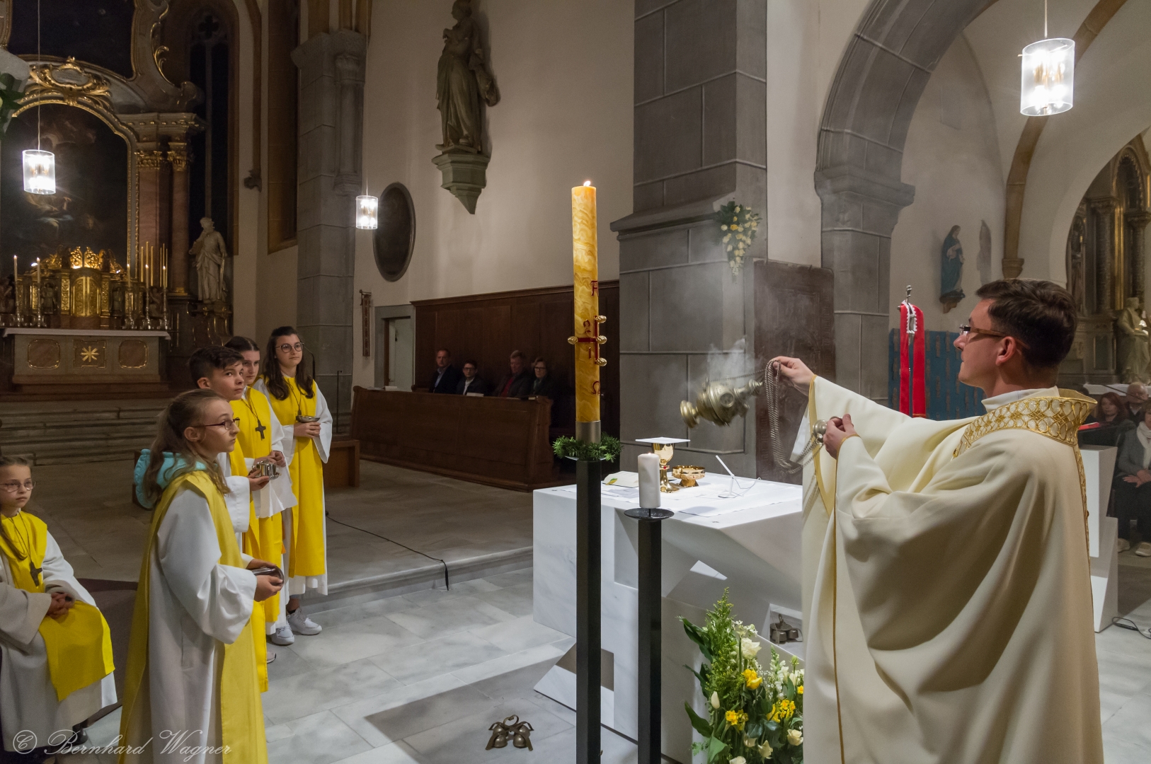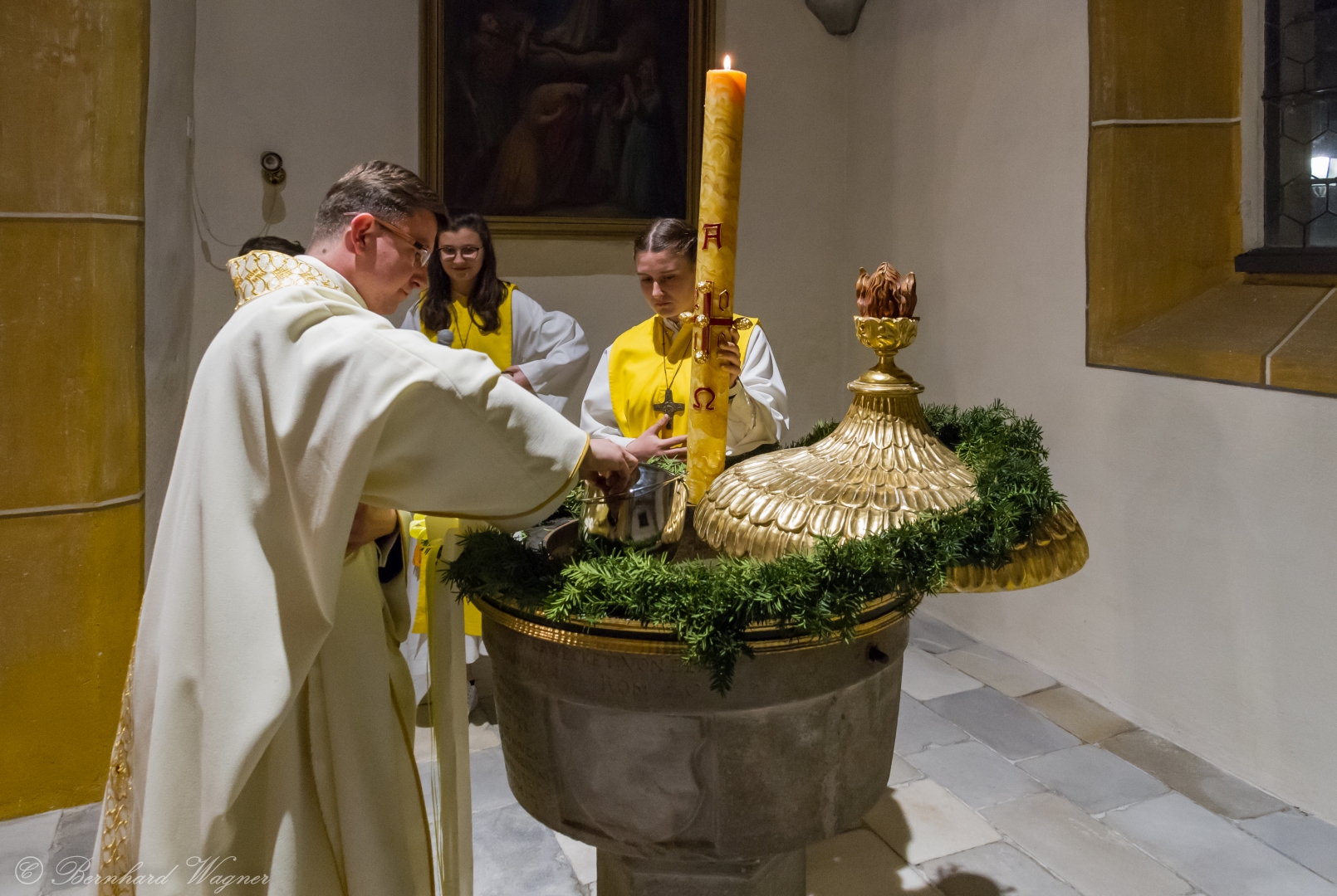 Selbige als dritter Teil der Osternachtliturgie begann mit einer Prozession von Provisor Kranicki und den Ministranten durch das Hauptschiff der Kirche hin zum Portal und von dort das nördliche Seitenschiff entlang zur Seitenkapelle neben dem Eingang zur Turmkapelle wo sich das Taufbecken befindet welches bereits geöffnet und mit Wasser gefüllt war. Derweil wurde die Allerheiligenlitanei gesungen. Es folgten die Segensworte zur Segnung des Wassers und das eindrucksvolle Eintauchen der mitgeführten Osterkerze in das gesegnete Wasser. Dabei spricht der Priester „Durch deinen geliebten Sohn steige herab in dieses Wasser die Kraft des Heiligen Geistes“. Daraufhin erneuerte man das Taufversprechen und beim Lied „Fest soll mein Taufbund immer stehn“ ging der Provisor durch die Kirche um die Gläubigen mit Weihwasser zu besprengen.