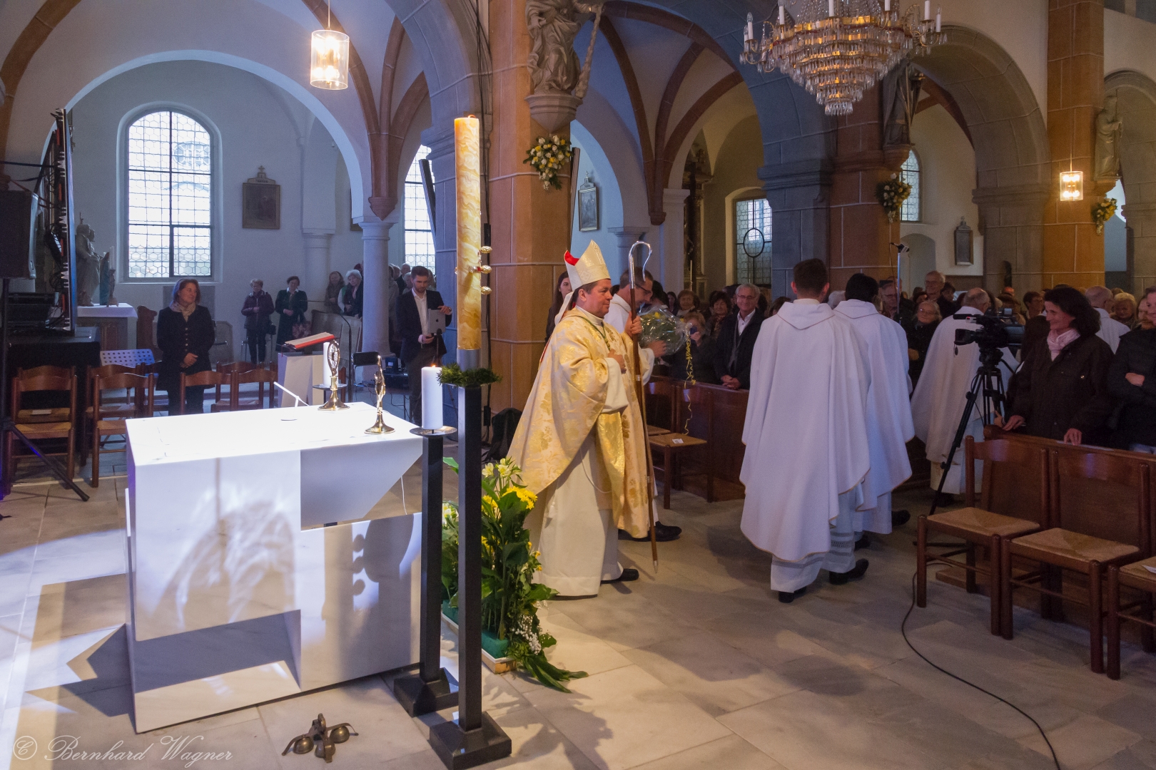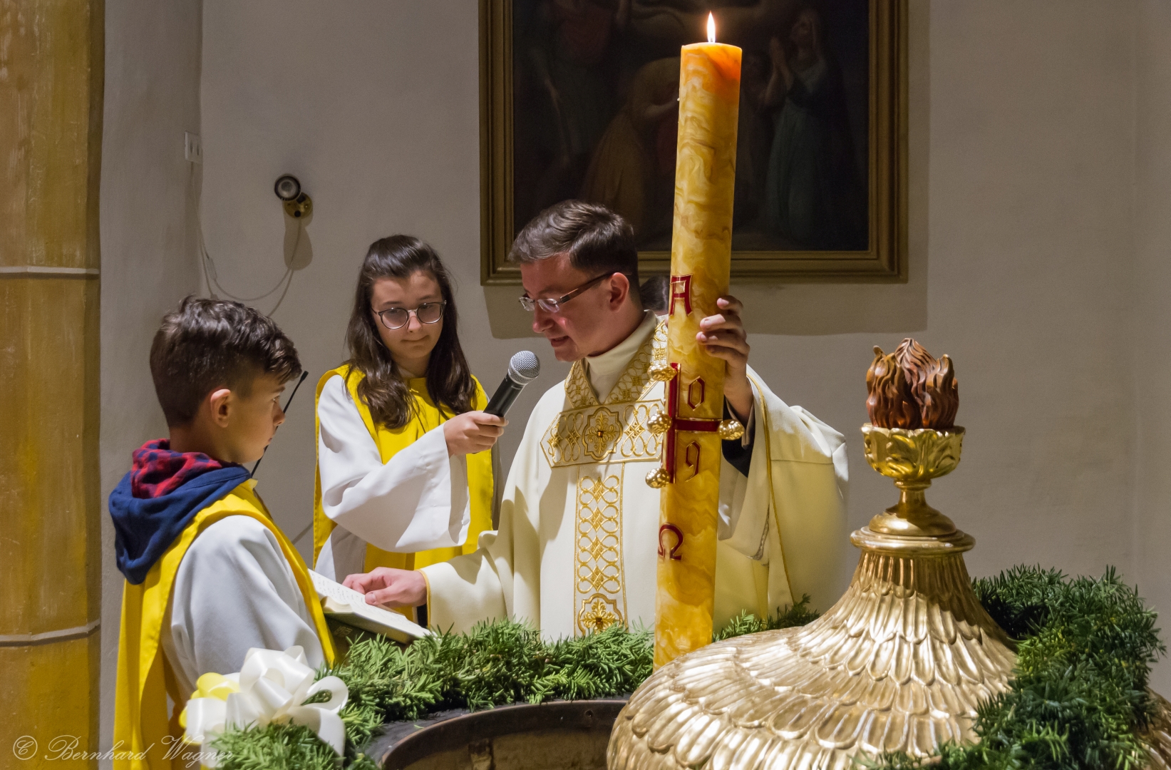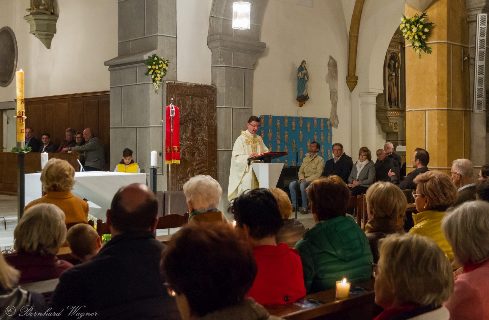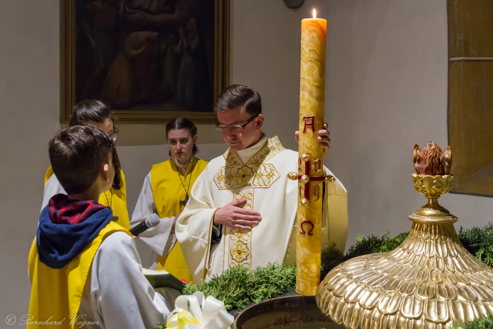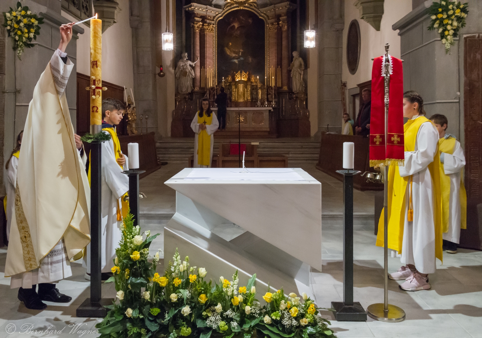 Selbige als dritter Teil der Osternachtliturgie begann mit einer Prozession von Provisor Kranicki und den Ministranten durch das Hauptschiff der Kirche hin zum Portal und von dort das nördliche Seitenschiff entlang zur Seitenkapelle neben dem Eingang zur Turmkapelle wo sich das Taufbecken befindet welches bereits geöffnet und mit Wasser gefüllt war. Derweil wurde die Allerheiligenlitanei gesungen. Es folgten die Segensworte zur Segnung des Wassers und das eindrucksvolle Eintauchen der mitgeführten Osterkerze in das gesegnete Wasser. Dabei spricht der Priester „Durch deinen geliebten Sohn steige herab in dieses Wasser die Kraft des Heiligen Geistes“. Daraufhin erneuerte man das Taufversprechen und beim Lied „Fest soll mein Taufbund immer stehn“ ging der Provisor durch die Kirche um die Gläubigen mit Weihwasser zu besprengen.