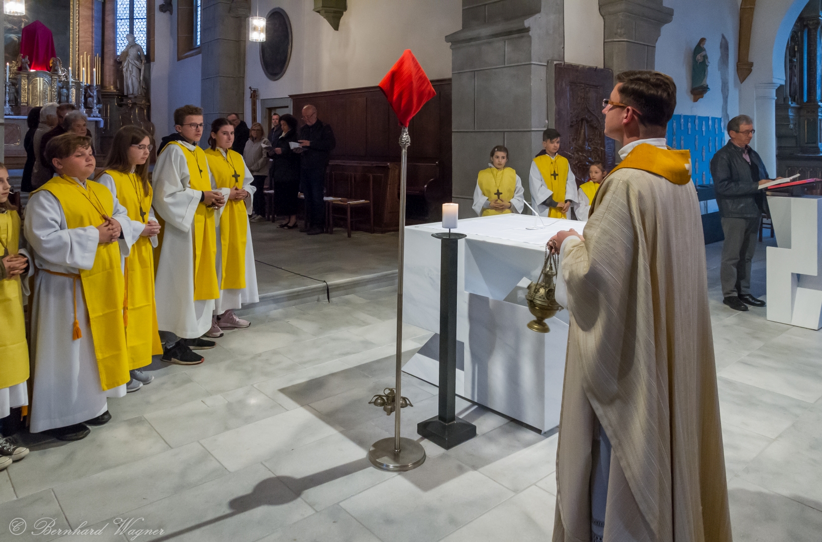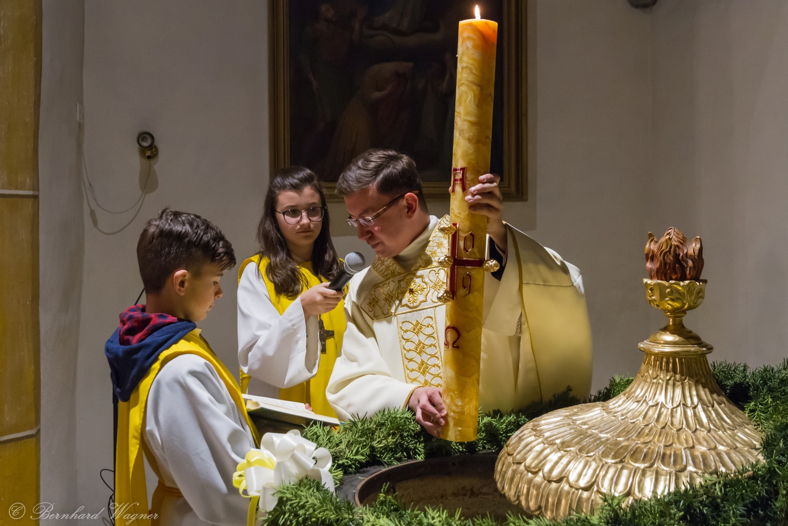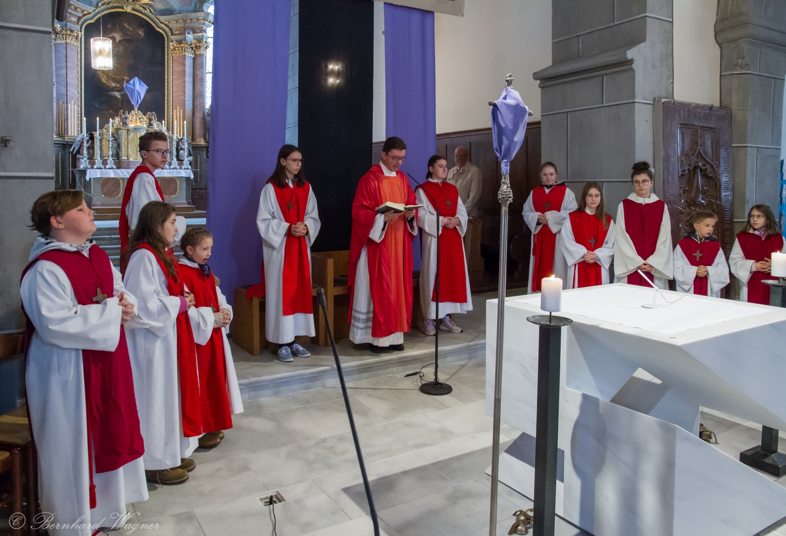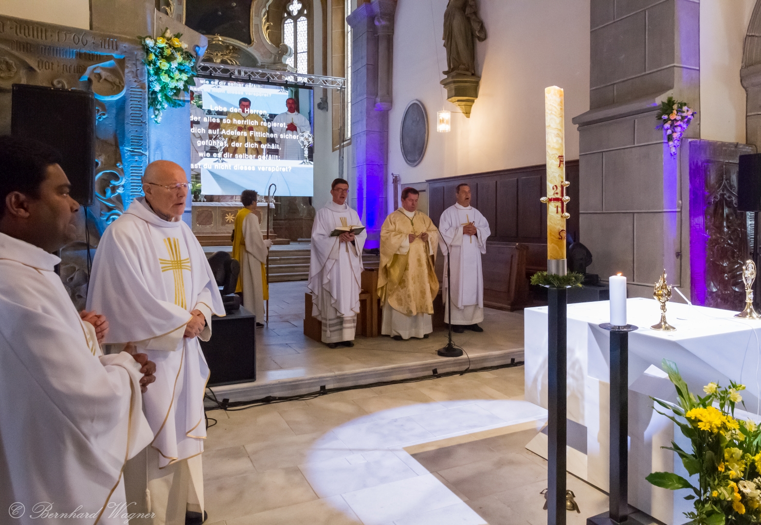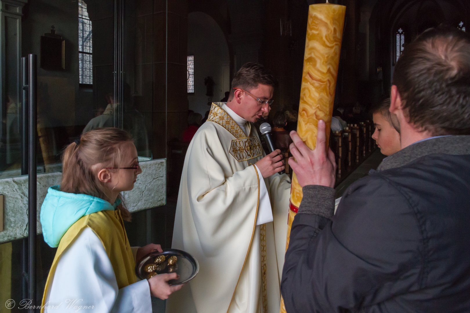 Selbige als dritter Teil der Osternachtliturgie begann mit einer Prozession von Provisor Kranicki und den Ministranten durch das Hauptschiff der Kirche hin zum Portal und von dort das nördliche Seitenschiff entlang zur Seitenkapelle neben dem Eingang zur Turmkapelle wo sich das Taufbecken befindet welches bereits geöffnet und mit Wasser gefüllt war. Derweil wurde die Allerheiligenlitanei gesungen. Es folgten die Segensworte zur Segnung des Wassers und das eindrucksvolle Eintauchen der mitgeführten Osterkerze in das gesegnete Wasser. Dabei spricht der Priester „Durch deinen geliebten Sohn steige herab in dieses Wasser die Kraft des Heiligen Geistes“. Daraufhin erneuerte man das Taufversprechen und beim Lied „Fest soll mein Taufbund immer stehn“ ging der Provisor durch die Kirche um die Gläubigen mit Weihwasser zu besprengen.