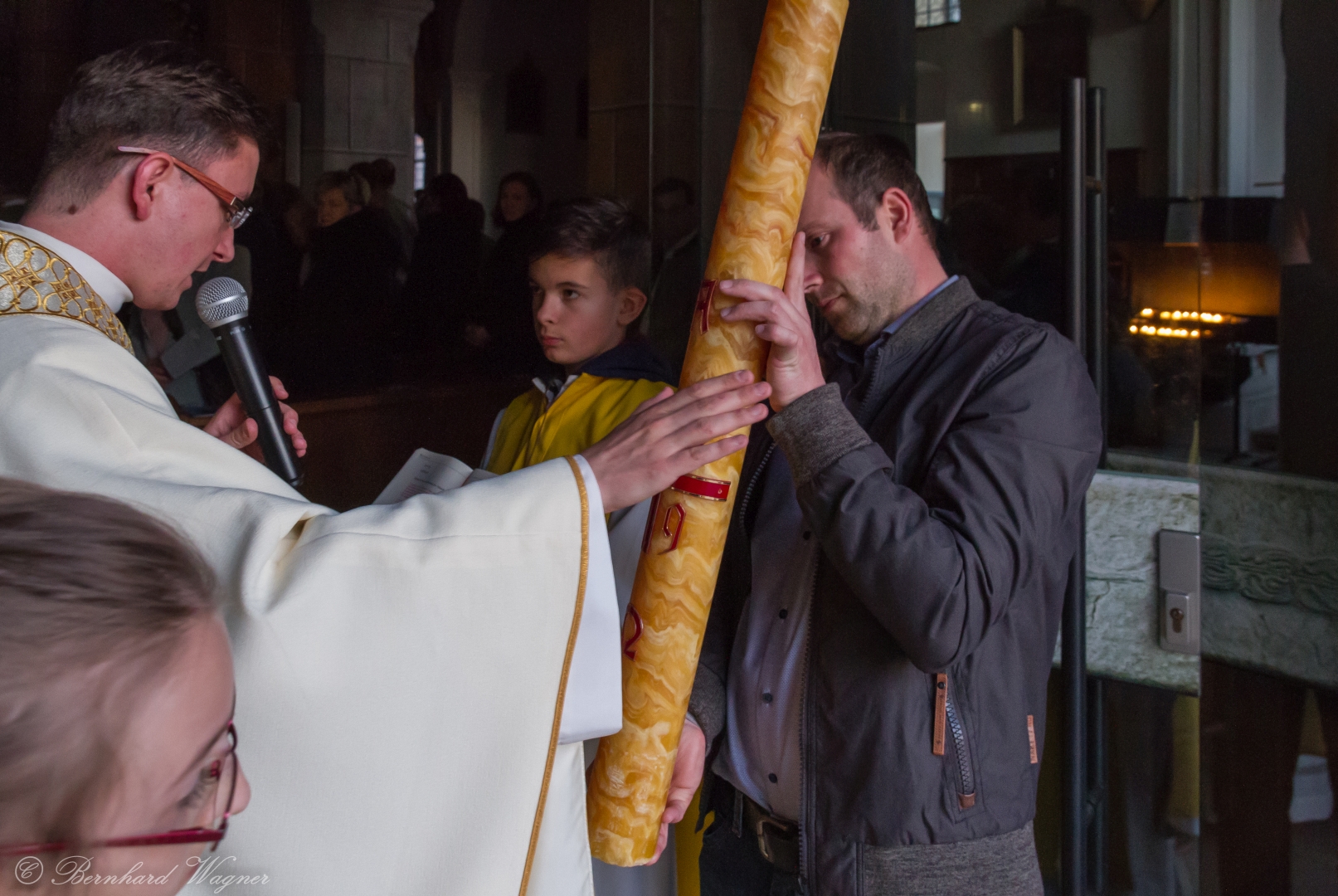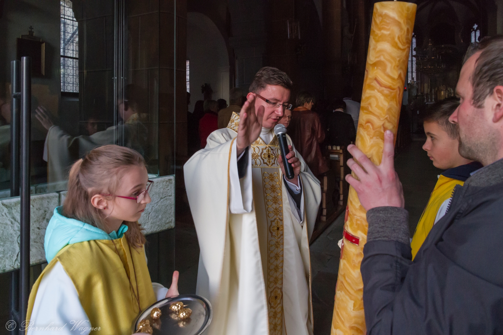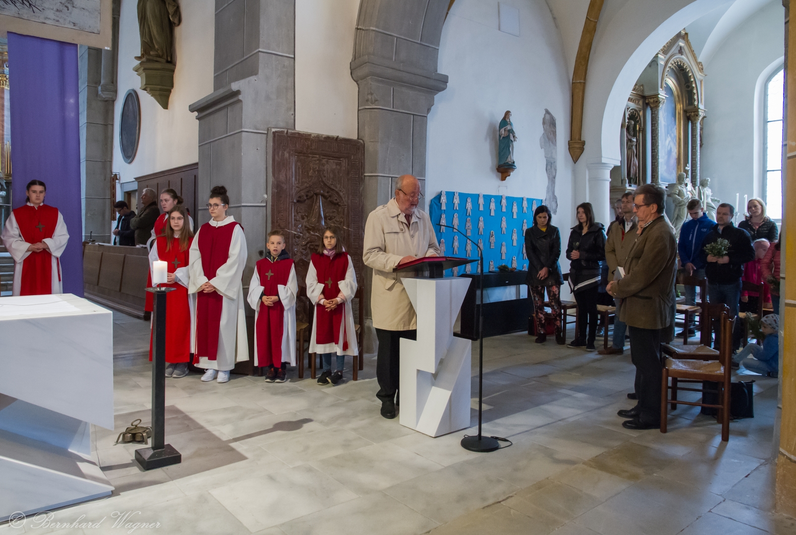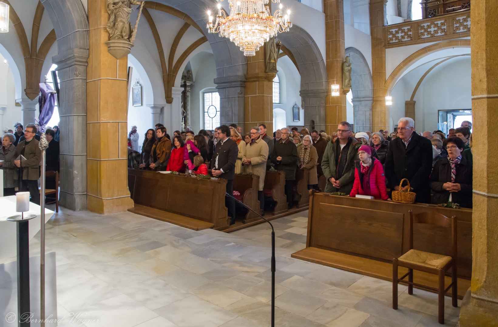 Selbige als dritter Teil der Osternachtliturgie begann mit einer Prozession von Provisor Kranicki und den Ministranten durch das Hauptschiff der Kirche hin zum Portal und von dort das nördliche Seitenschiff entlang zur Seitenkapelle neben dem Eingang zur Turmkapelle wo sich das Taufbecken befindet welches bereits geöffnet und mit Wasser gefüllt war. Derweil wurde die Allerheiligenlitanei gesungen. Es folgten die Segensworte zur Segnung des Wassers und das eindrucksvolle Eintauchen der mitgeführten Osterkerze in das gesegnete Wasser. Dabei spricht der Priester „Durch deinen geliebten Sohn steige herab in dieses Wasser die Kraft des Heiligen Geistes“. Daraufhin erneuerte man das Taufversprechen und beim Lied „Fest soll mein Taufbund immer stehn“ ging der Provisor durch die Kirche um die Gläubigen mit Weihwasser zu besprengen.
