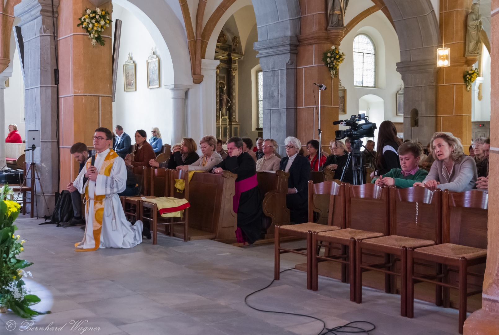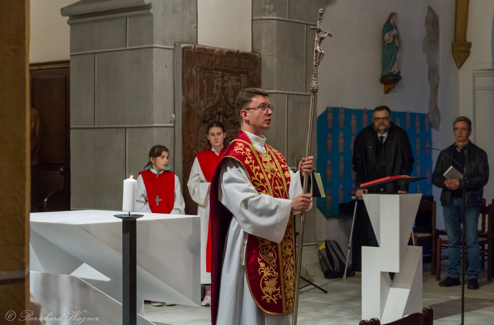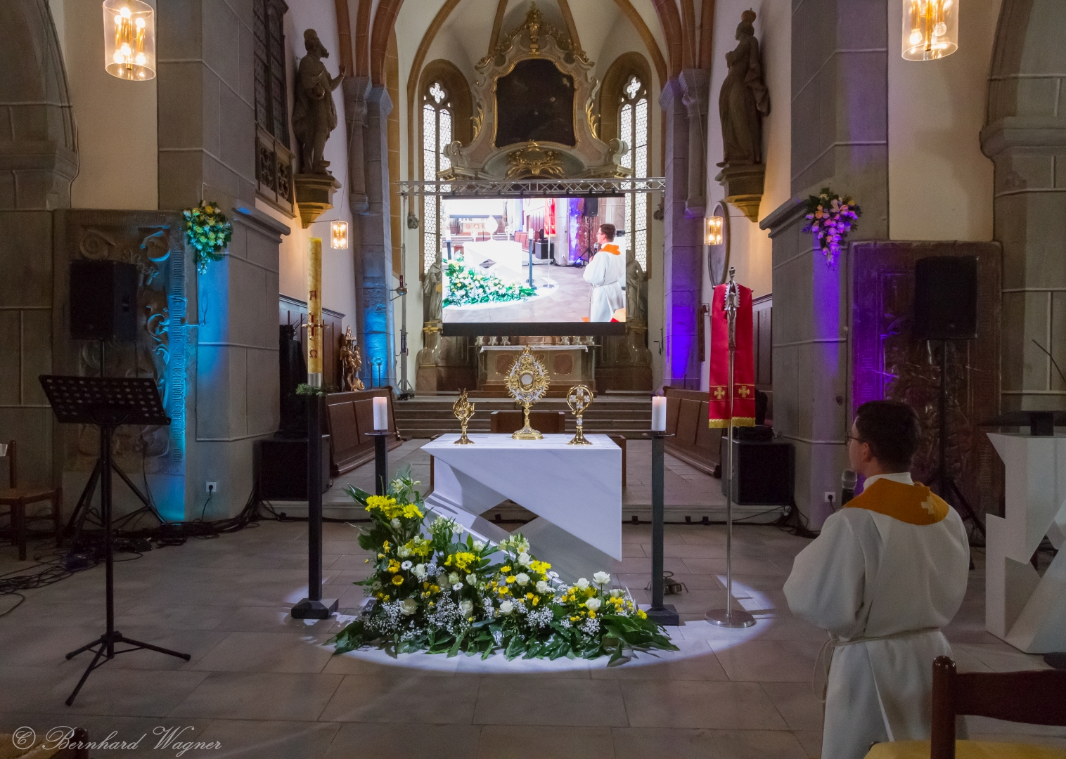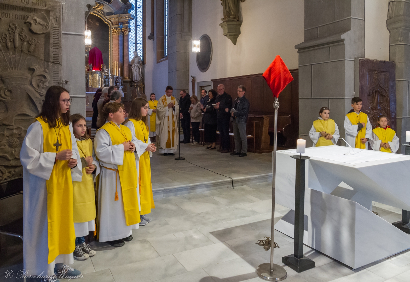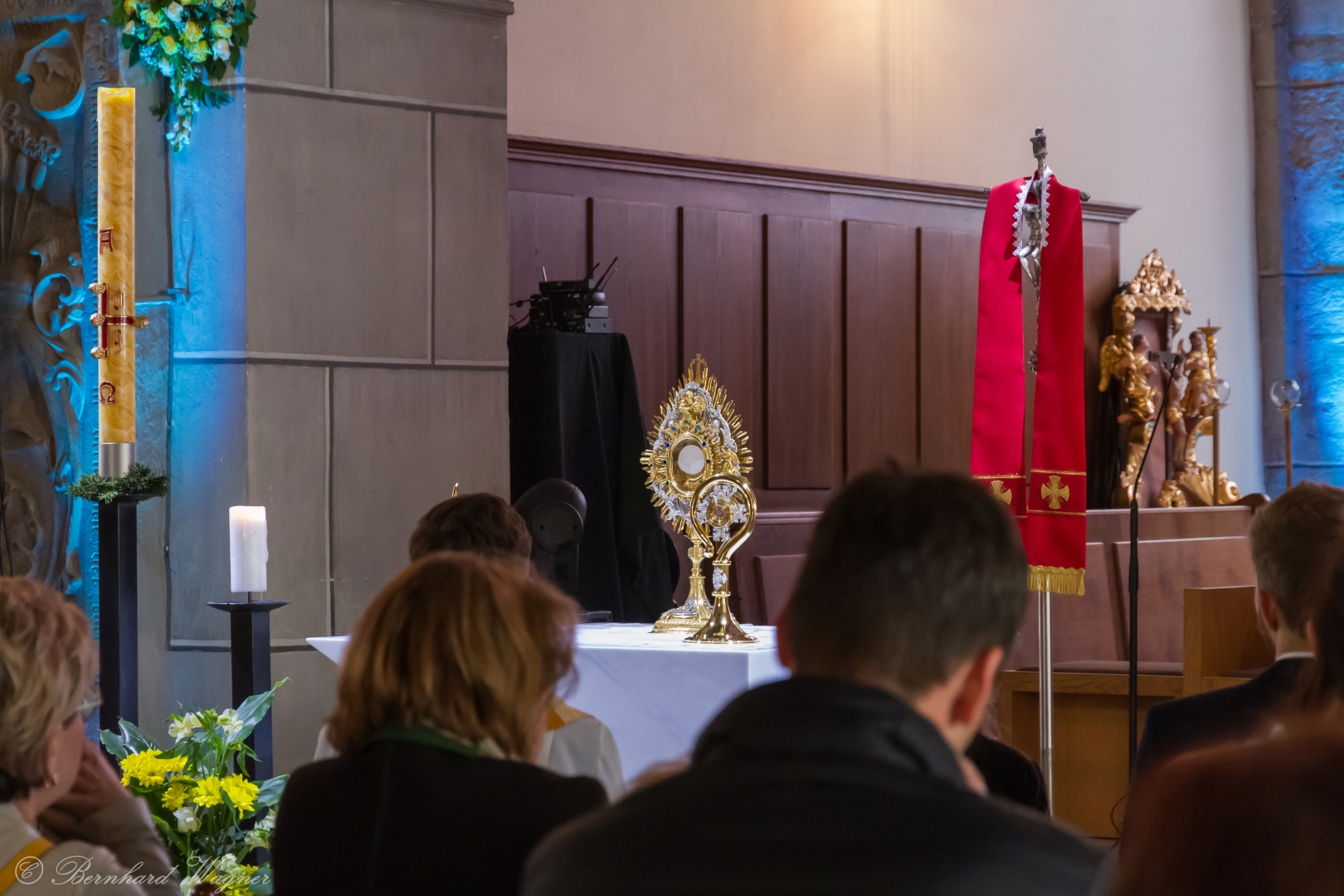 Selbige als dritter Teil der Osternachtliturgie begann mit einer Prozession von Provisor Kranicki und den Ministranten durch das Hauptschiff der Kirche hin zum Portal und von dort das nördliche Seitenschiff entlang zur Seitenkapelle neben dem Eingang zur Turmkapelle wo sich das Taufbecken befindet welches bereits geöffnet und mit Wasser gefüllt war. Derweil wurde die Allerheiligenlitanei gesungen. Es folgten die Segensworte zur Segnung des Wassers und das eindrucksvolle Eintauchen der mitgeführten Osterkerze in das gesegnete Wasser. Dabei spricht der Priester „Durch deinen geliebten Sohn steige herab in dieses Wasser die Kraft des Heiligen Geistes“. Daraufhin erneuerte man das Taufversprechen und beim Lied „Fest soll mein Taufbund immer stehn“ ging der Provisor durch die Kirche um die Gläubigen mit Weihwasser zu besprengen.