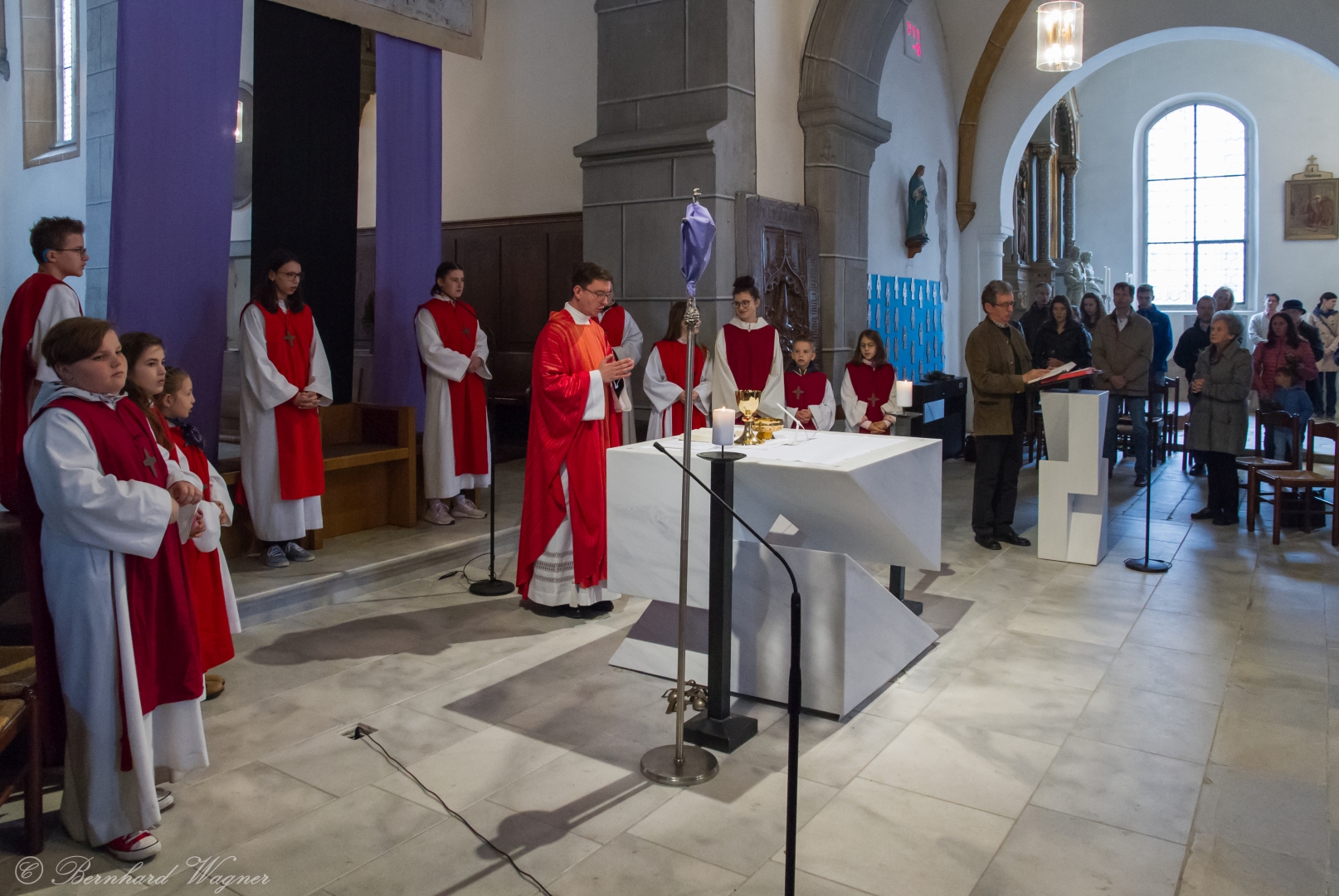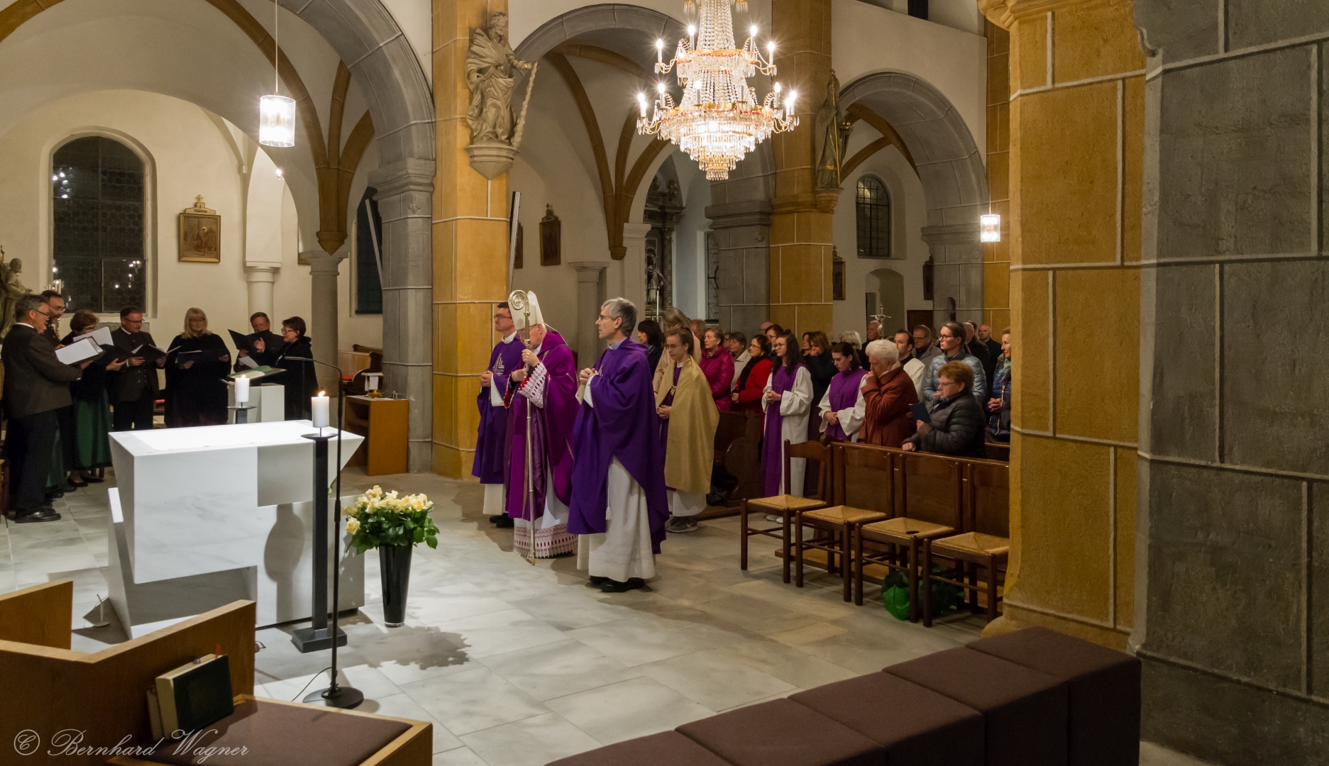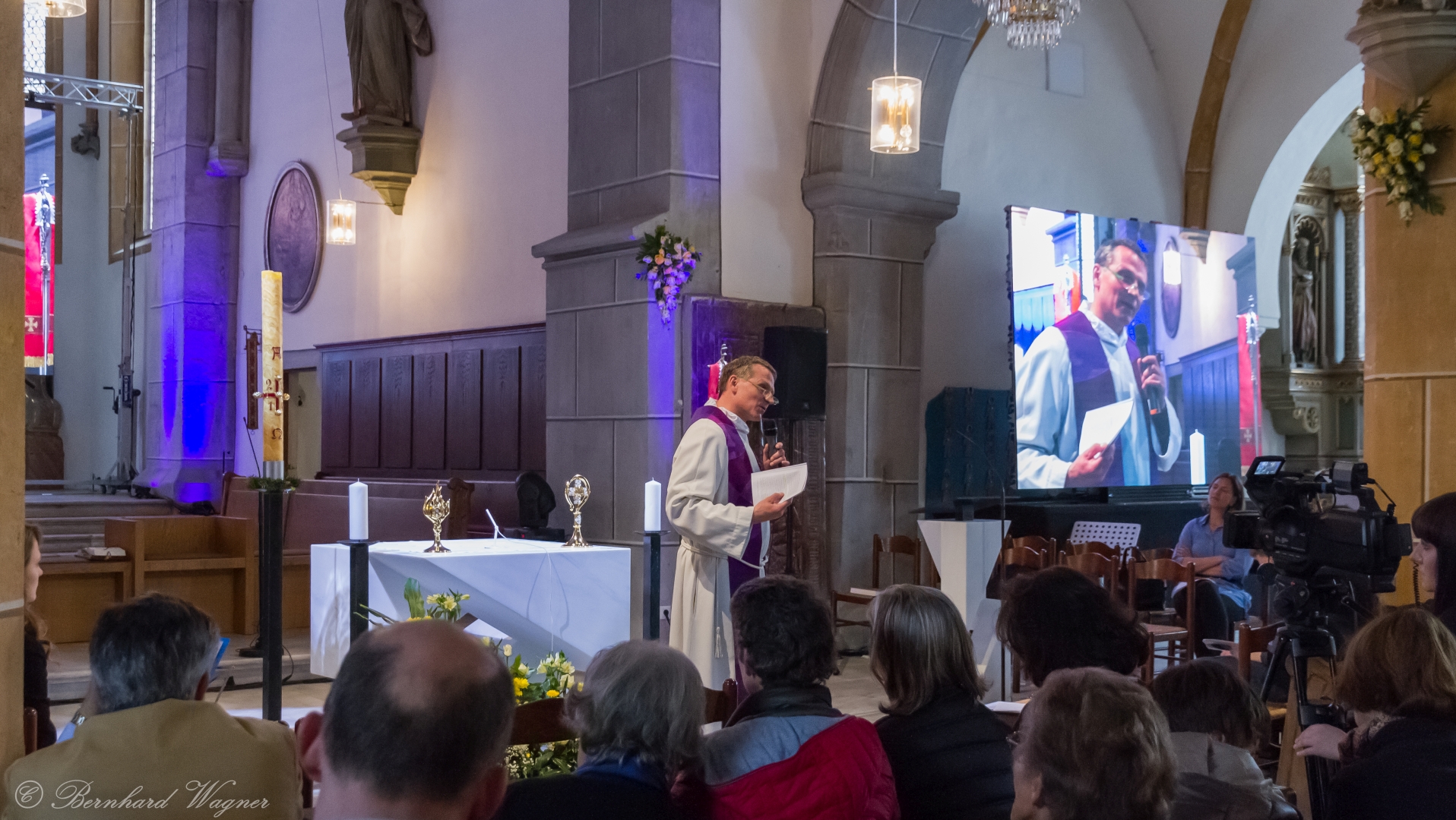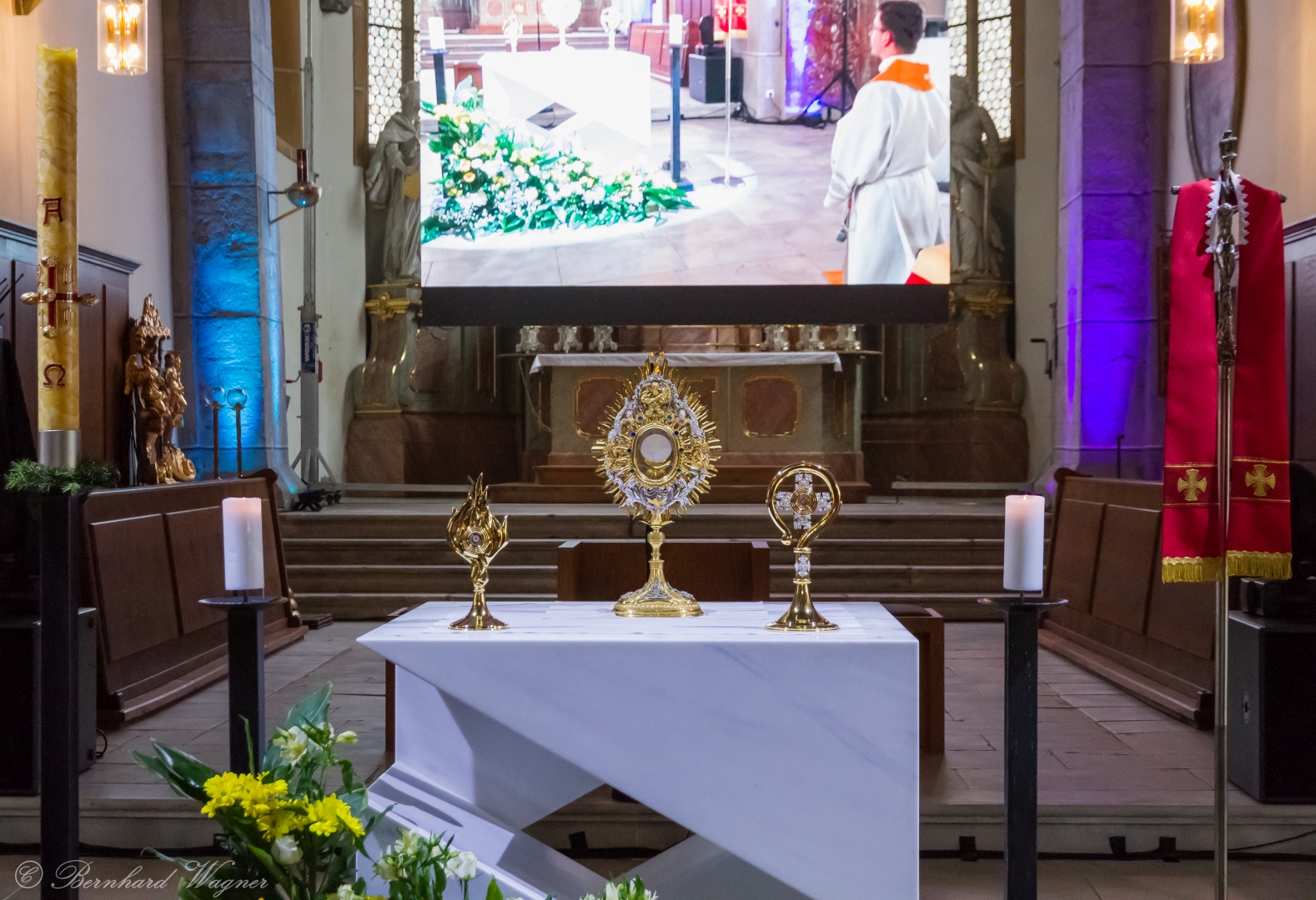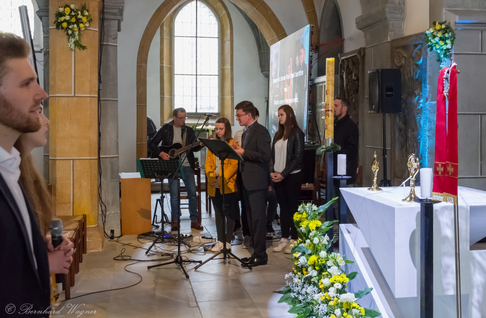 Selbige als dritter Teil der Osternachtliturgie begann mit einer Prozession von Provisor Kranicki und den Ministranten durch das Hauptschiff der Kirche hin zum Portal und von dort das nördliche Seitenschiff entlang zur Seitenkapelle neben dem Eingang zur Turmkapelle wo sich das Taufbecken befindet welches bereits geöffnet und mit Wasser gefüllt war. Derweil wurde die Allerheiligenlitanei gesungen. Es folgten die Segensworte zur Segnung des Wassers und das eindrucksvolle Eintauchen der mitgeführten Osterkerze in das gesegnete Wasser. Dabei spricht der Priester „Durch deinen geliebten Sohn steige herab in dieses Wasser die Kraft des Heiligen Geistes“. Daraufhin erneuerte man das Taufversprechen und beim Lied „Fest soll mein Taufbund immer stehn“ ging der Provisor durch die Kirche um die Gläubigen mit Weihwasser zu besprengen.