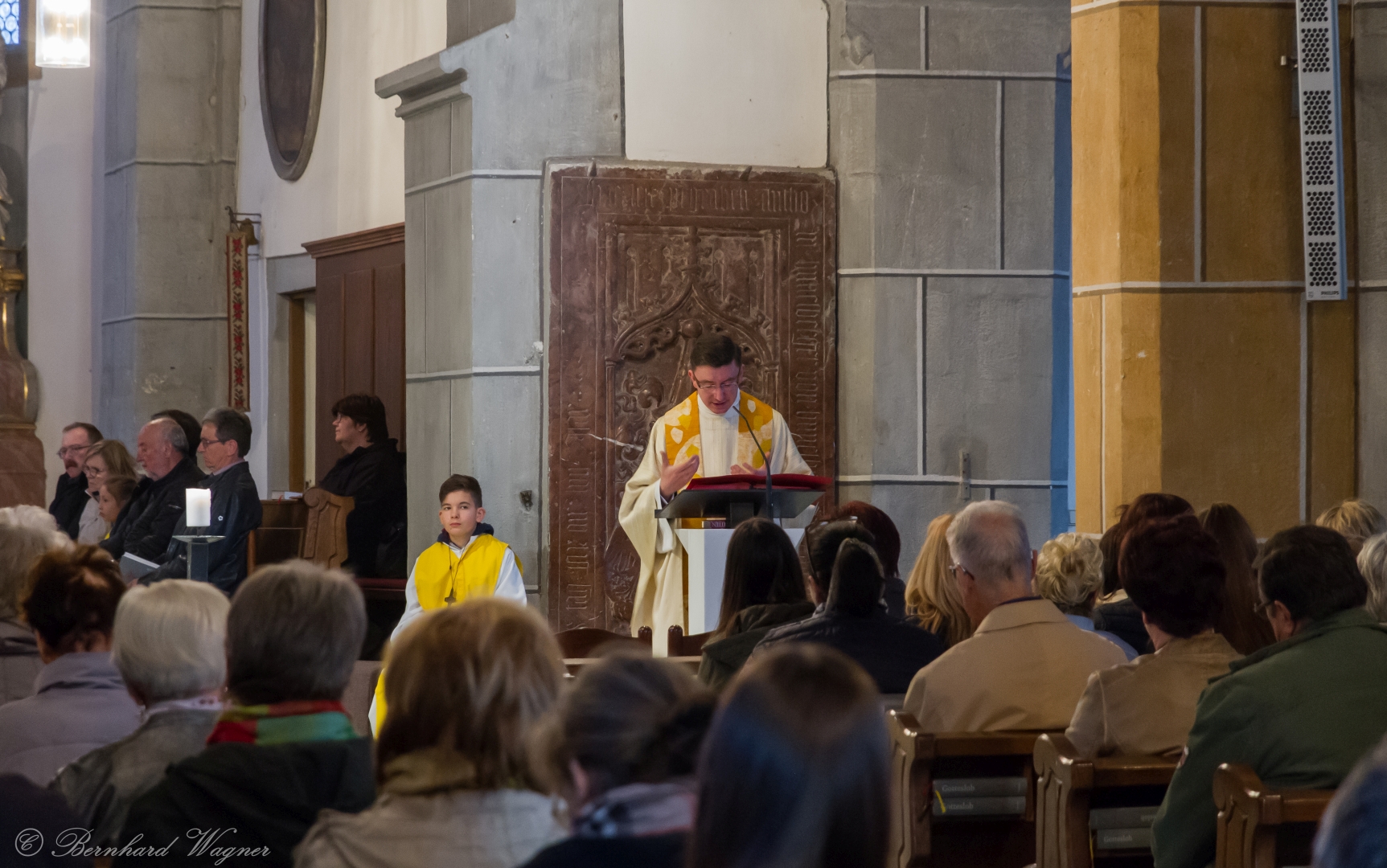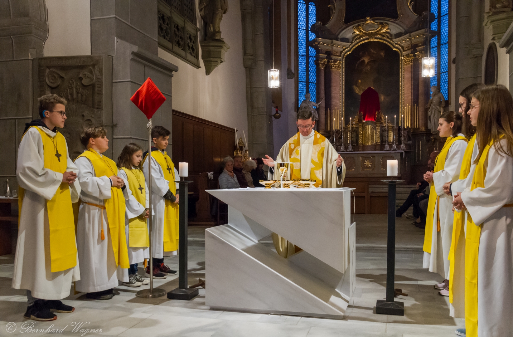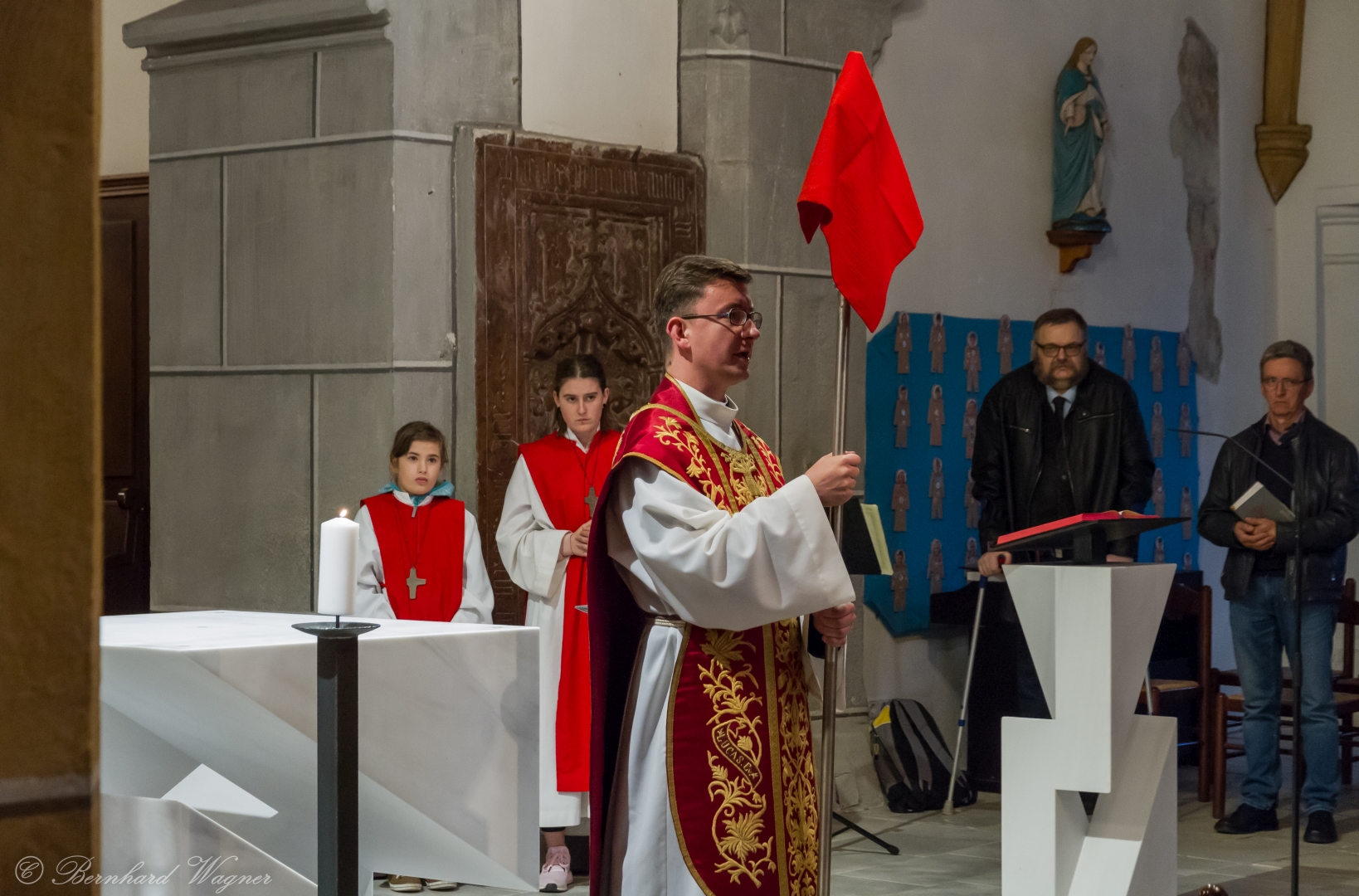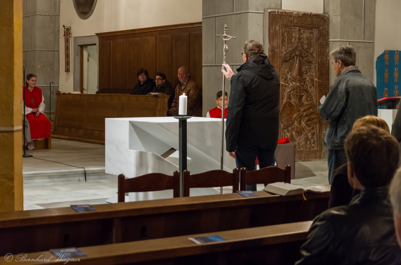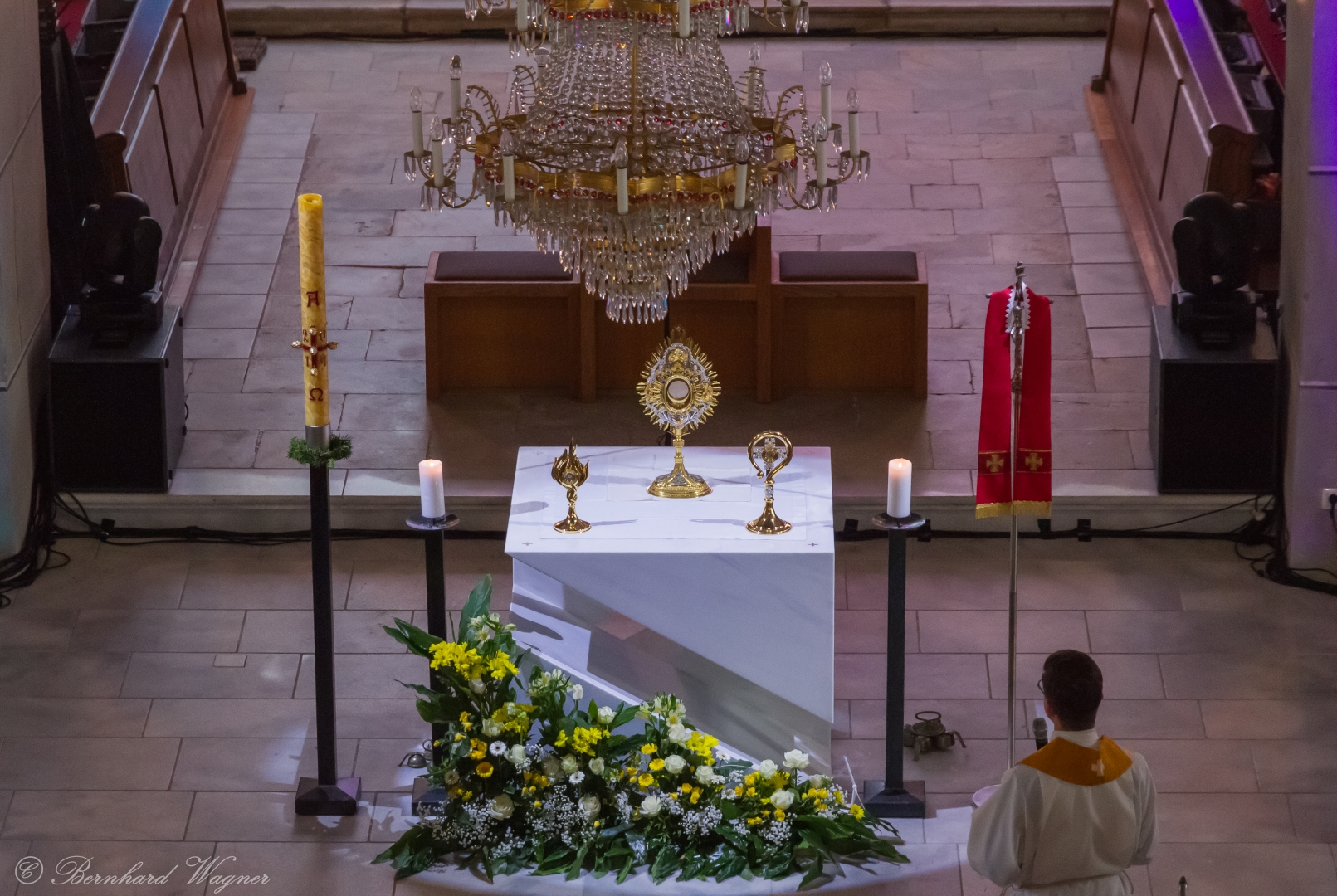 Selbige als dritter Teil der Osternachtliturgie begann mit einer Prozession von Provisor Kranicki und den Ministranten durch das Hauptschiff der Kirche hin zum Portal und von dort das nördliche Seitenschiff entlang zur Seitenkapelle neben dem Eingang zur Turmkapelle wo sich das Taufbecken befindet welches bereits geöffnet und mit Wasser gefüllt war. Derweil wurde die Allerheiligenlitanei gesungen. Es folgten die Segensworte zur Segnung des Wassers und das eindrucksvolle Eintauchen der mitgeführten Osterkerze in das gesegnete Wasser. Dabei spricht der Priester „Durch deinen geliebten Sohn steige herab in dieses Wasser die Kraft des Heiligen Geistes“. Daraufhin erneuerte man das Taufversprechen und beim Lied „Fest soll mein Taufbund immer stehn“ ging der Provisor durch die Kirche um die Gläubigen mit Weihwasser zu besprengen.