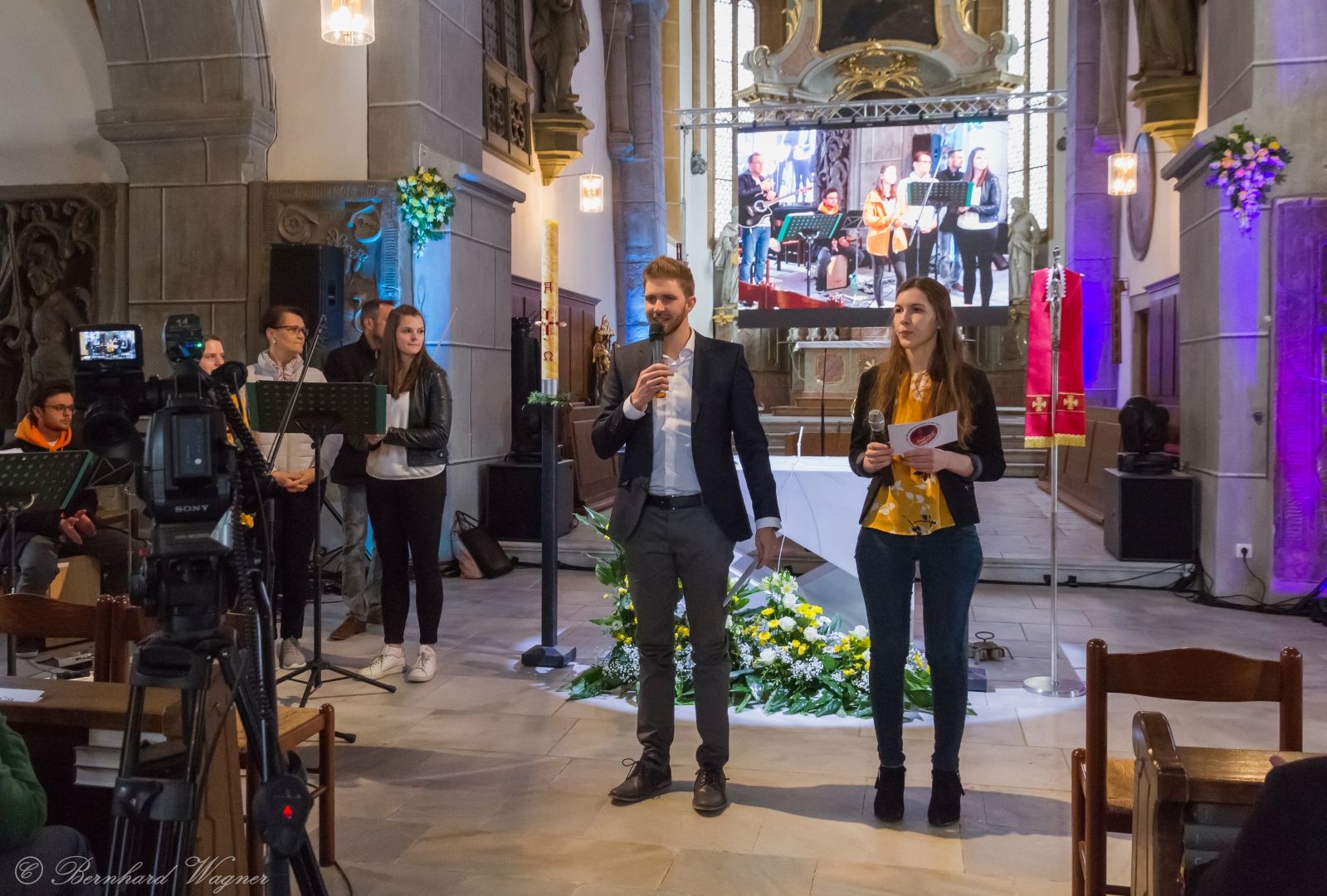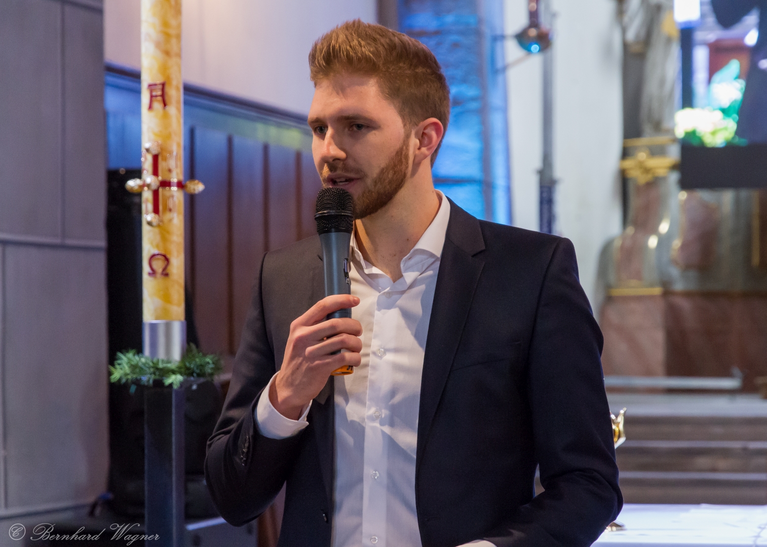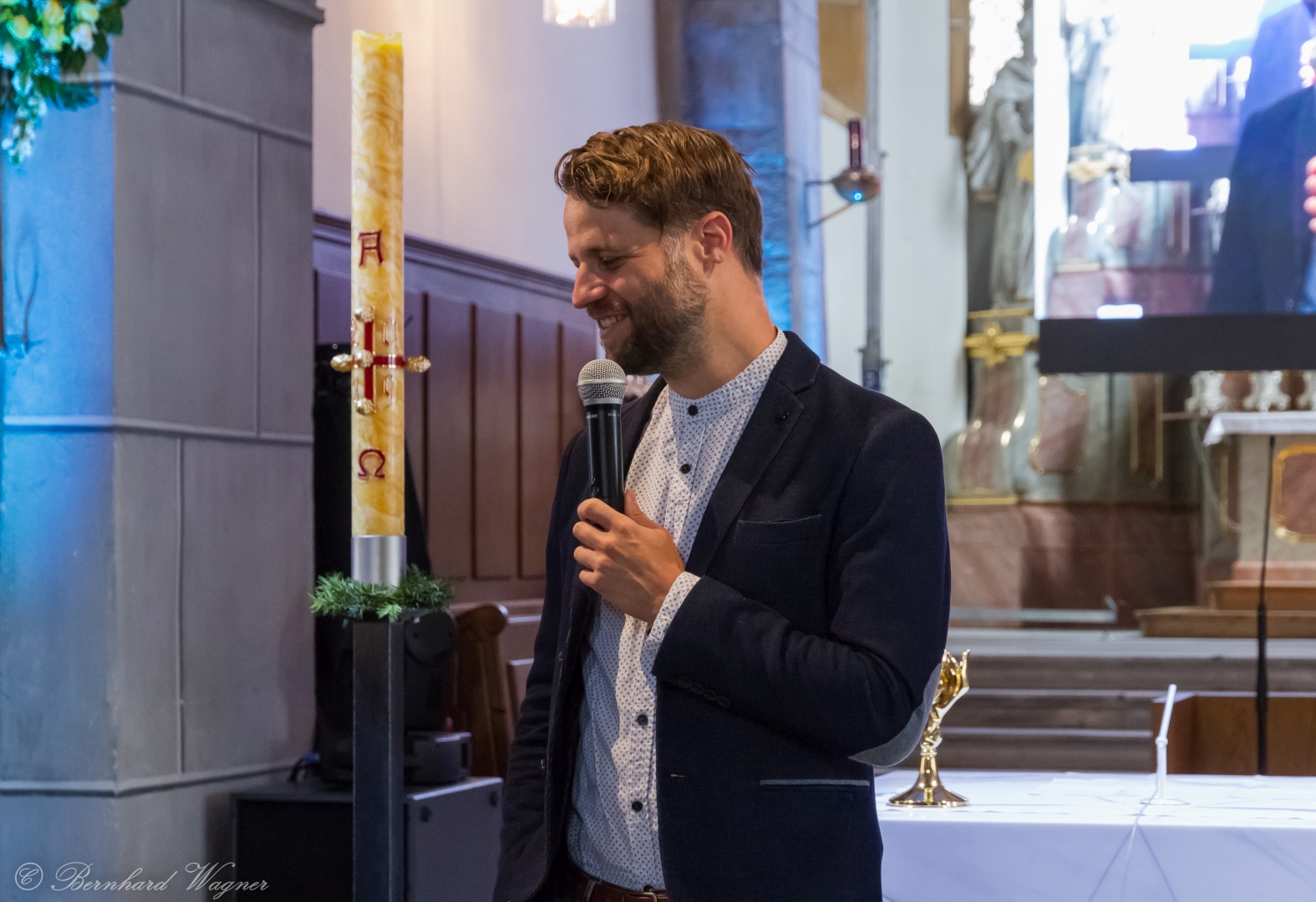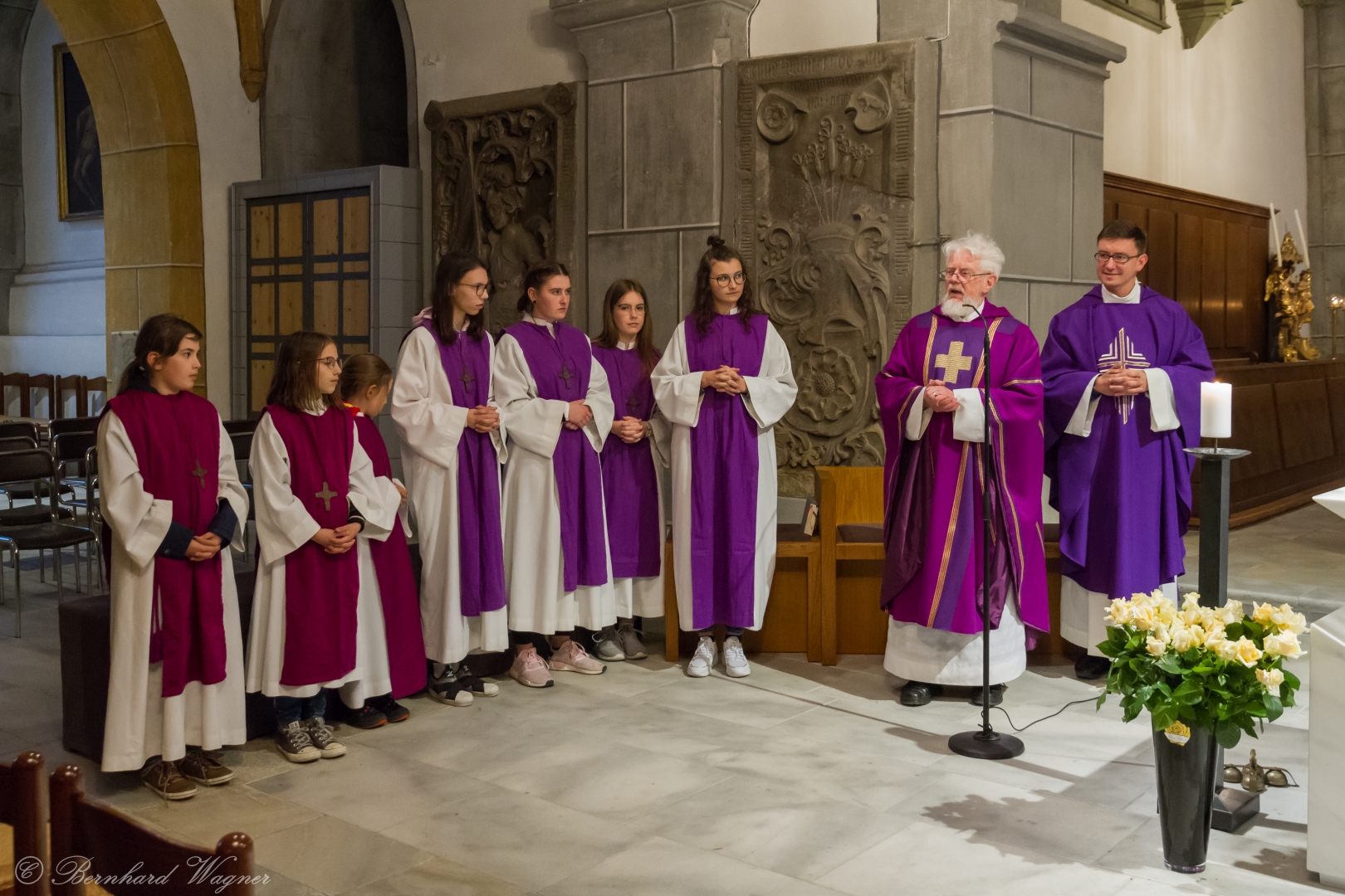 Selbige als dritter Teil der Osternachtliturgie begann mit einer Prozession von Provisor Kranicki und den Ministranten durch das Hauptschiff der Kirche hin zum Portal und von dort das nördliche Seitenschiff entlang zur Seitenkapelle neben dem Eingang zur Turmkapelle wo sich das Taufbecken befindet welches bereits geöffnet und mit Wasser gefüllt war. Derweil wurde die Allerheiligenlitanei gesungen. Es folgten die Segensworte zur Segnung des Wassers und das eindrucksvolle Eintauchen der mitgeführten Osterkerze in das gesegnete Wasser. Dabei spricht der Priester „Durch deinen geliebten Sohn steige herab in dieses Wasser die Kraft des Heiligen Geistes“. Daraufhin erneuerte man das Taufversprechen und beim Lied „Fest soll mein Taufbund immer stehn“ ging der Provisor durch die Kirche um die Gläubigen mit Weihwasser zu besprengen.