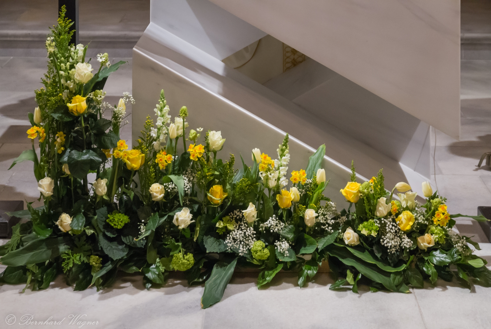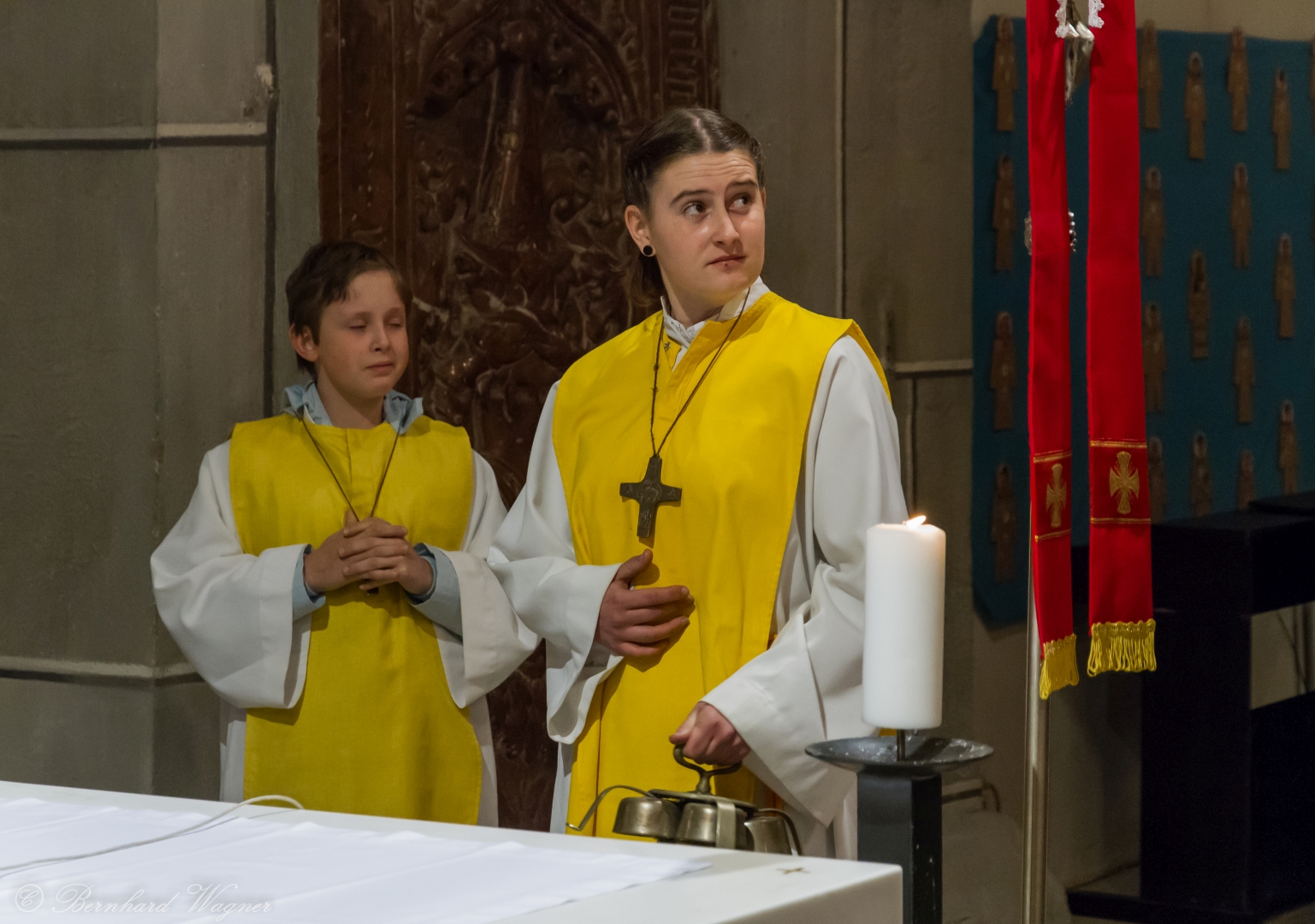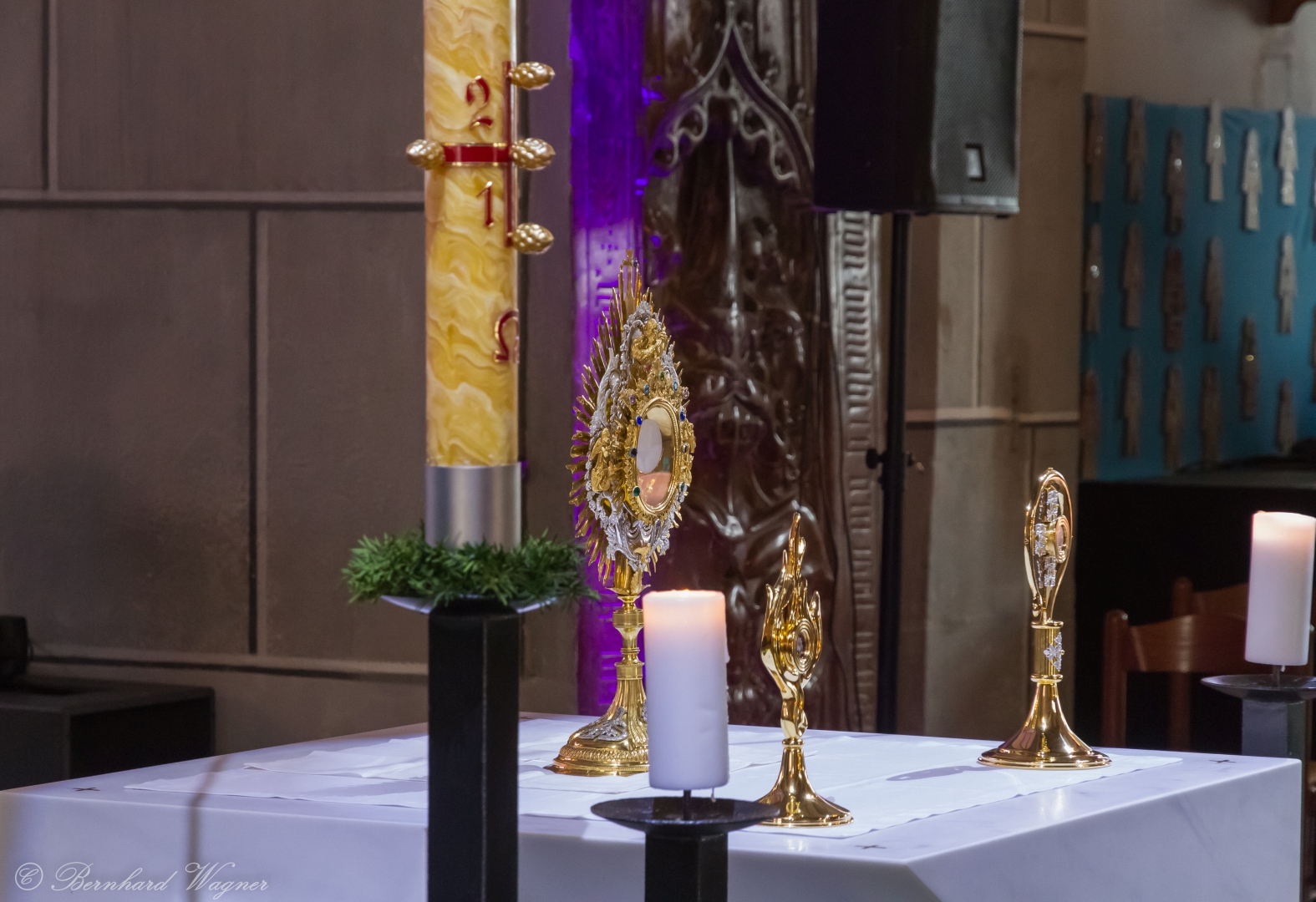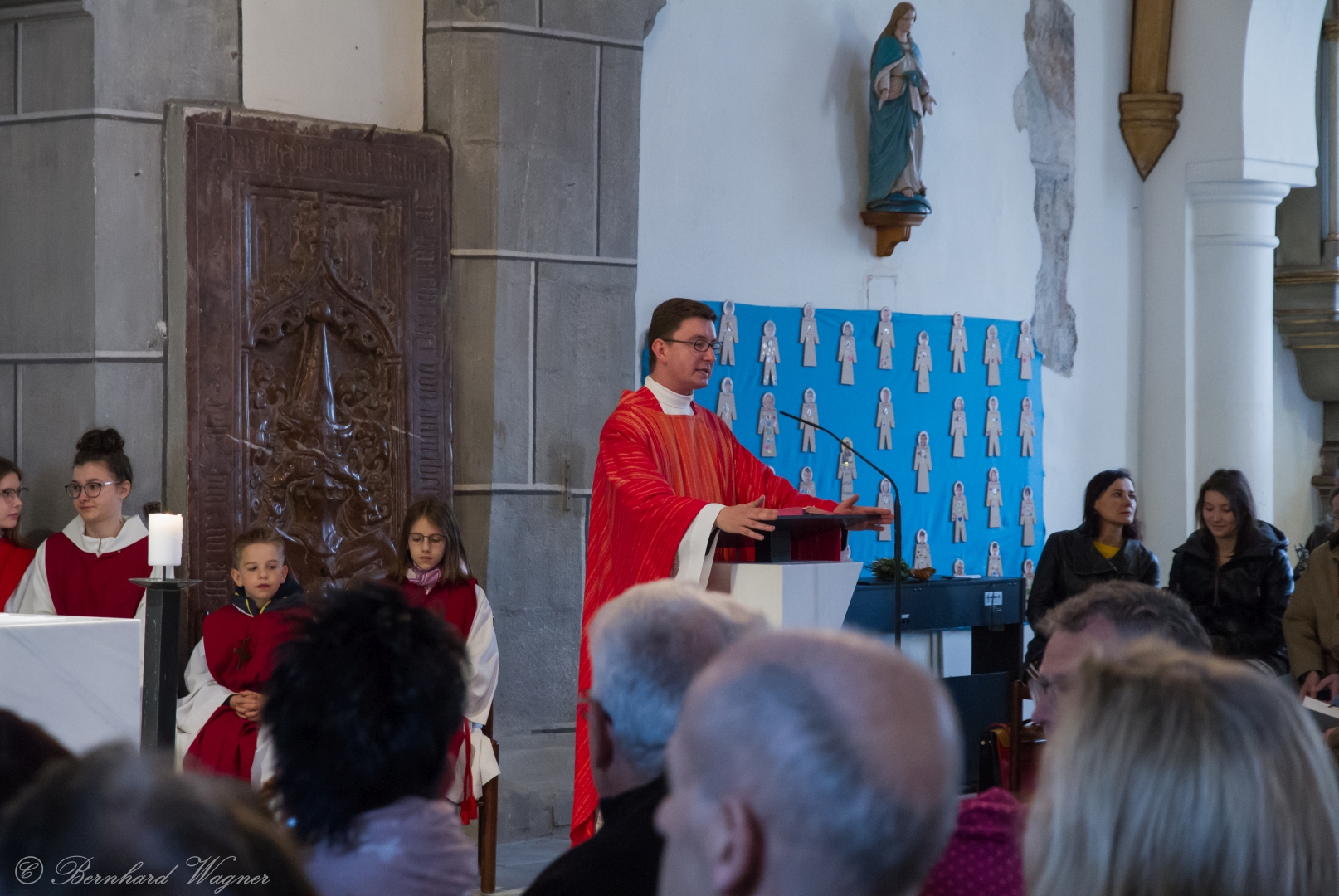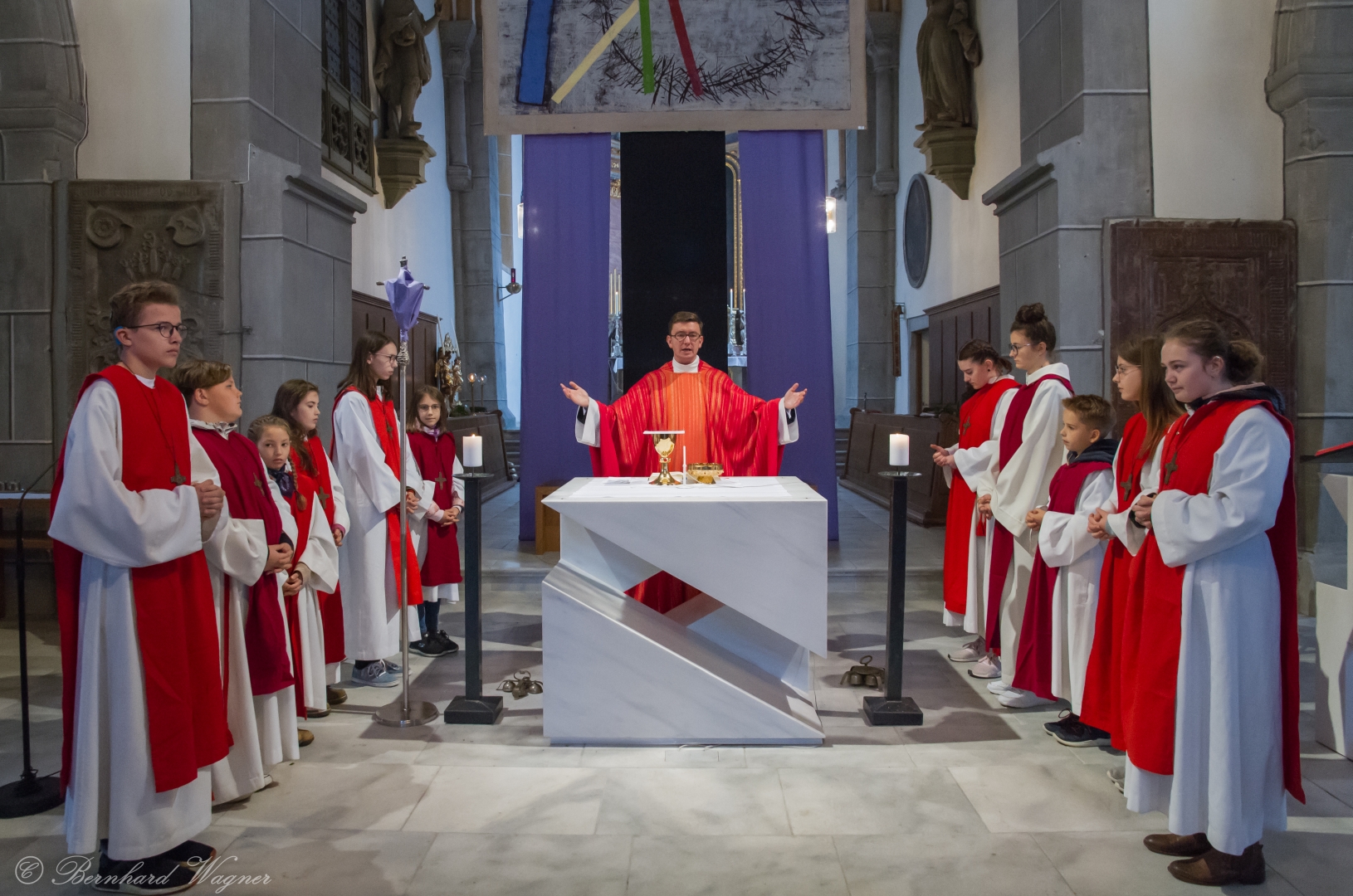 Selbige als dritter Teil der Osternachtliturgie begann mit einer Prozession von Provisor Kranicki und den Ministranten durch das Hauptschiff der Kirche hin zum Portal und von dort das nördliche Seitenschiff entlang zur Seitenkapelle neben dem Eingang zur Turmkapelle wo sich das Taufbecken befindet welches bereits geöffnet und mit Wasser gefüllt war. Derweil wurde die Allerheiligenlitanei gesungen. Es folgten die Segensworte zur Segnung des Wassers und das eindrucksvolle Eintauchen der mitgeführten Osterkerze in das gesegnete Wasser. Dabei spricht der Priester „Durch deinen geliebten Sohn steige herab in dieses Wasser die Kraft des Heiligen Geistes“. Daraufhin erneuerte man das Taufversprechen und beim Lied „Fest soll mein Taufbund immer stehn“ ging der Provisor durch die Kirche um die Gläubigen mit Weihwasser zu besprengen.