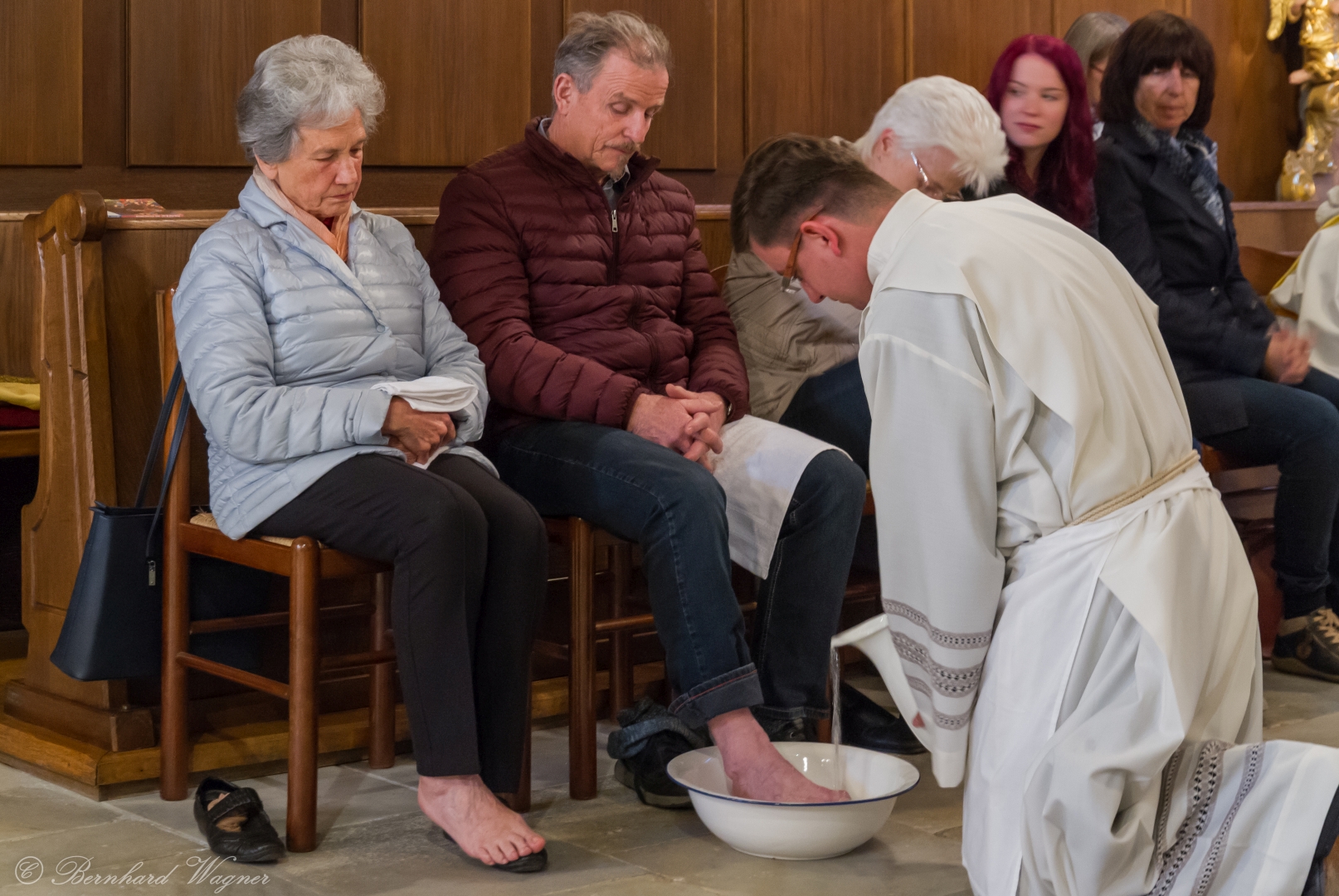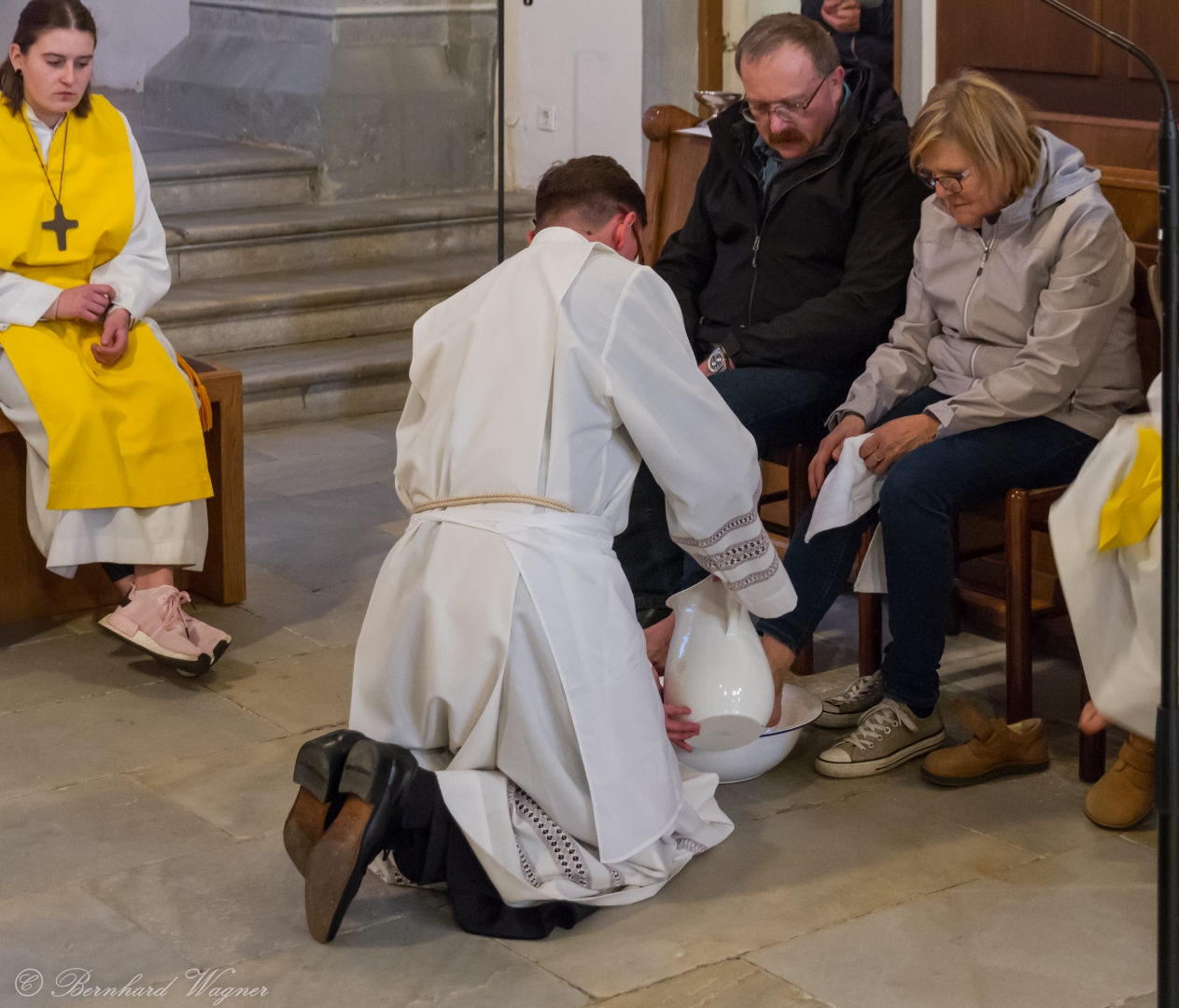 Im Anschluss fand im Presbyterium der Kirche eine symbolische Fußwaschung an zwölf Personen der Pfarre statt, es waren dies Pfarrgemeinderätinnen und Pfarrgemeinderäte, Lektorinnen und Lektoren sowie zwei Ministrantinnen, entsprechend den zwölf Jüngern. Dieser bei uns mittlerweile schon seit langem übliche Ritus erinnert die Gemeinde an jene Fußwaschung, die Jesus im Abendmahlsaal vollzog.