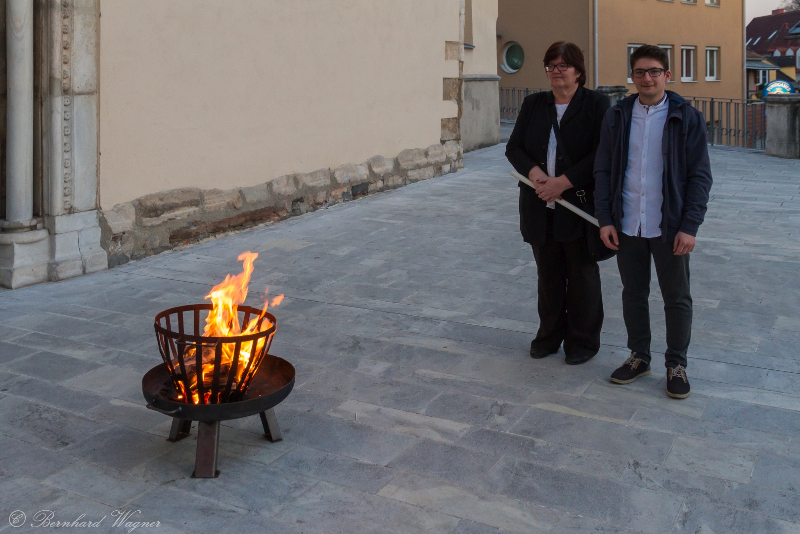 Einige Minuten vor Beginn der Liturgie fanden sich Pfarrsekretärin und Pfarrgemeinderätin Frau Claudia Cufer und Pfarrgemeinderat Herr Christian Cufer vor dem Portal der Markuskirche ein um dort in einer Schüssel das neue Osterfeuer zu entfachen. Schließlich kam Provisor Kranicki mit den Ministranten und begrüßte zunächst die versammelte Gemeinde. Es folgte ein feierlicher Eröffnungsritus im Bereich des Portals mit einem Segensgebet zur Segnung des neuen Feuers, einer Ausdeutung der Symbole auf der von Messner Herrn Markus Gaber getragenen Osterkerze (Senkrechter- und Querbalken des Kreuzes, Alpha und Omega sowie Ziffern der Jahreszahl). Darüber hinaus wurden fünf längliche Körper, Weihrauchkörner darstellend und die Wundmale Christi versinnbildlichend, an den entsprechenden Stellen des Kreuzes eingedreht. Daraufhin entzündete der Provisor die Osterkerze am neuen Feuer, zur einfacheren Übernahme benutzte man eine Altarleuchter-Kerze. Dabei wird gesprochen: „Christus ist glorreich auferstanden vom Tod. Sein Licht vertreibe das Dunkel der Herzen“.
