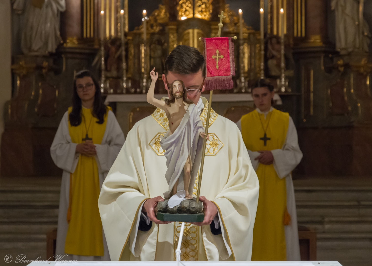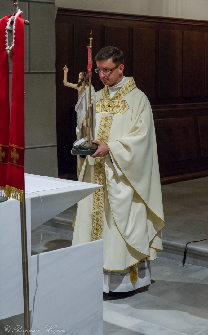 Nach dem Gebet zur dritten Lesung stimmte Provisor Kranicki in festlicher Weise das Gloria der Osternacht an, der gesamte Kirchenraum erhellte sich, der Chorus Paradisi sang das Gloria aus einer Festmesse und gemeinsam mit den Kirchenglocken und dem Läuten der Ministranten verkündete dies gleichsam den Moment der Auferstehung Christi. Alle Anwesenden wurden dabei von großer Osterfreude durchdrungen.