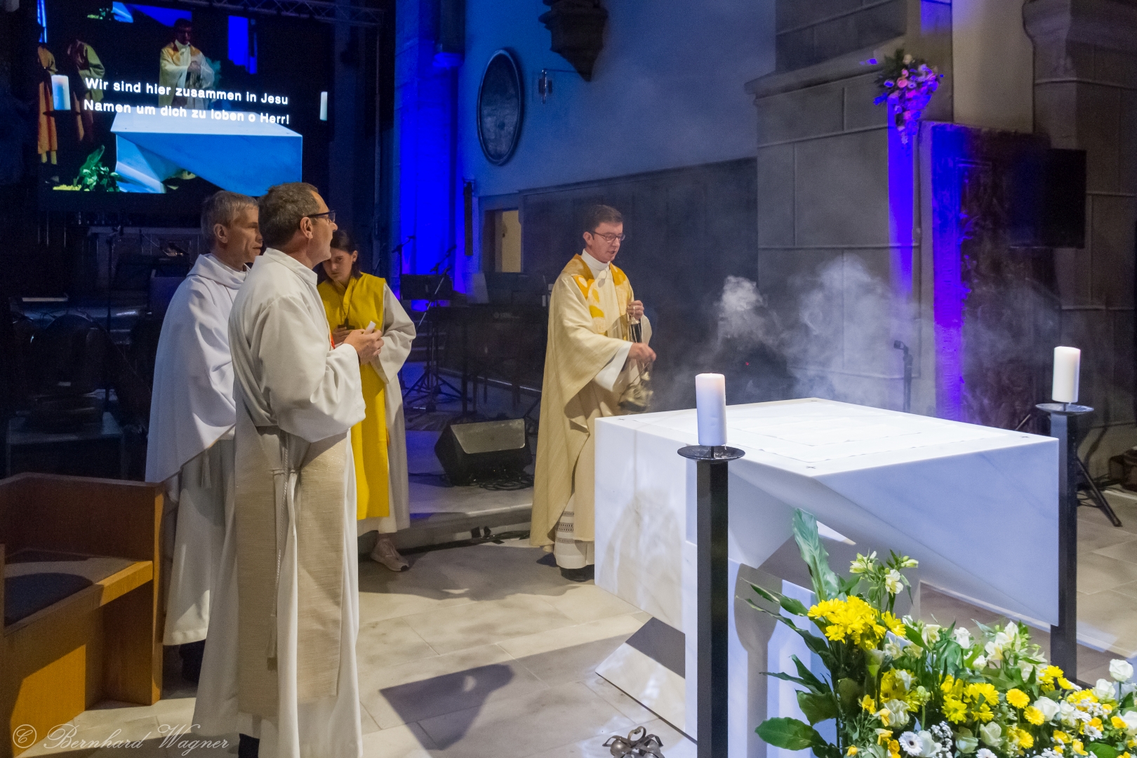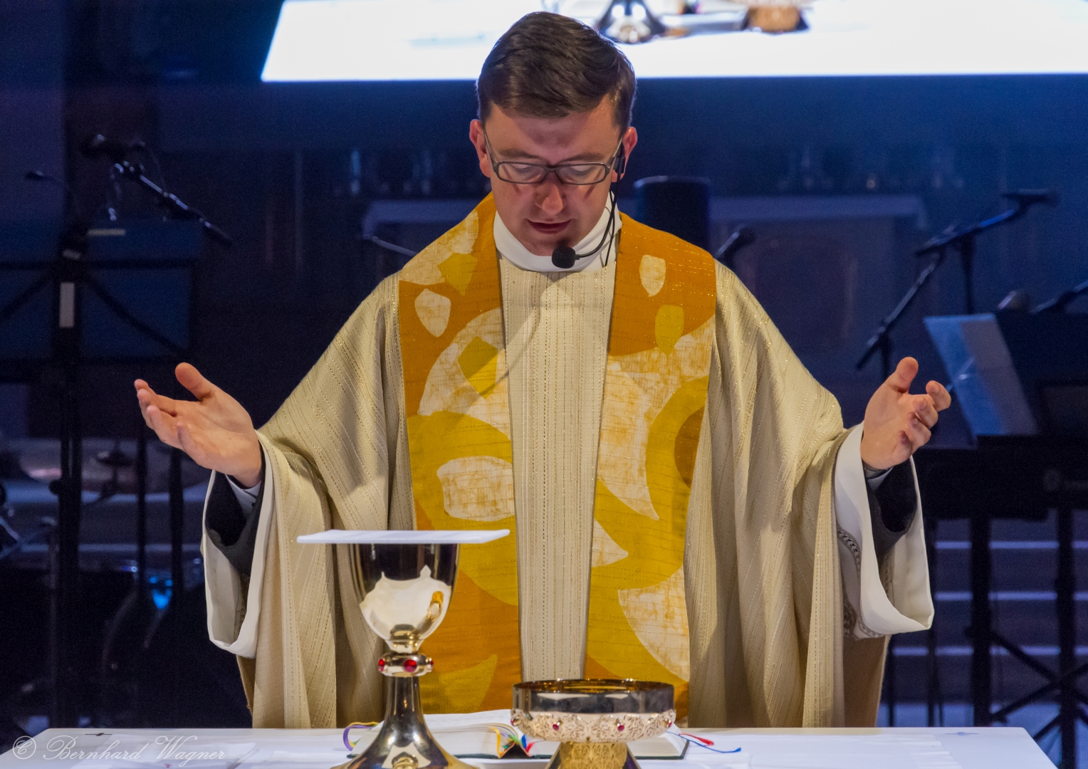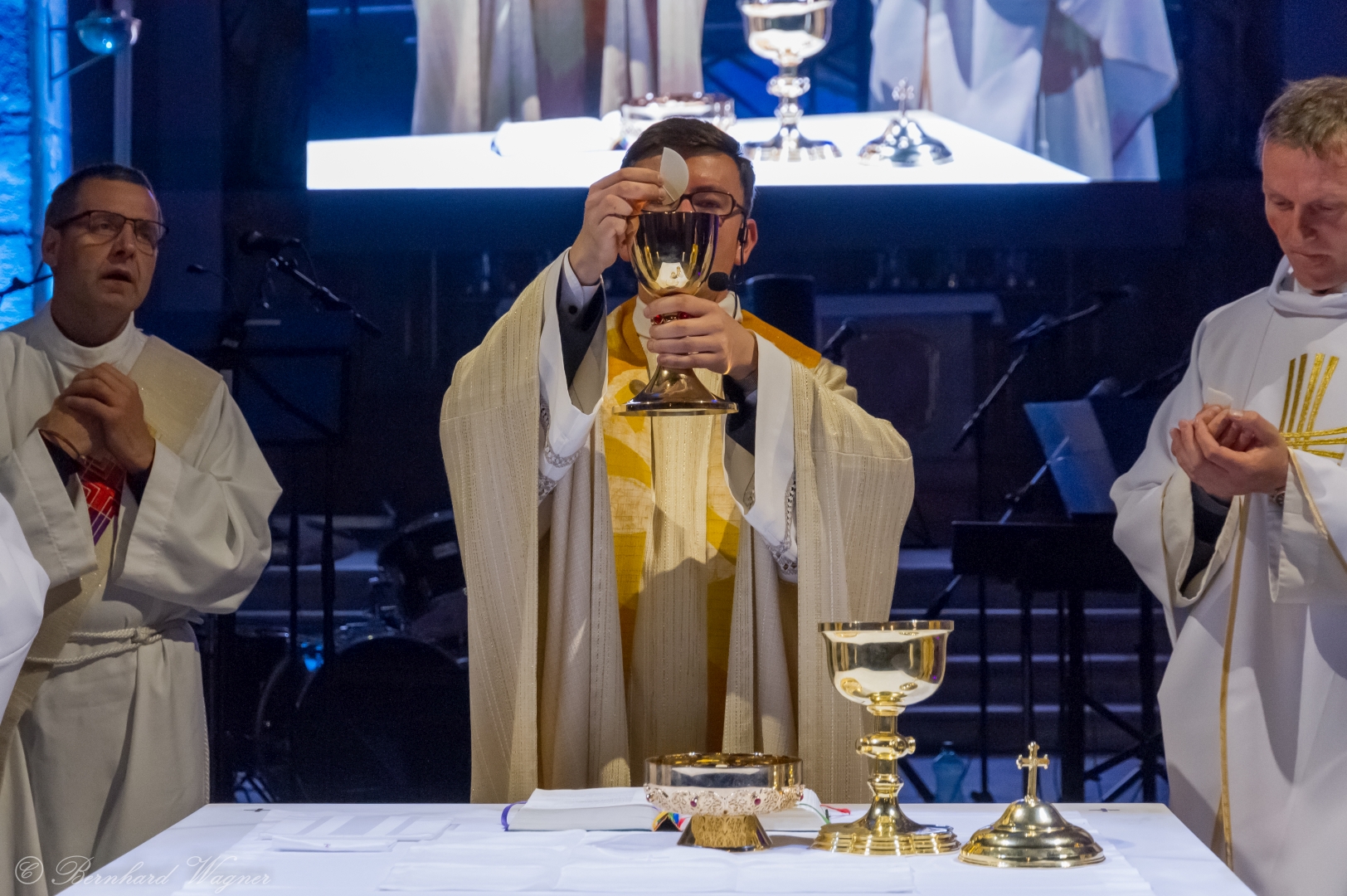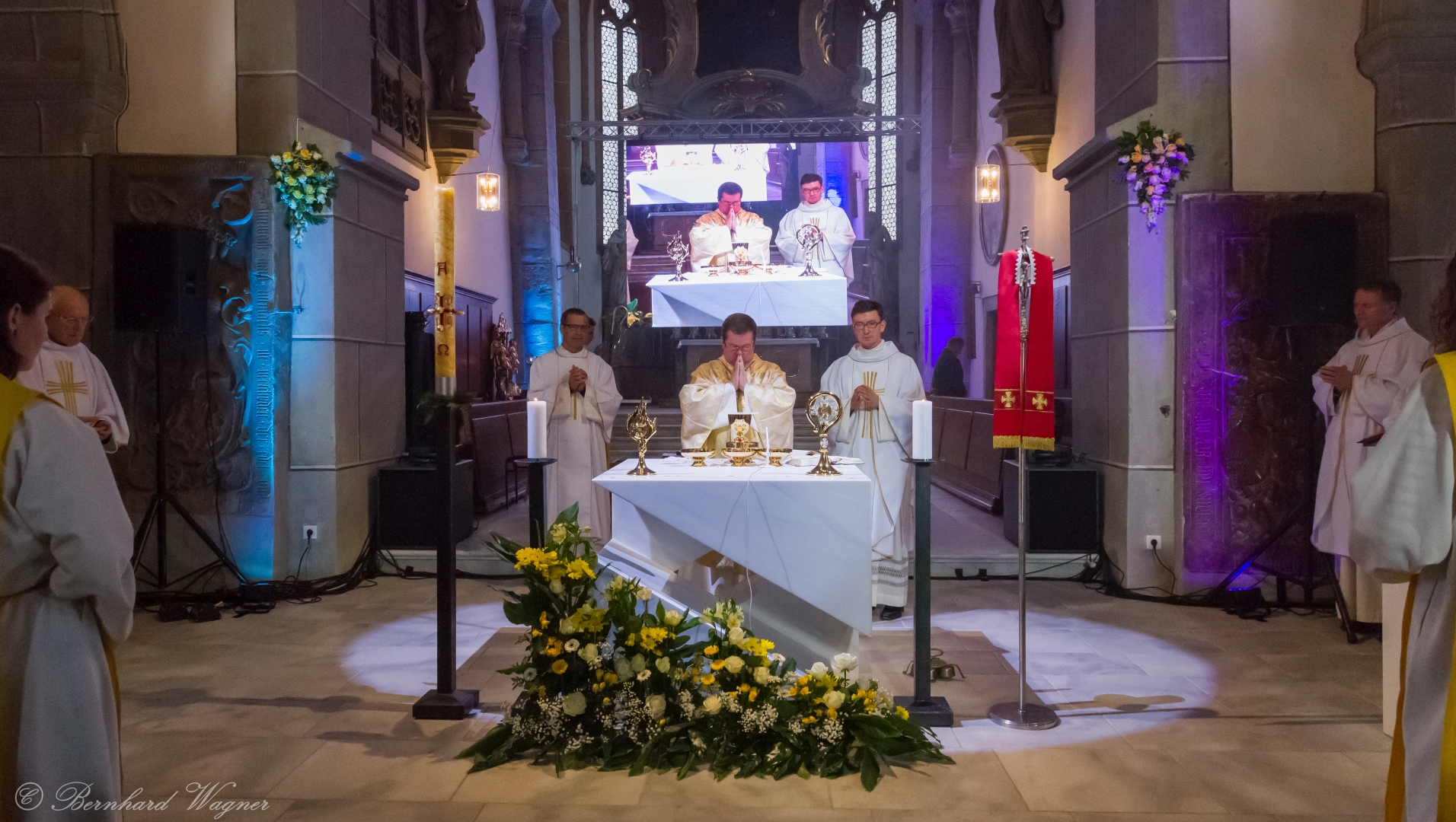 Der vierte und letzte Teil, die Eucharistiefeier, eröffnete wie bei jedem Gottesdienst mit der Bereitung der Opfergaben und nahm ihren weiteren Verlauf über Eucharistisches Hochgebet, Vaterunser, Agnus Dei und Kommunionspendung bis hin zum Schlussgebet.