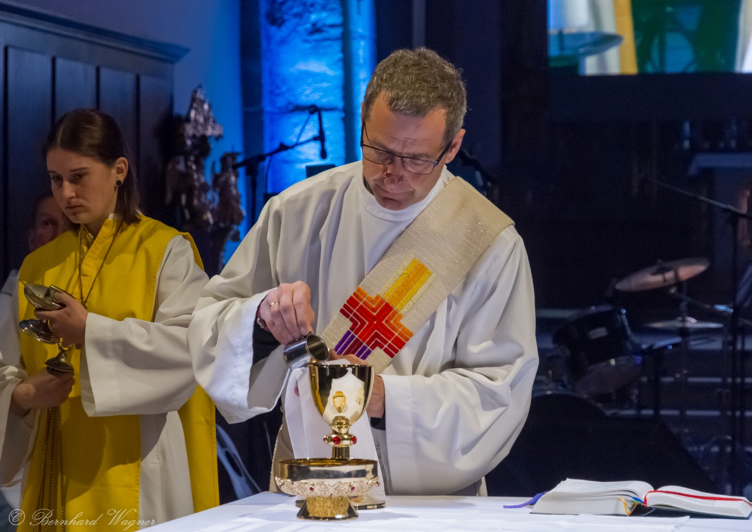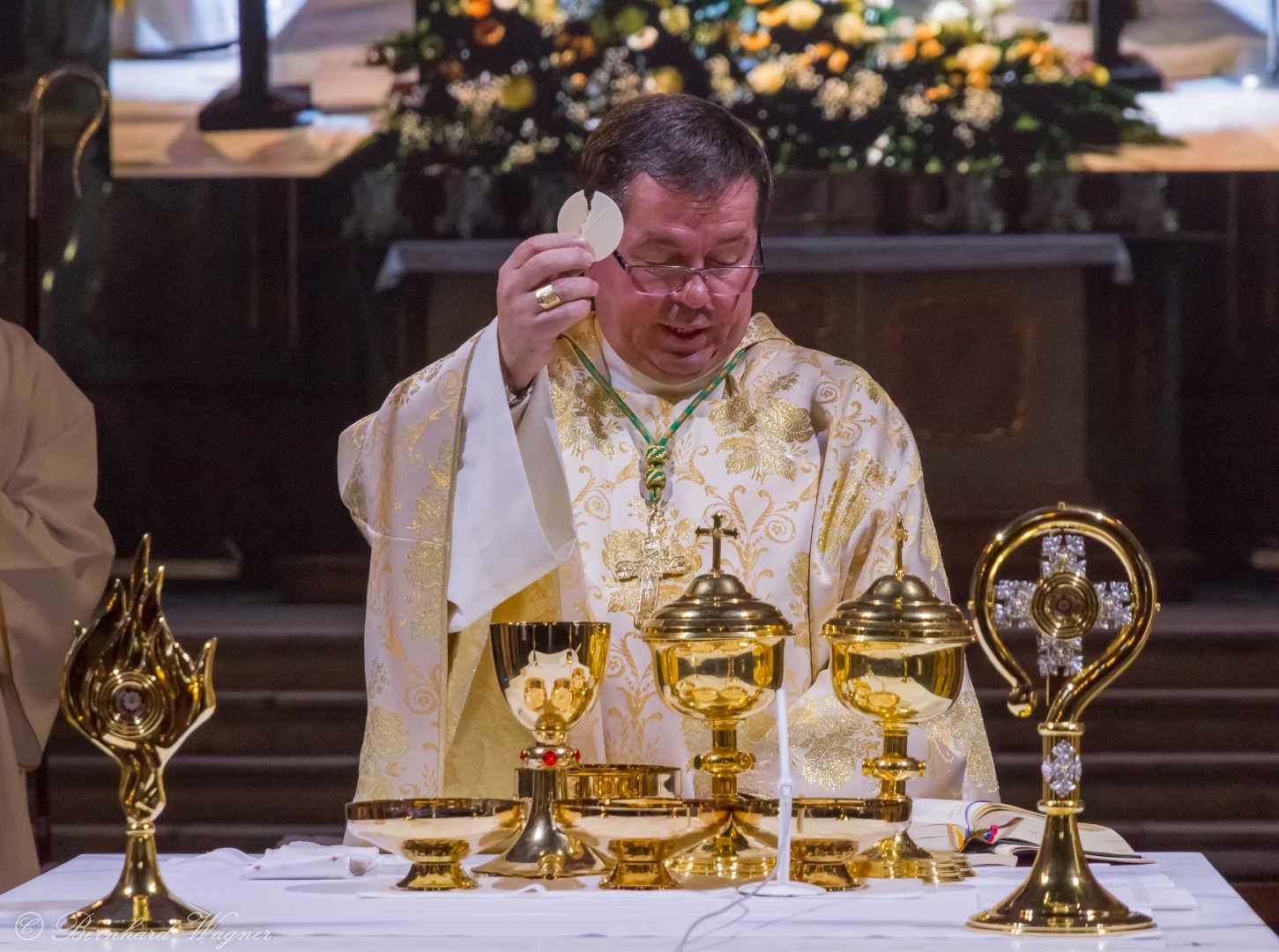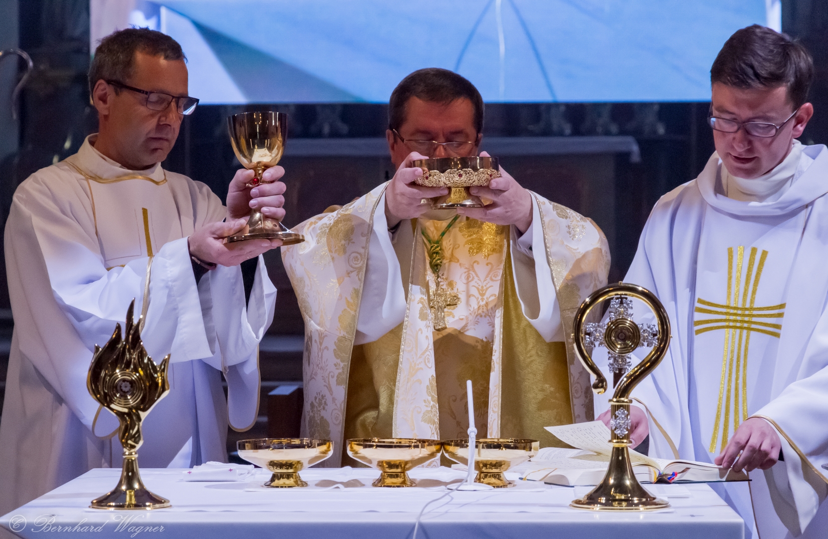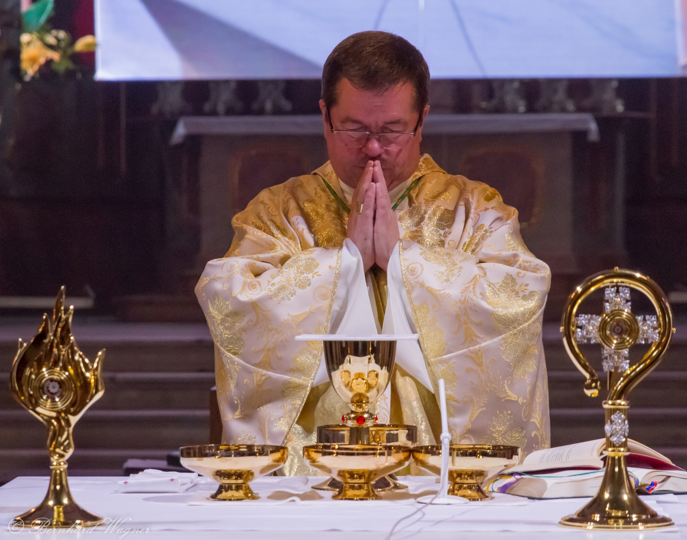 Der vierte und letzte Teil, die Eucharistiefeier, eröffnete wie bei jedem Gottesdienst mit der Bereitung der Opfergaben und nahm ihren weiteren Verlauf über Eucharistisches Hochgebet, Vaterunser, Agnus Dei und Kommunionspendung bis hin zum Schlussgebet.