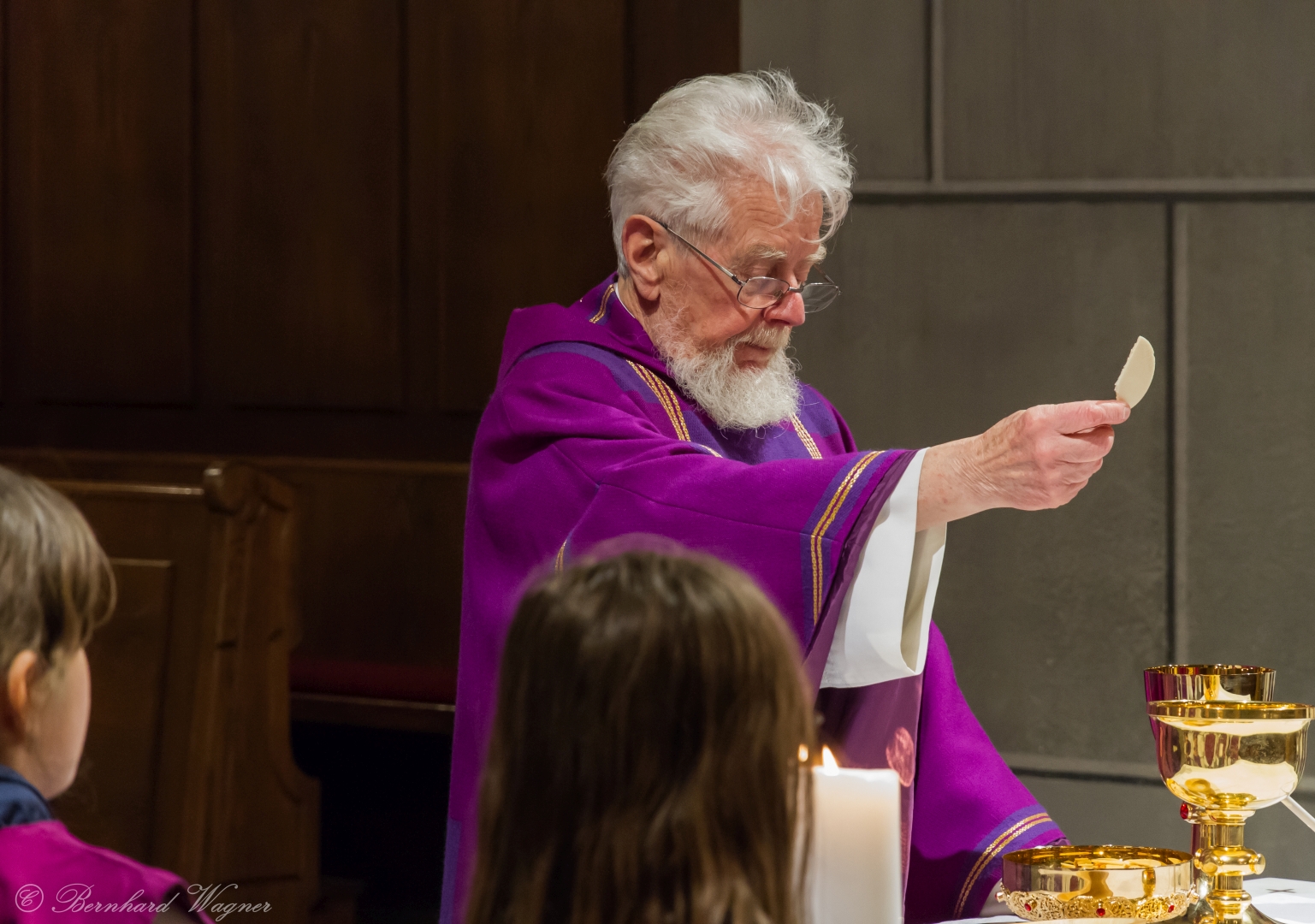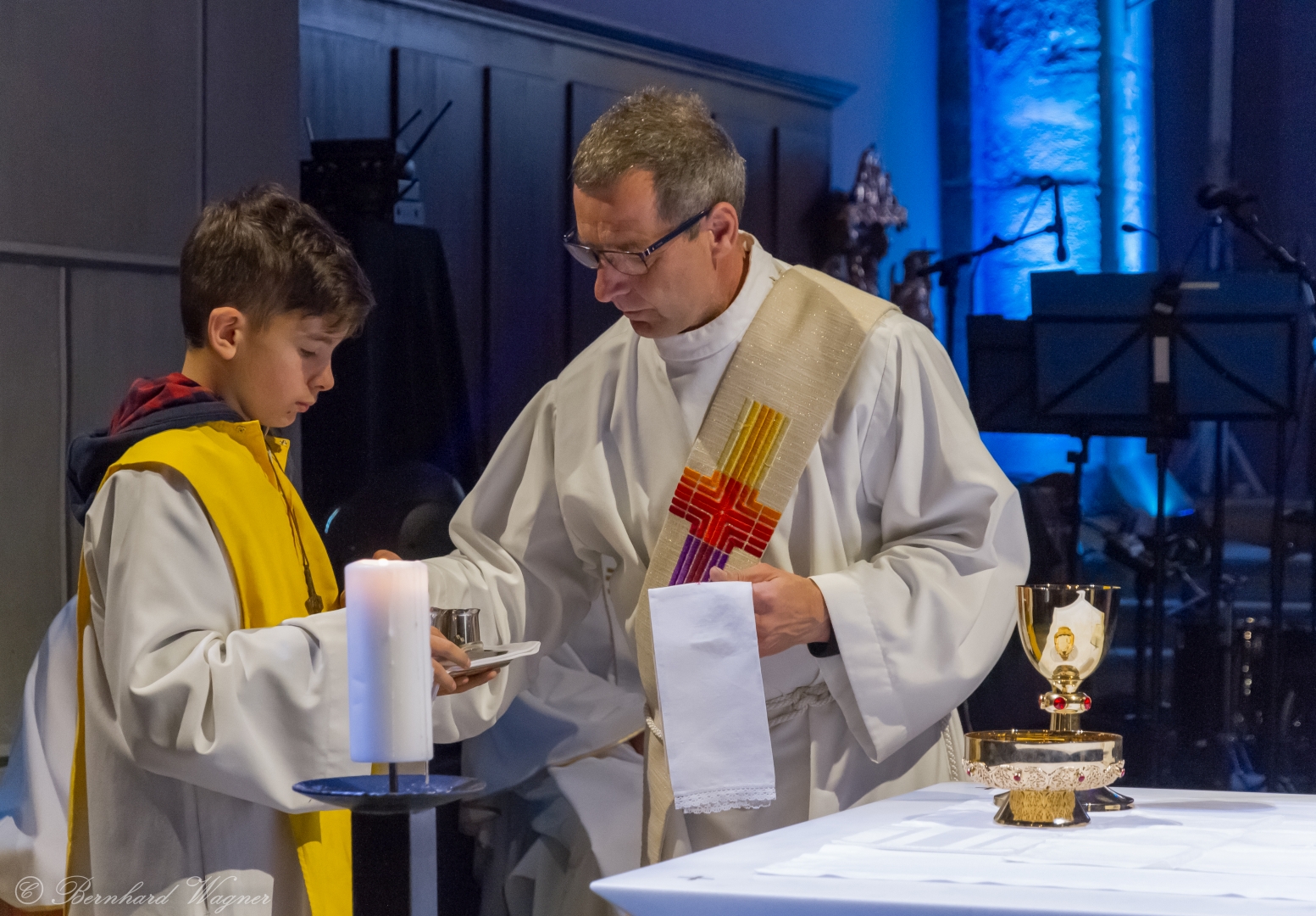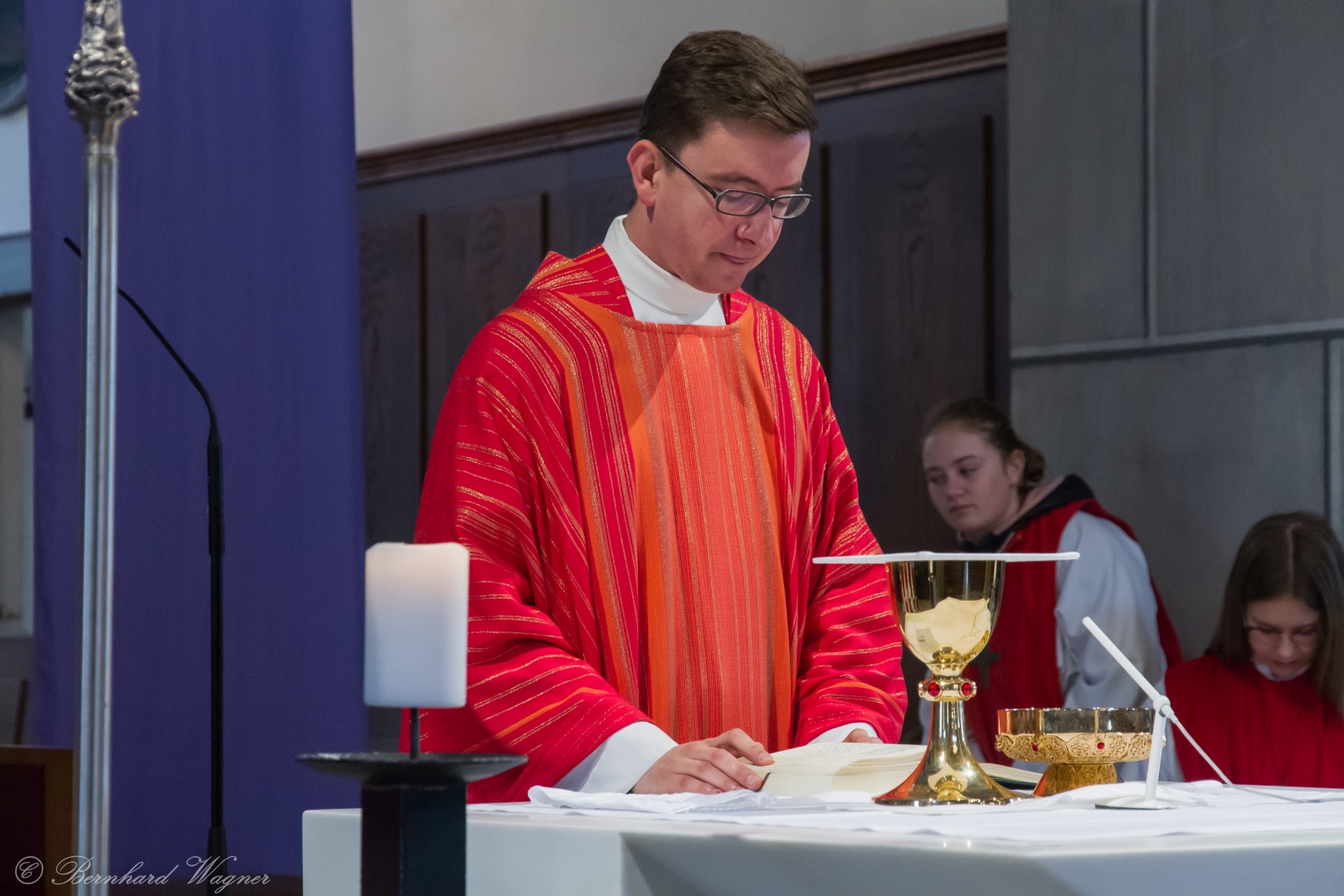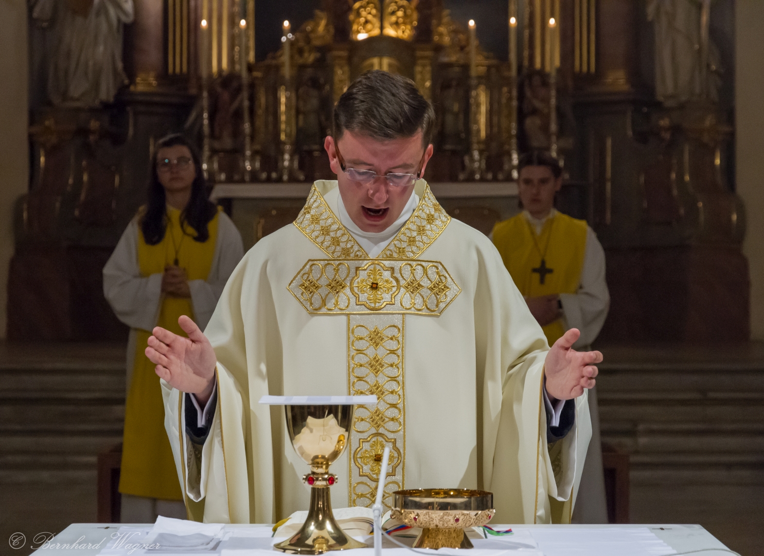 Der vierte und letzte Teil, die Eucharistiefeier, eröffnete wie bei jedem Gottesdienst mit der Bereitung der Opfergaben und nahm ihren weiteren Verlauf über Eucharistisches Hochgebet, Vaterunser, Agnus Dei und Kommunionspendung bis hin zum Schlussgebet.
