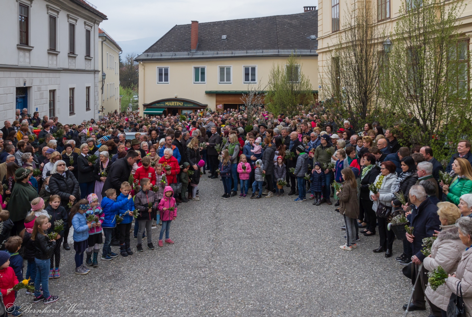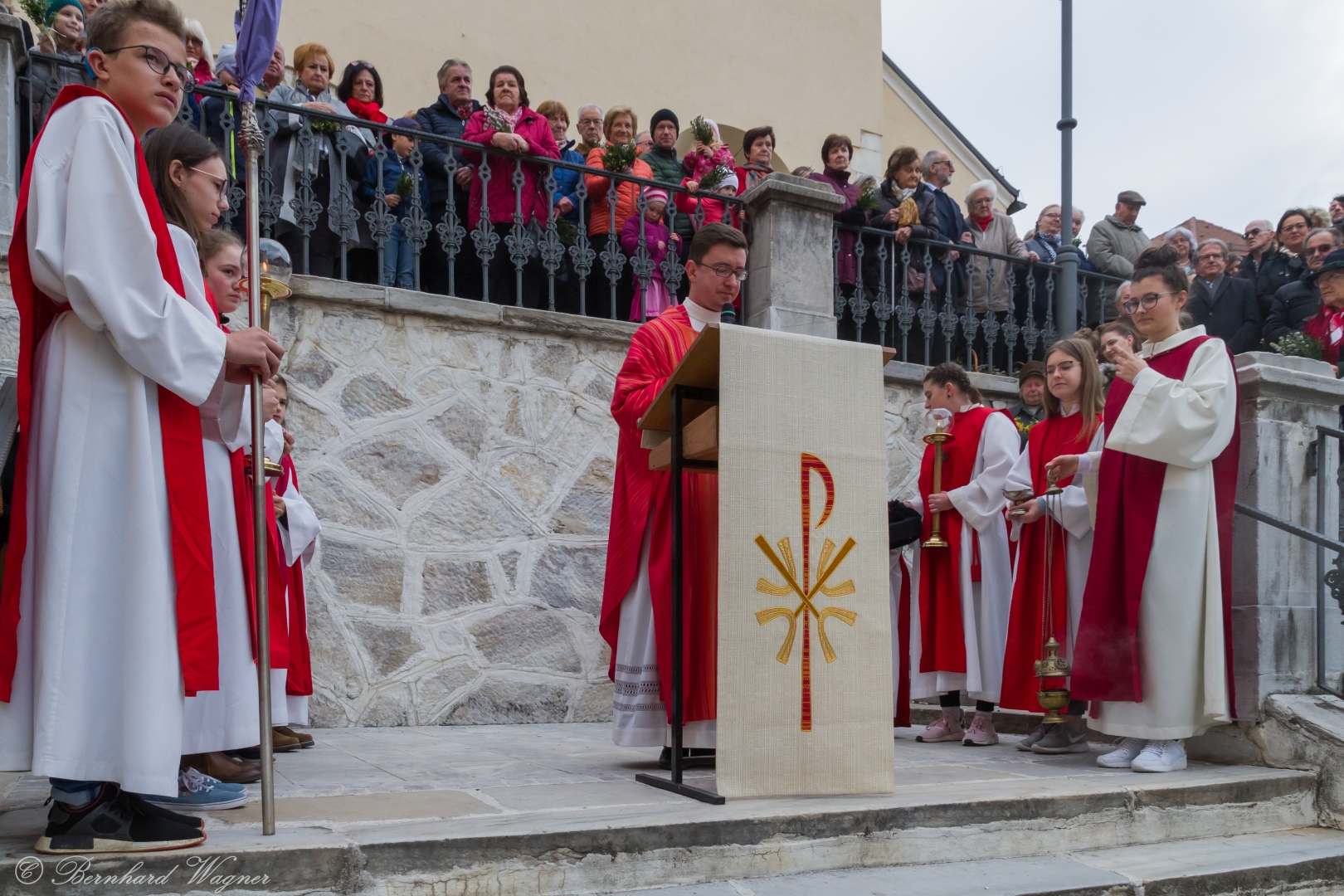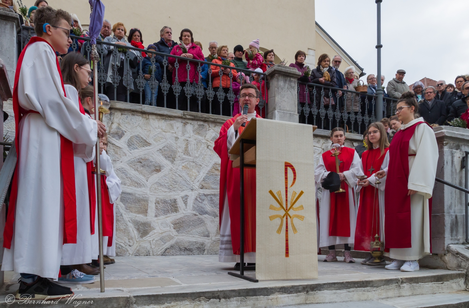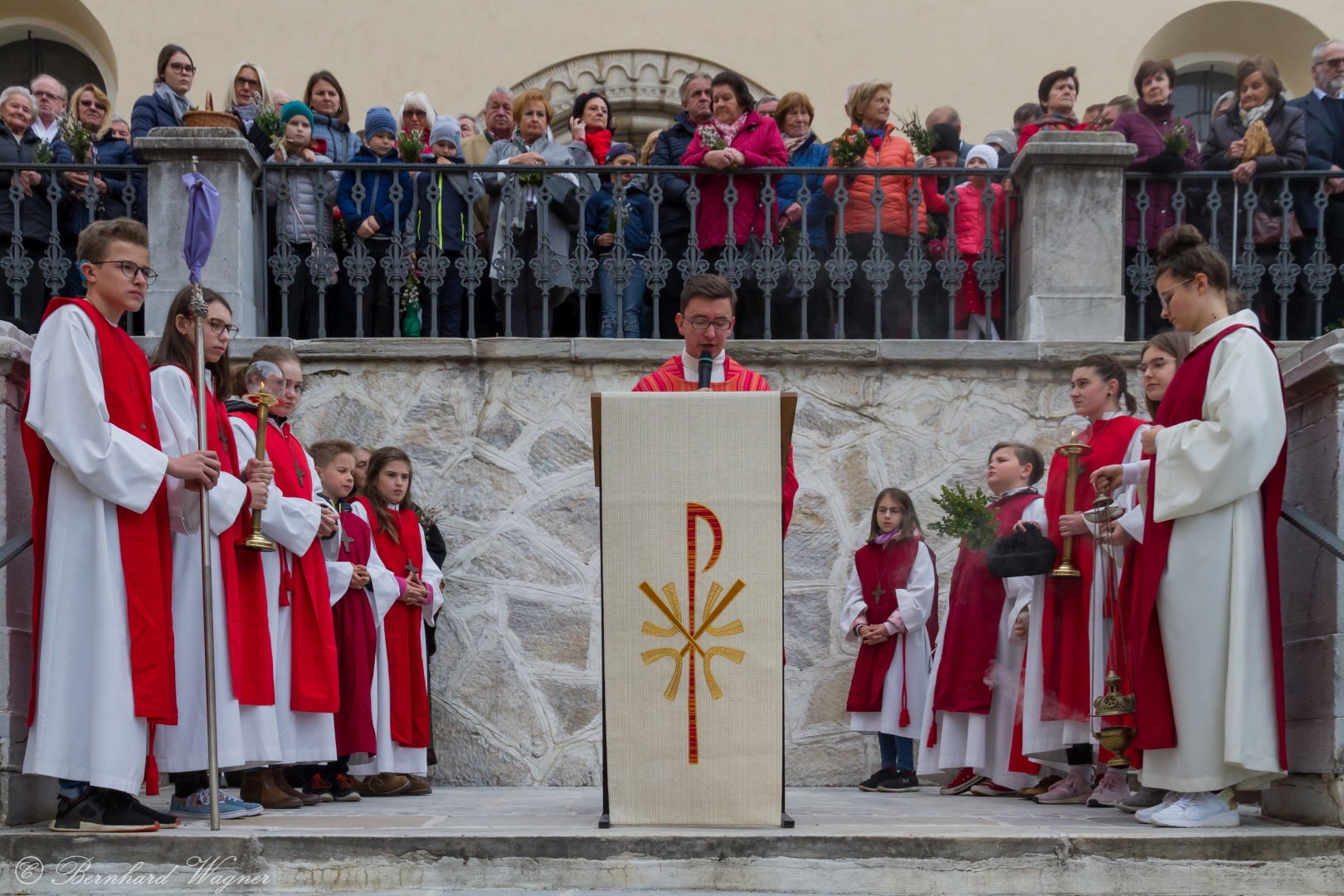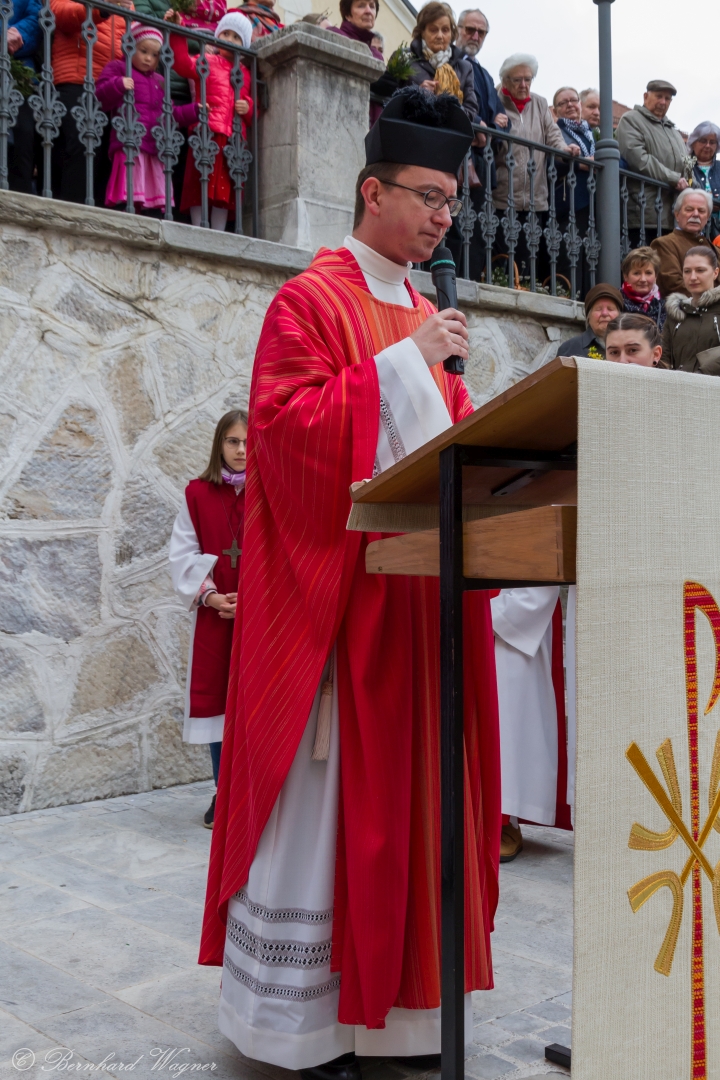 Schließlich zogen nach der Segnung der Palmzweige Priester und Ministranten sowie viele weitere der versammelten Gläubigen mit typischen Palmbesen aus unserer Gegend durch das Hauptportal in die Markuskirche ein. Wegen der kurzen Distanz zwischen Schulplatz und Kirche musste in diesem Jahr jedoch auf eine Palmprozession im eigentlichen Sinn verzichtet werden wie man diese sonst kennt wenn die Palmweihe am Hohen Platz stattfindet.