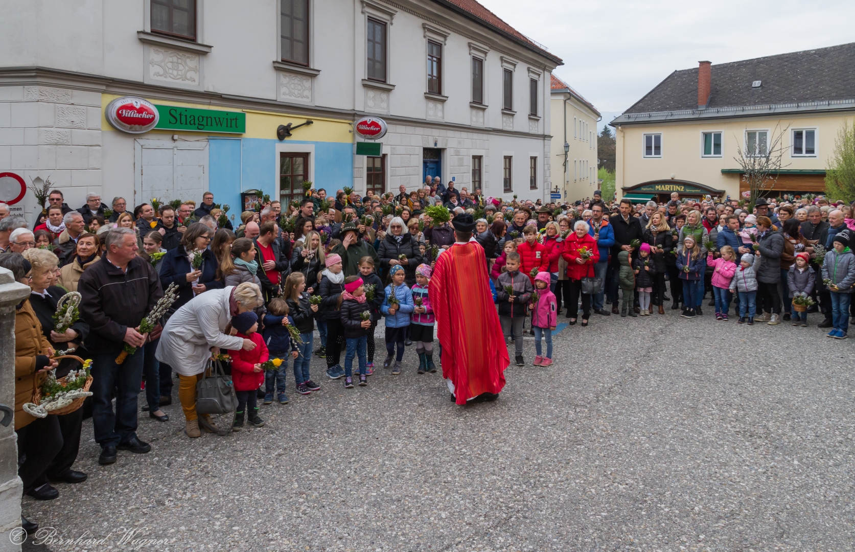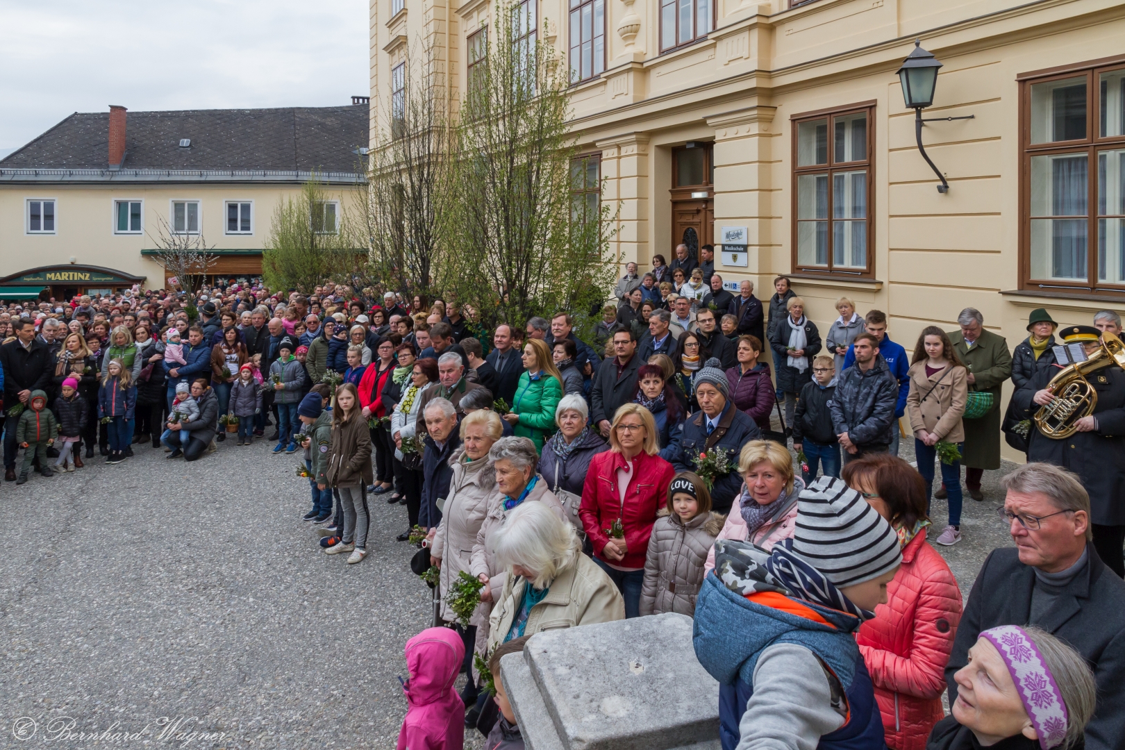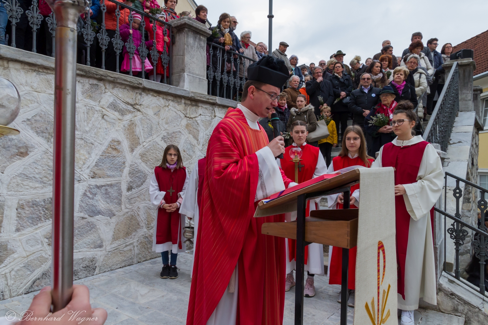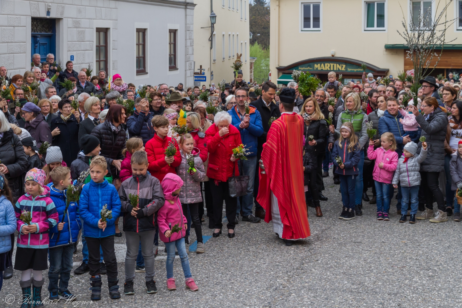 Schließlich zogen nach der Segnung der Palmzweige Priester und Ministranten sowie viele weitere der versammelten Gläubigen mit typischen Palmbesen aus unserer Gegend durch das Hauptportal in die Markuskirche ein. Wegen der kurzen Distanz zwischen Schulplatz und Kirche musste in diesem Jahr jedoch auf eine Palmprozession im eigentlichen Sinn verzichtet werden wie man diese sonst kennt wenn die Palmweihe am Hohen Platz stattfindet.