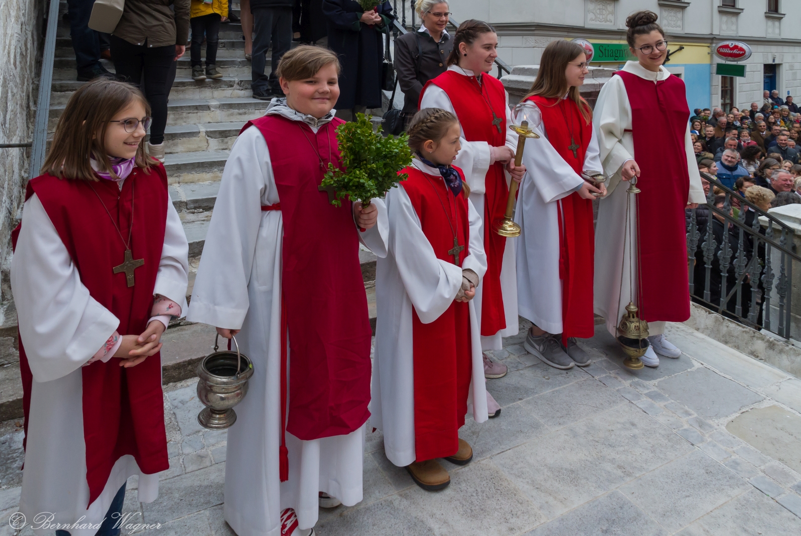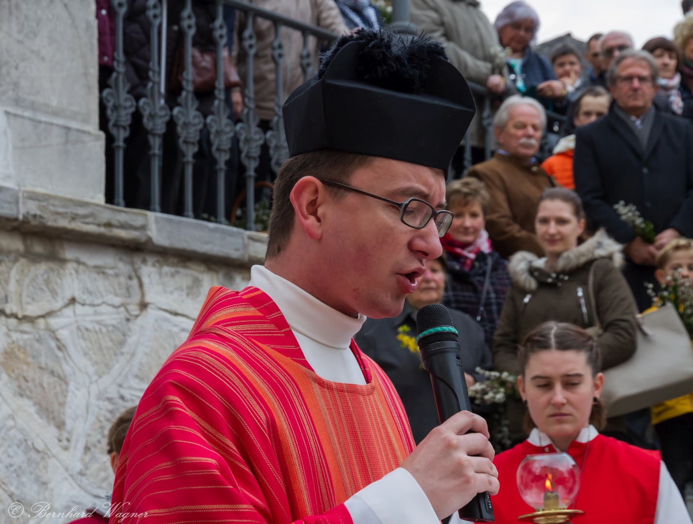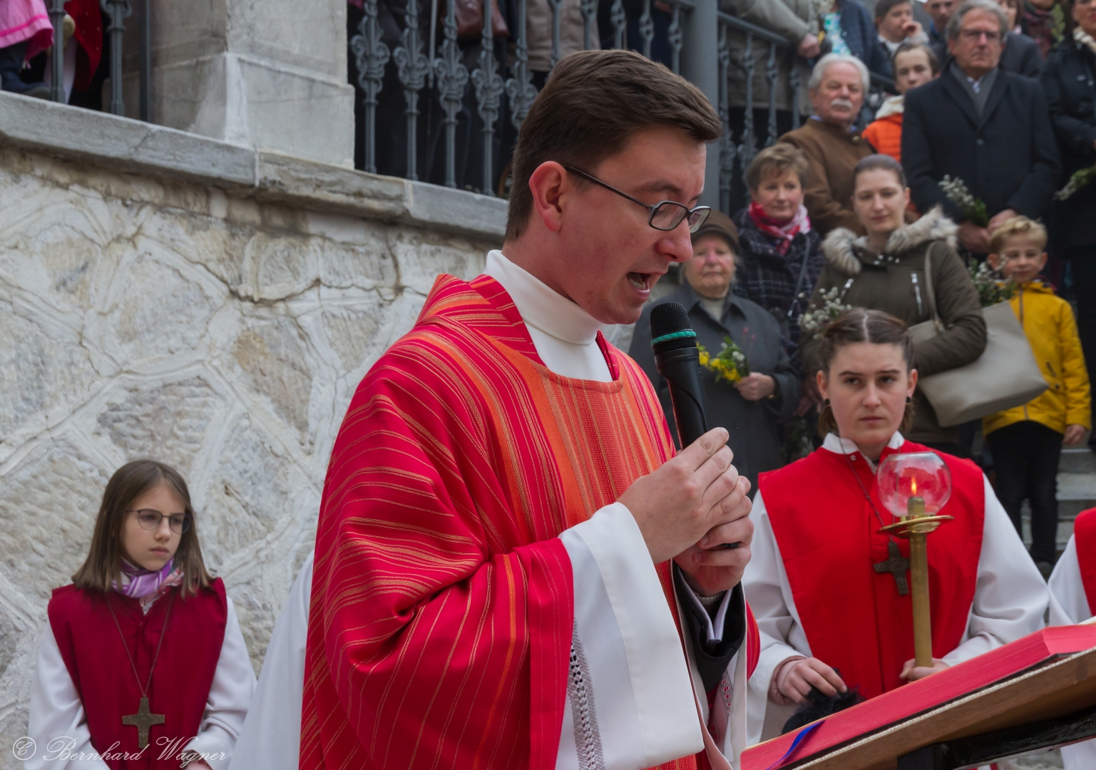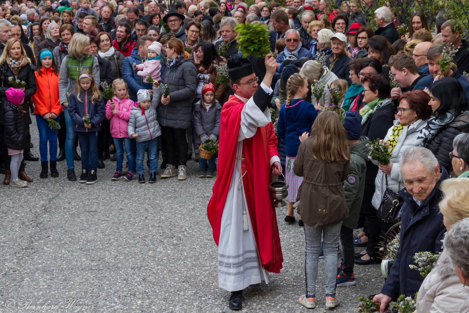 Schließlich zogen nach der Segnung der Palmzweige Priester und Ministranten sowie viele weitere der versammelten Gläubigen mit typischen Palmbesen aus unserer Gegend durch das Hauptportal in die Markuskirche ein. Wegen der kurzen Distanz zwischen Schulplatz und Kirche musste in diesem Jahr jedoch auf eine Palmprozession im eigentlichen Sinn verzichtet werden wie man diese sonst kennt wenn die Palmweihe am Hohen Platz stattfindet.