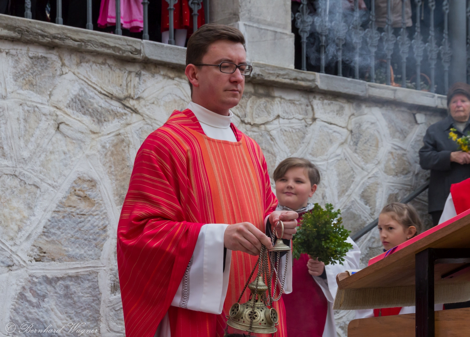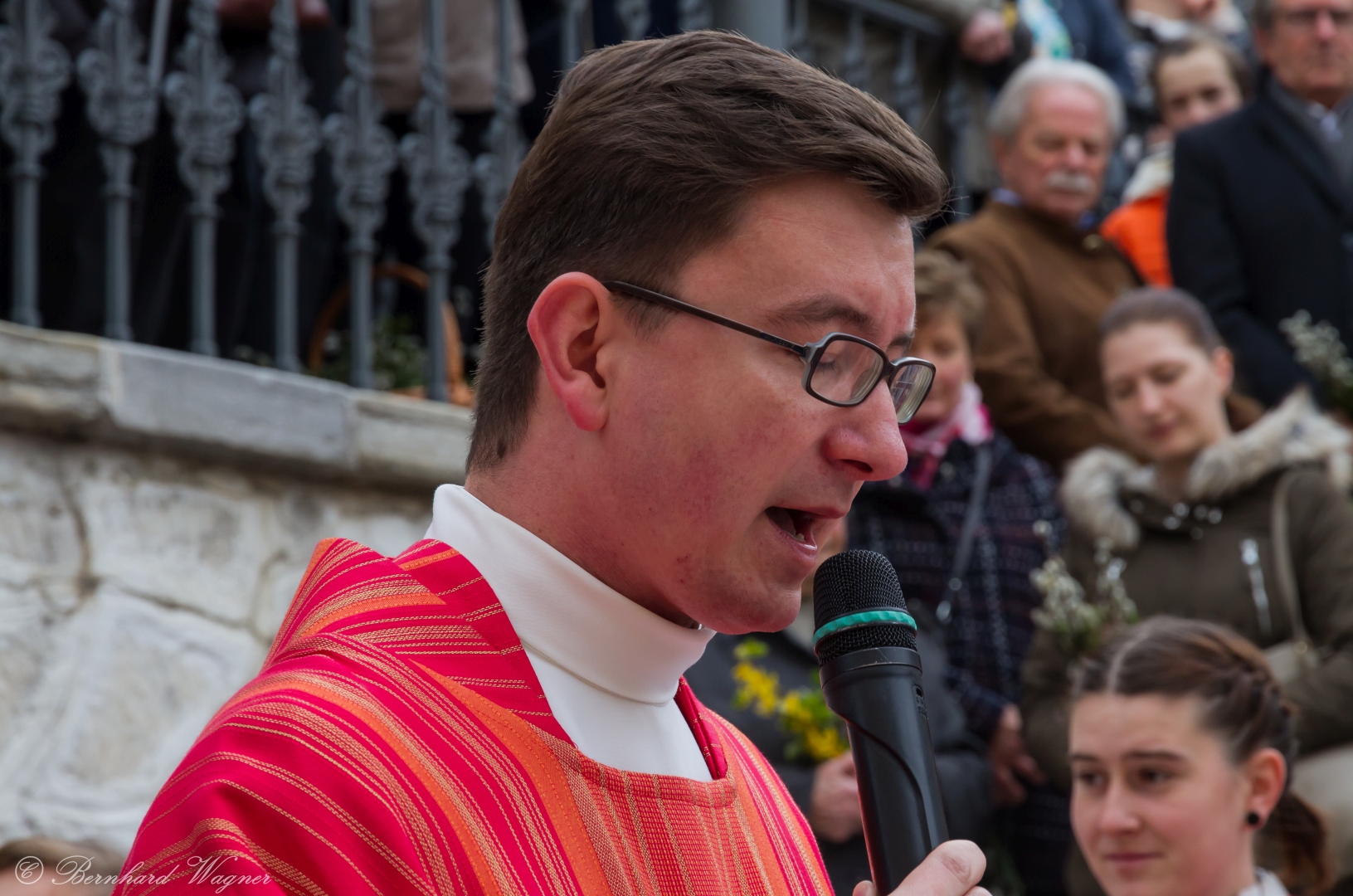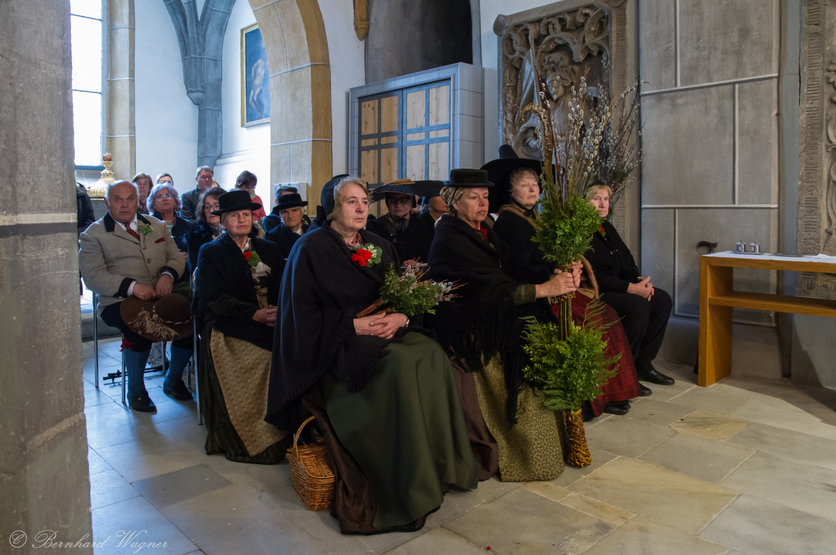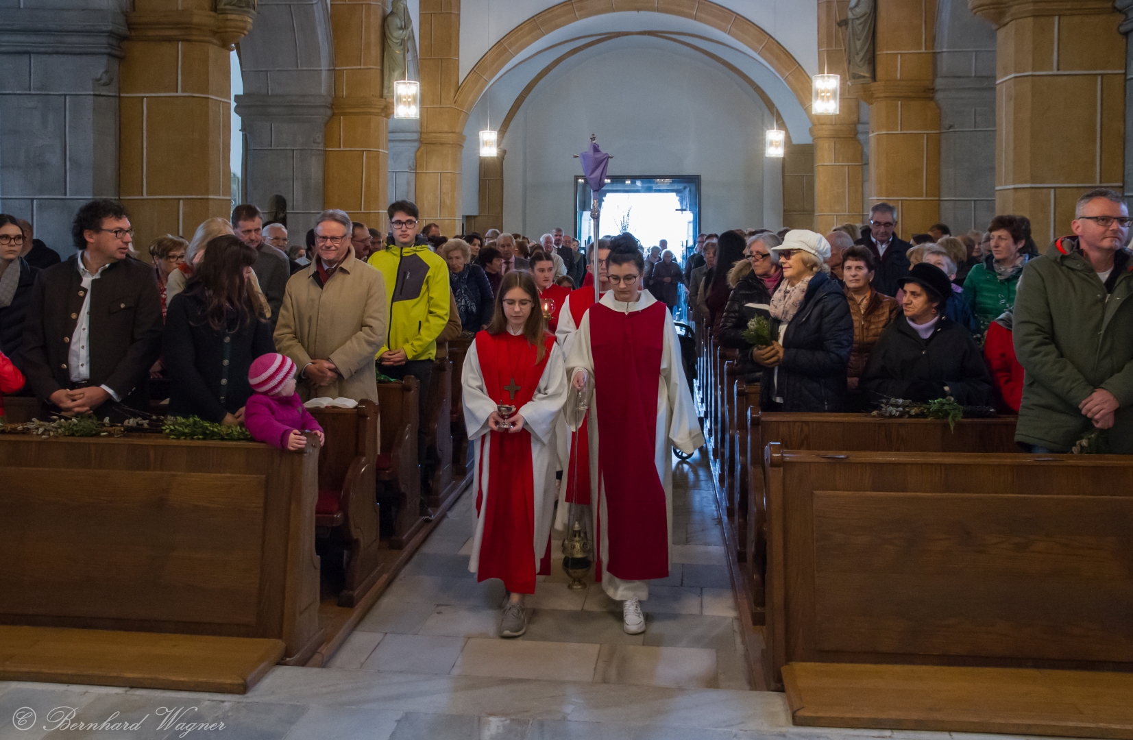 Schließlich zogen nach der Segnung der Palmzweige Priester und Ministranten sowie viele weitere der versammelten Gläubigen mit typischen Palmbesen aus unserer Gegend durch das Hauptportal in die Markuskirche ein. Wegen der kurzen Distanz zwischen Schulplatz und Kirche musste in diesem Jahr jedoch auf eine Palmprozession im eigentlichen Sinn verzichtet werden wie man diese sonst kennt wenn die Palmweihe am Hohen Platz stattfindet.