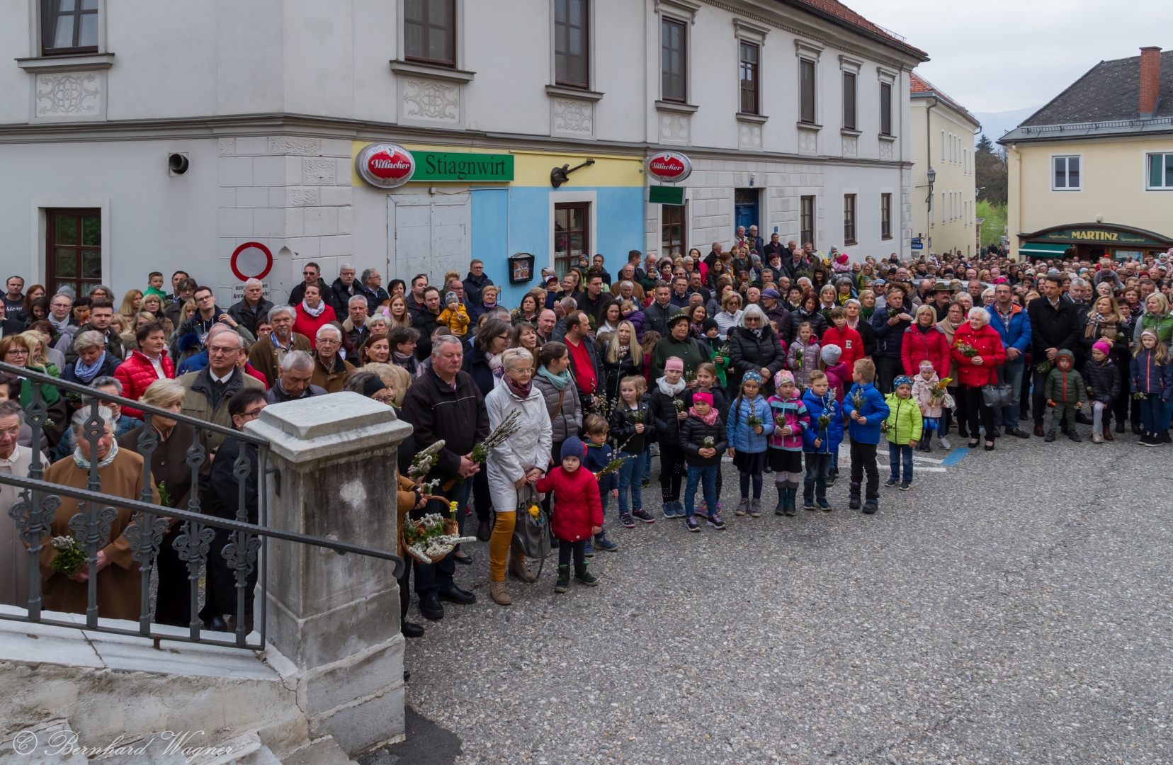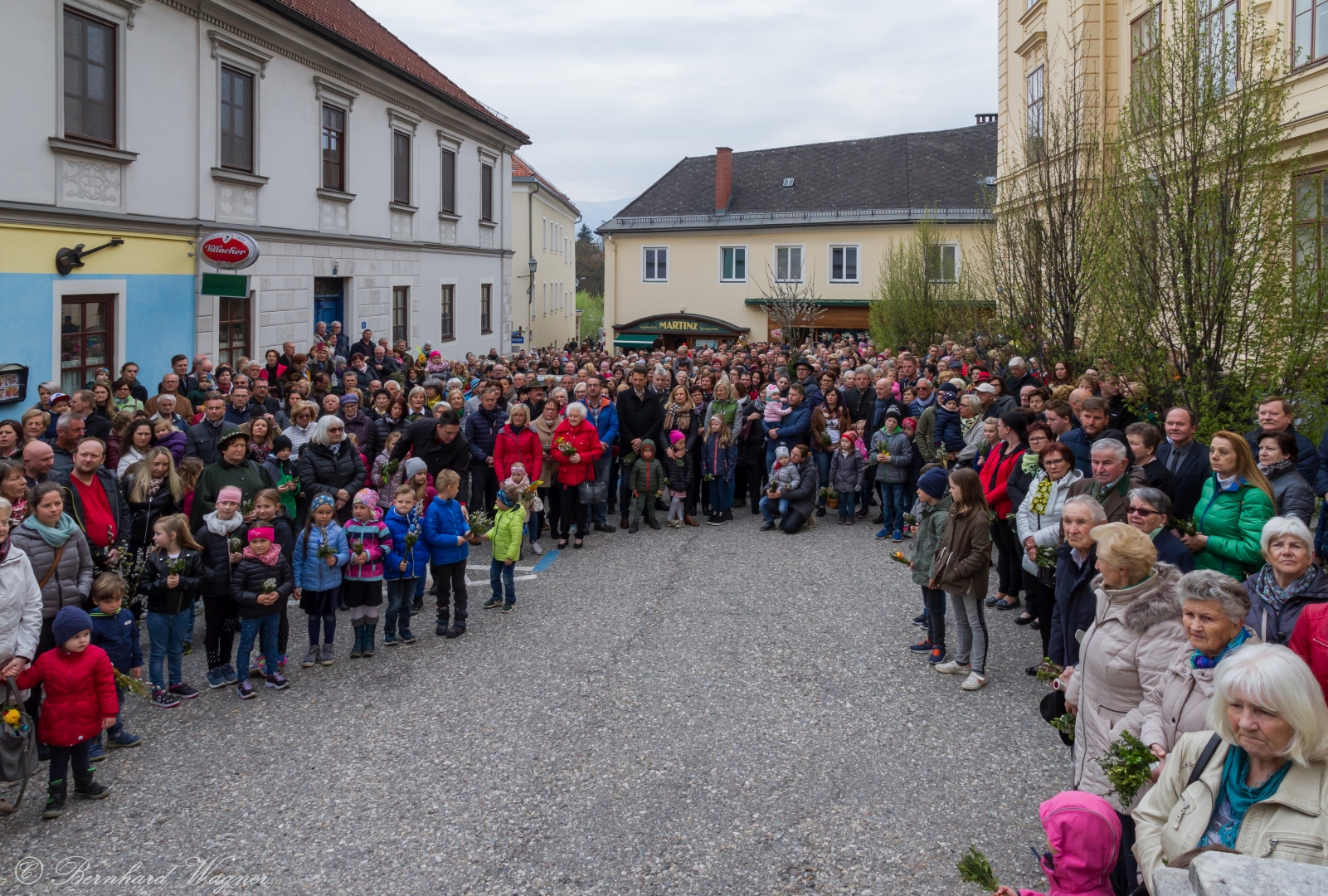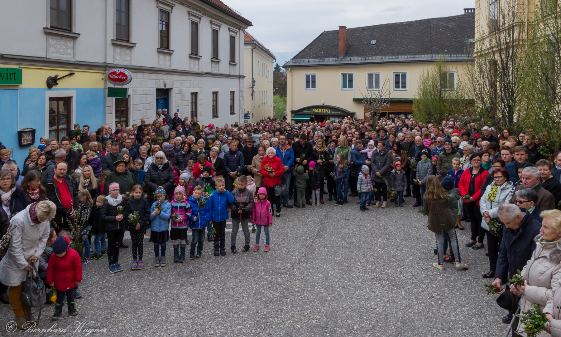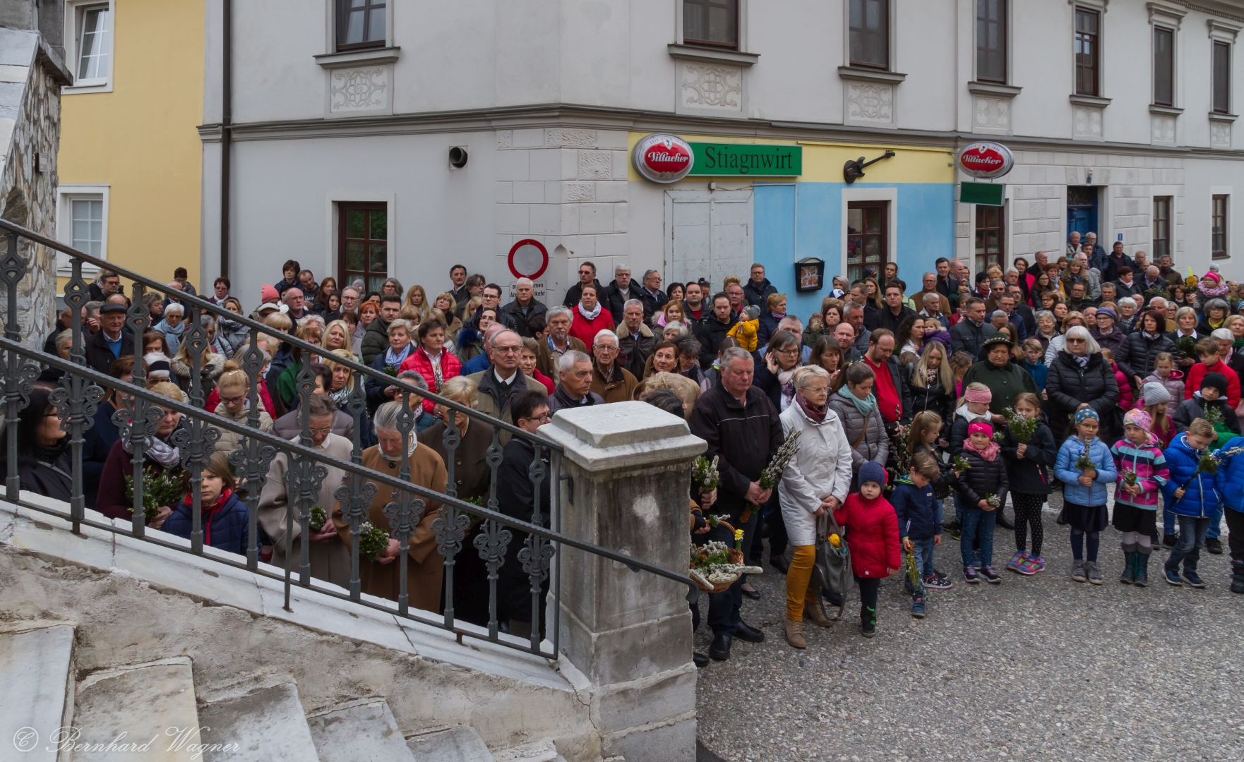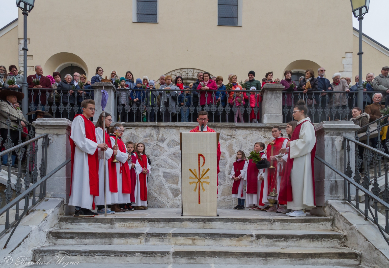 Eine Vielzahl an Gläubigen, von Kindern bis zu Seniorinnen und Senioren, fand sich am Platz vor der Musikschule Wolfsberg, am Stiegenaufgang zum Markusplatz (Schulstiege) und auch noch beim Stiegengeländer am Markusplatz selbst ein um gemeinsam mit Pfarrprovisor Mag. Dr. Christoph Kranicki, elf Ministranten und weiteren Mitarbeiterinnen und Mitarbeitern der Pfarre beginnend mit der Palmweihe um 9.30 Uhr den Palmsonntag zu feiern. Der Schulplatz wurde diesmal gewählt, da baustellenbedingt im Zusammenhang mit der Erneuerung des Hohen Platzes die Palmweihe wie sonst üblich bei der dortigen Mariensäule nicht erfolgen konnte.
