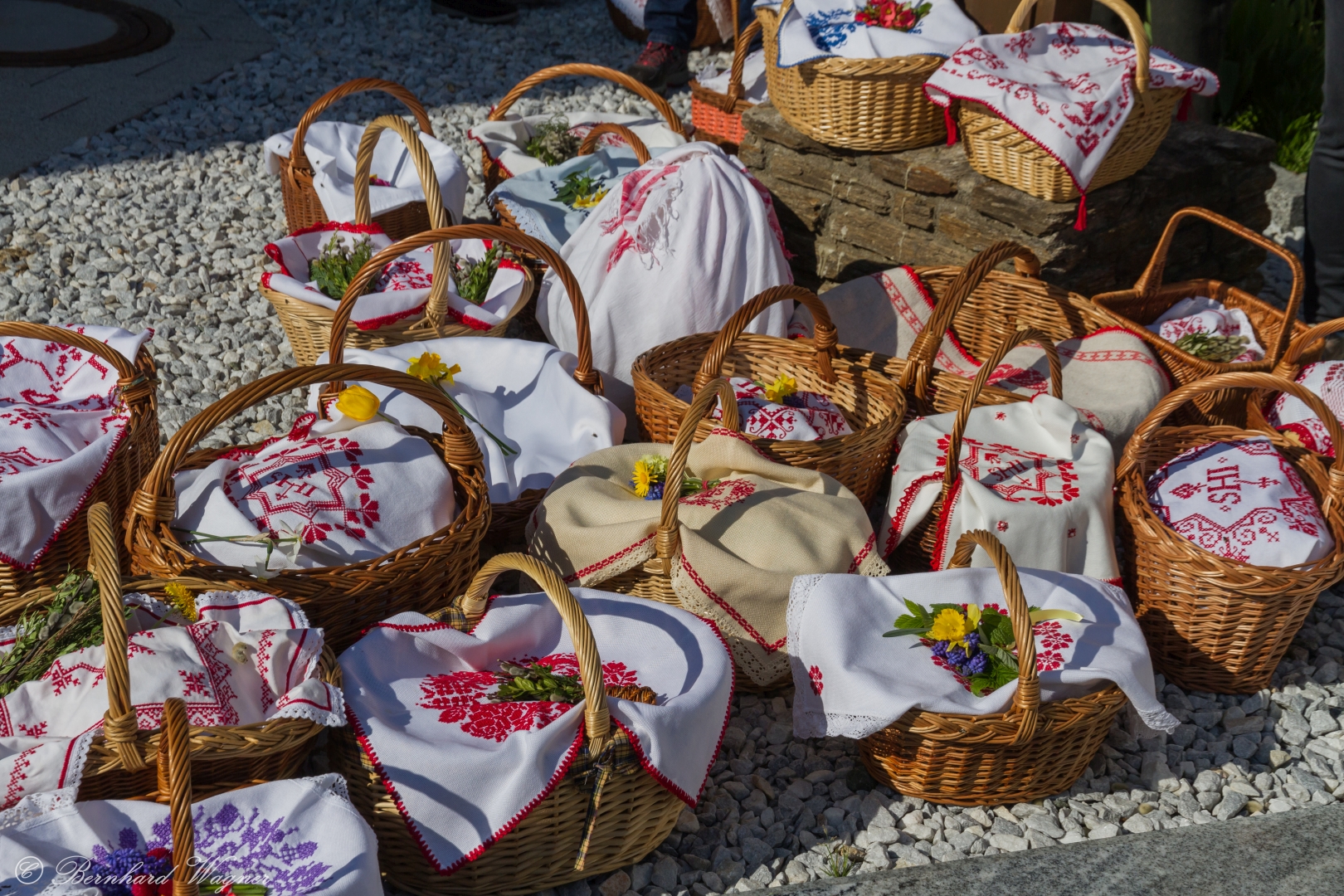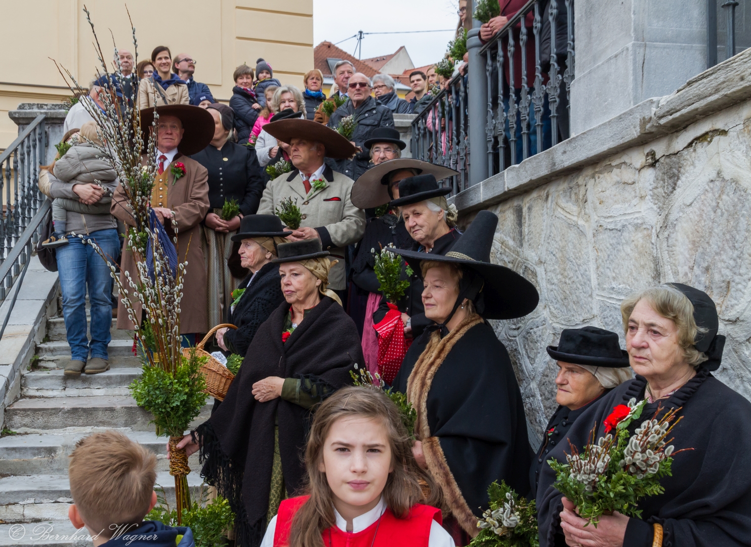 Die Brauchtumsgruppe Wolfsberg-Lavanttal hat mit ihren wunderschönen und teils auch sehr großen Palmbesen auf der Schulstiege Aufstellung bezogen. Herstellung derselben in zeitaufwendiger Handarbeit erfordert viel Geschick und Liebe zum Detail was an den Resultaten eindrucksvoll zu erkennen ist.