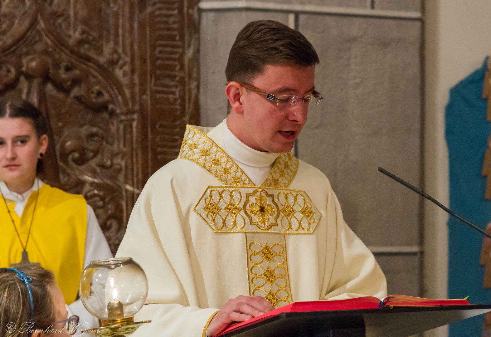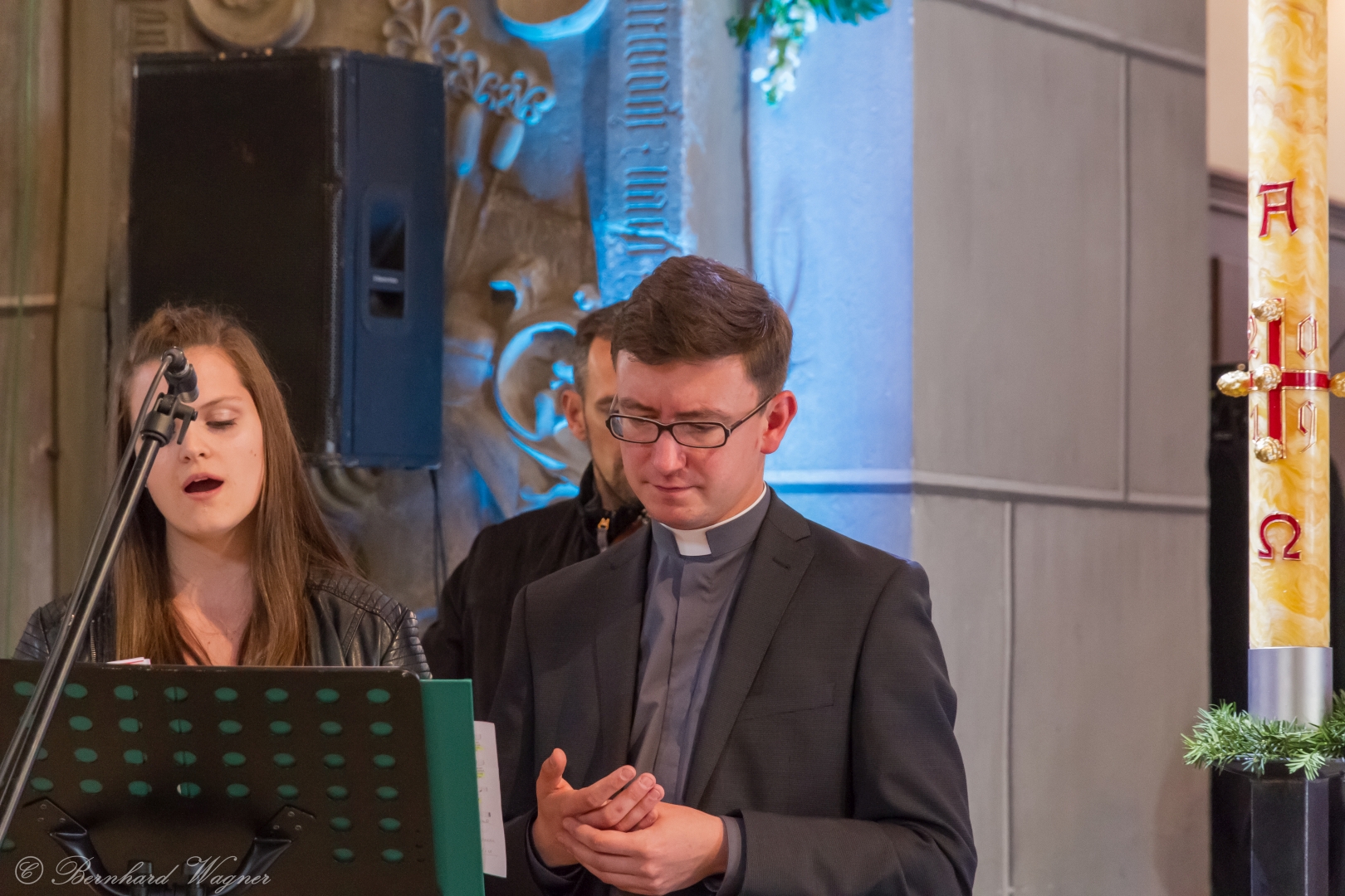 Nach dem dritten „Lumen Christi“ folgte die Inzens der zuvor auf den dafür vorgesehenen Ständer gegebenen Osterkerze und im Anschluss daran das feierliche Exsultet, das Osterlob, ein Lobgesang auf die Osterkerze.