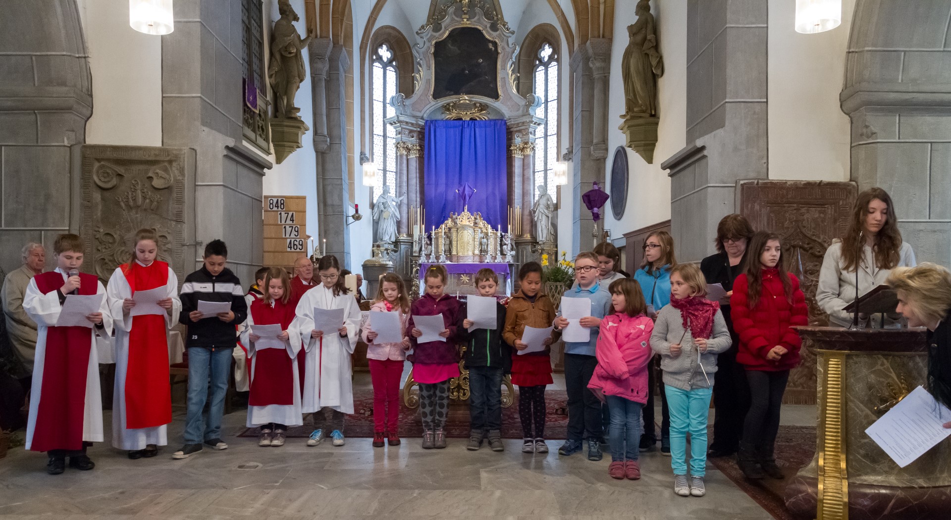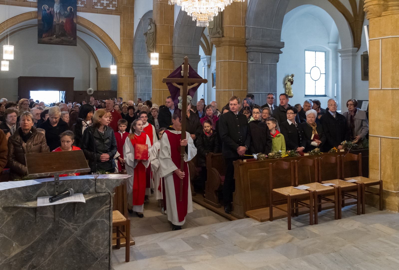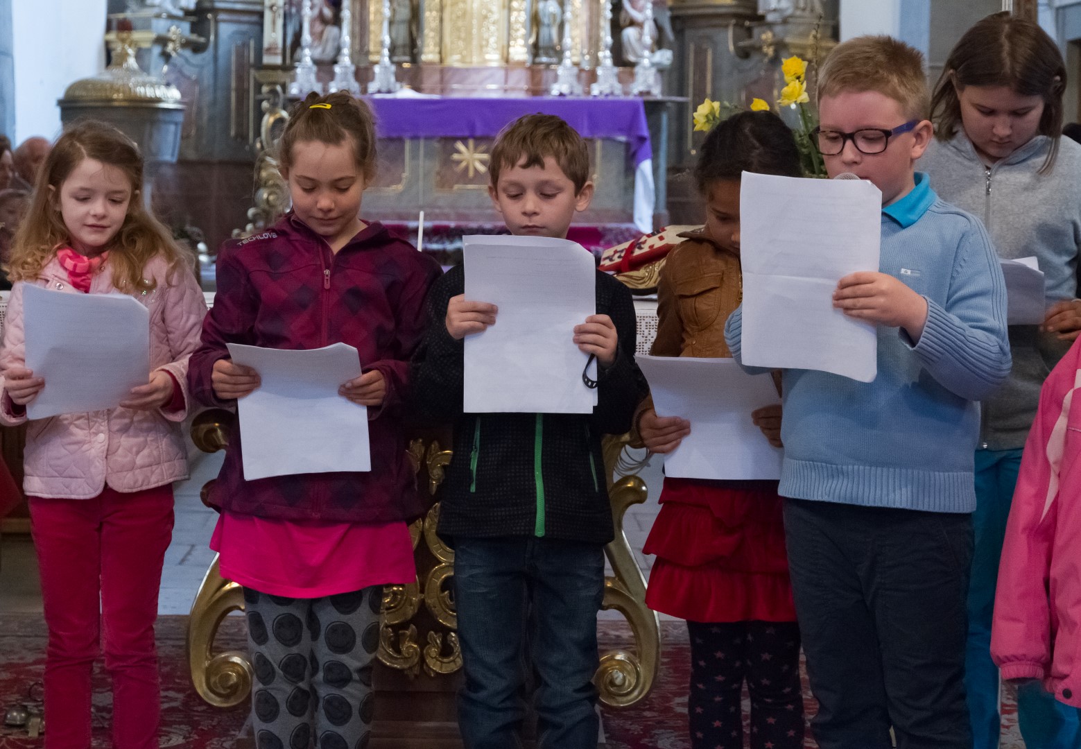 Im Anschluss an diese Feier zog man in Prozession zur Markuskirche wo beim nun folgenden Festgottesdienst einerseits dem feierlichen Einzug Jesu in Jerusalem gedacht wurde, andererseits aber auch schon der Karfreitag, als großer Tag seines Leidens und Sterbens, wesentlich ins Blickfeld kam. Das Passionsgeschehen, in Wolfsberg nicht einfach anhand des Bibeltextes gehört sondern als „Kinderpassion“ in gewisser Weise gespielt, gestalteten dabei Kinder der MI-MA-Gruppe (MinistrantInnen und Markusspatzen) in kindgerechter Weise.