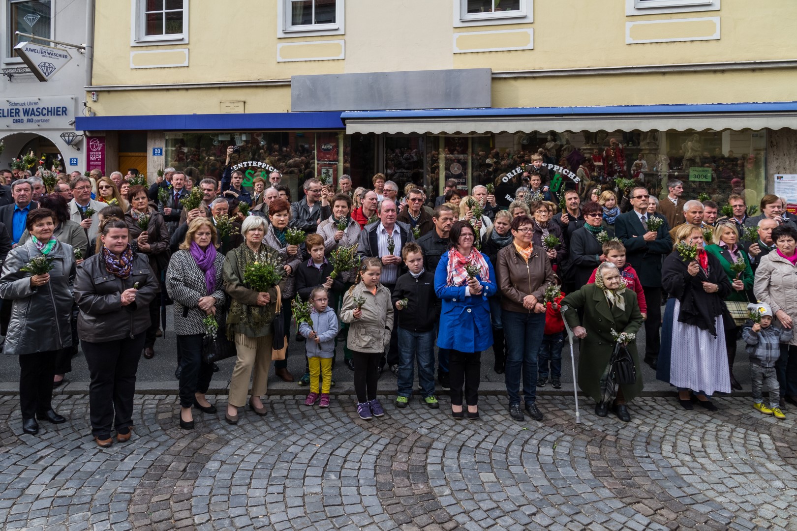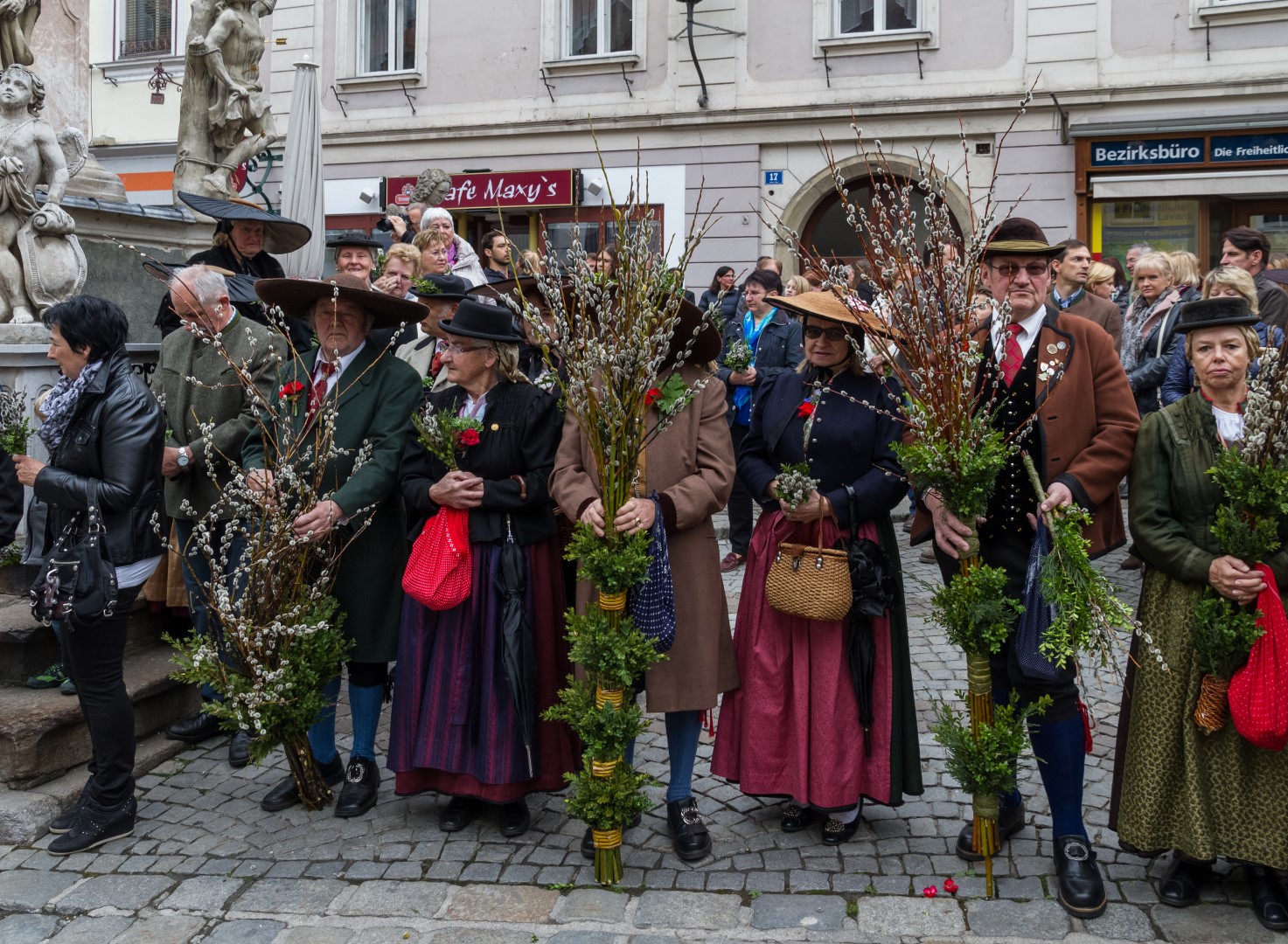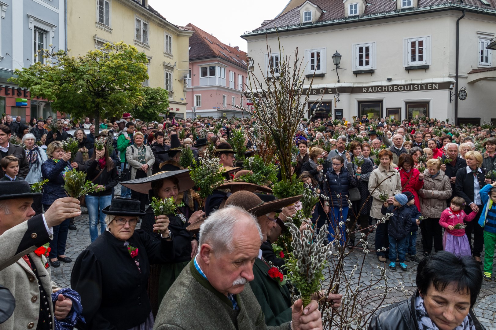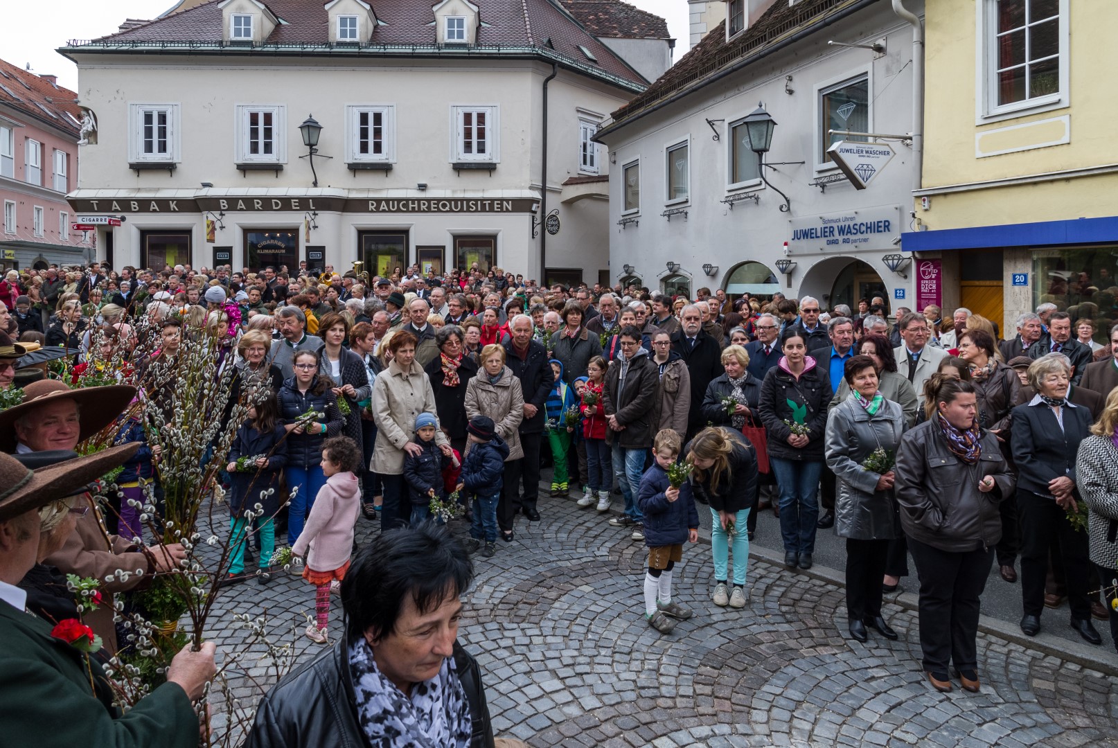 Eine Vielzahl an Gläubigen versammelte sich zur Palmweihe am Hohen Platz um die Mariensäule, unter ihnen selbstverständlich auch die Mitglieder der Brauchtumsgruppe Wolfsberg-Lavanttal mit prächtigen, eigengefertigten Palmbesen. Ein Bläserquartett der Stadtkapelle übernahm die musikalische Gestaltung.