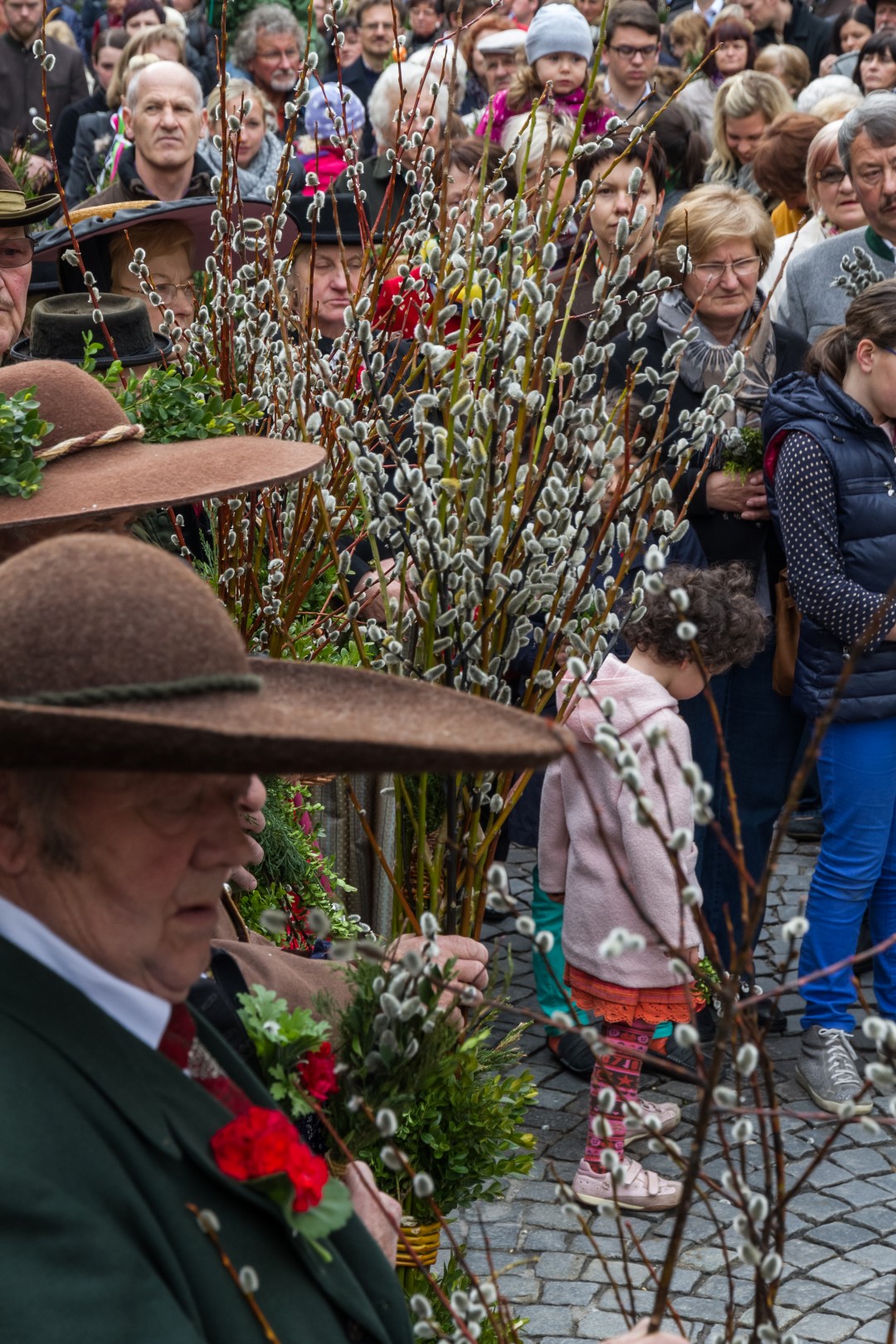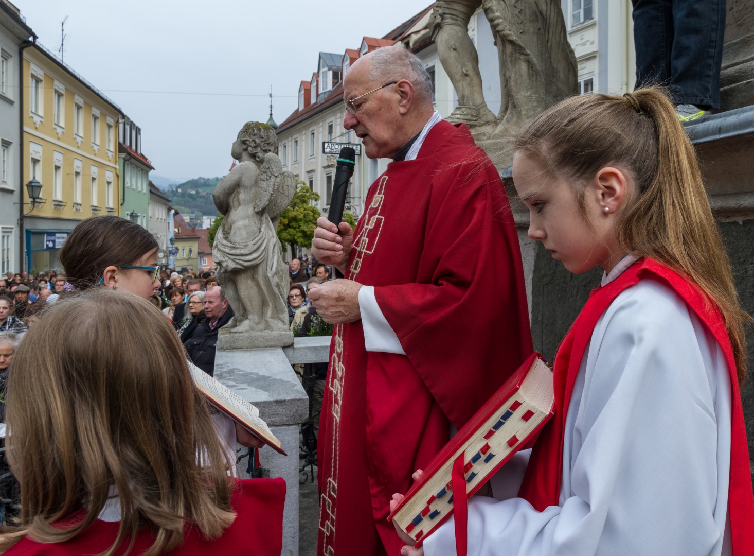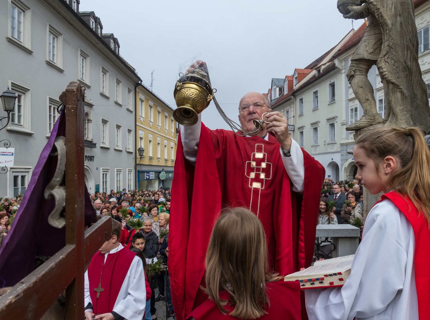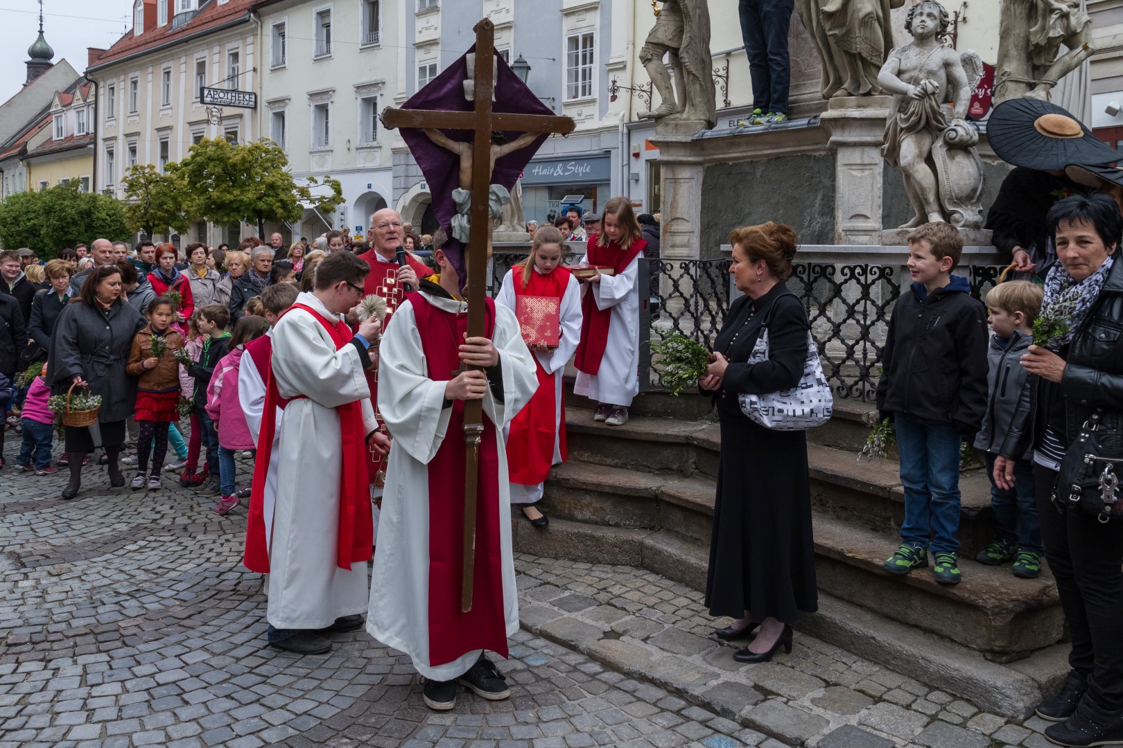 Eine Vielzahl an Gläubigen versammelte sich zur Palmweihe am Hohen Platz um die Mariensäule, unter ihnen selbstverständlich auch die Mitglieder der Brauchtumsgruppe Wolfsberg-Lavanttal mit prächtigen, eigengefertigten Palmbesen. Ein Bläserquartett der Stadtkapelle übernahm die musikalische Gestaltung.