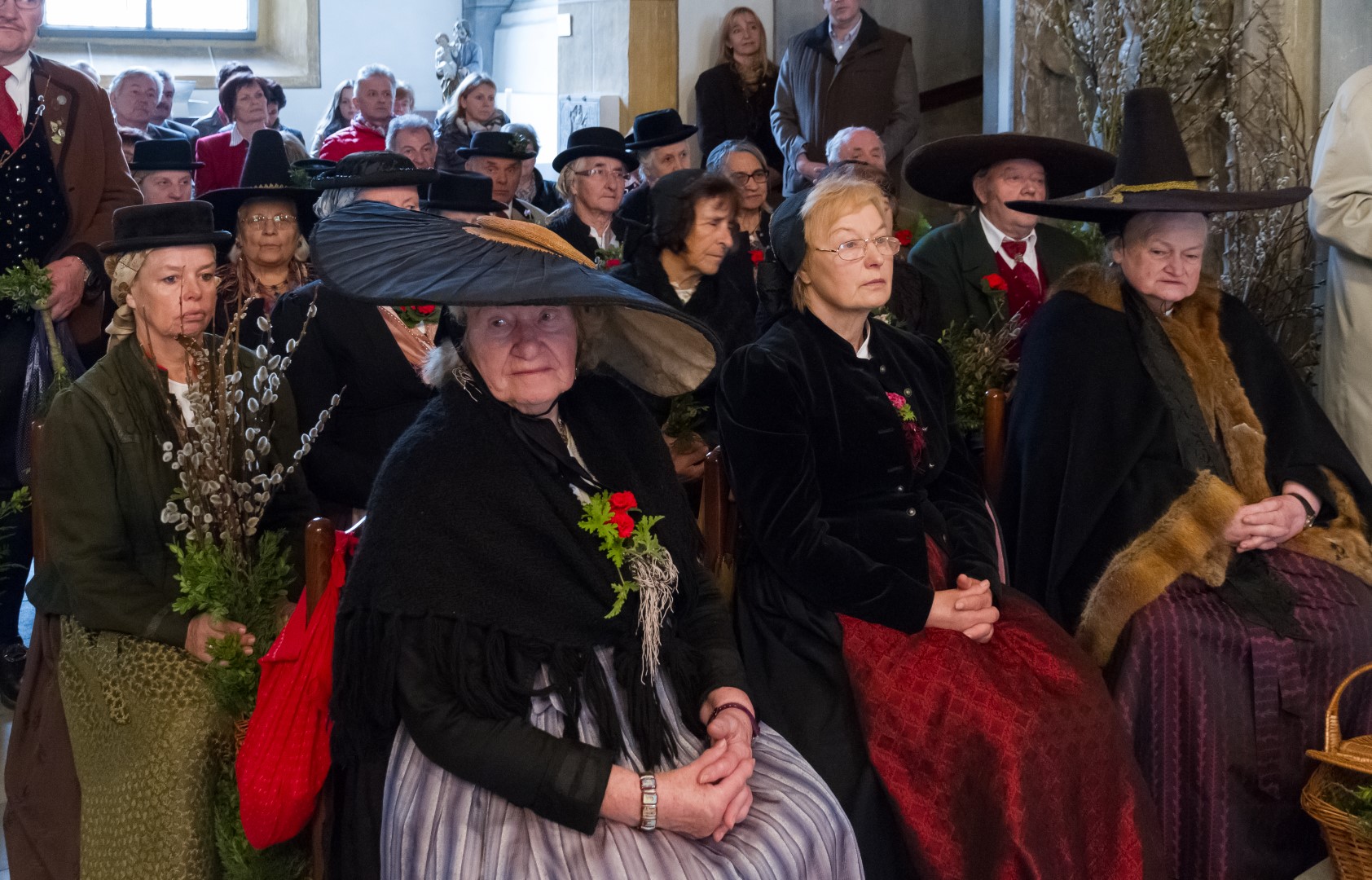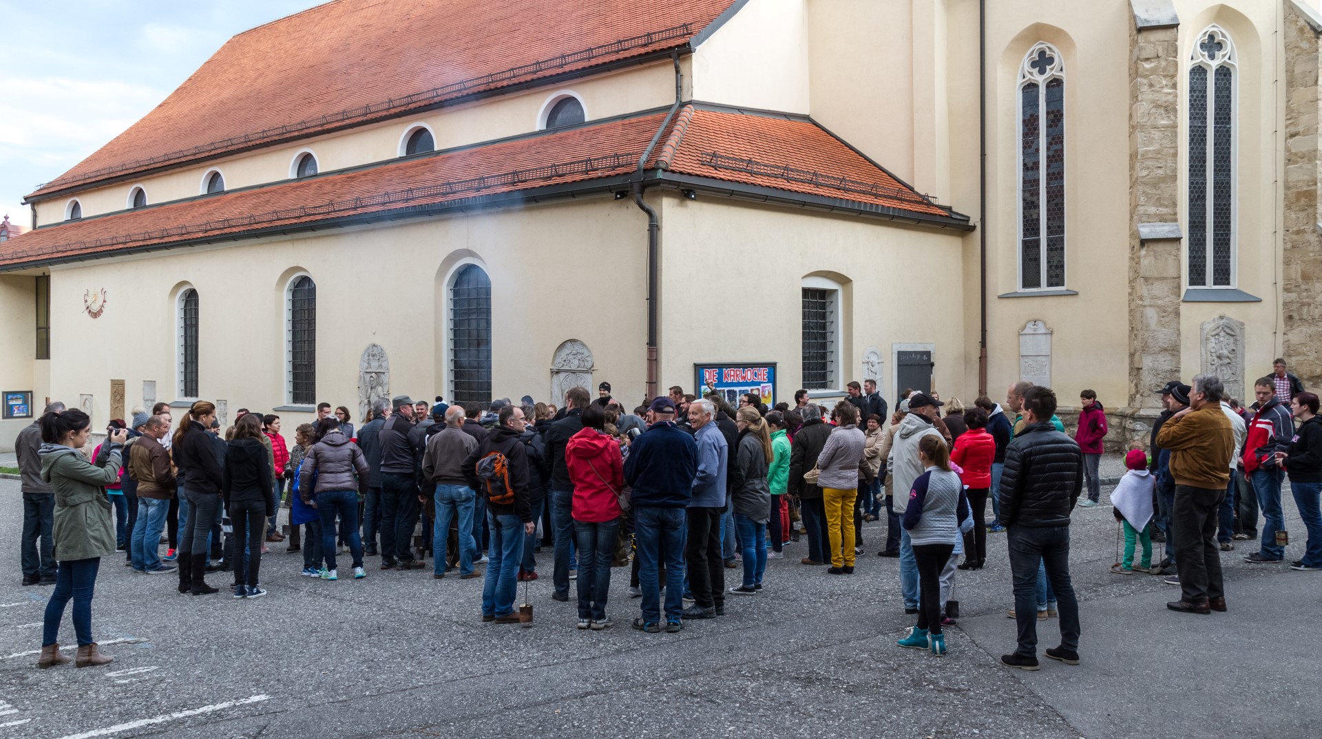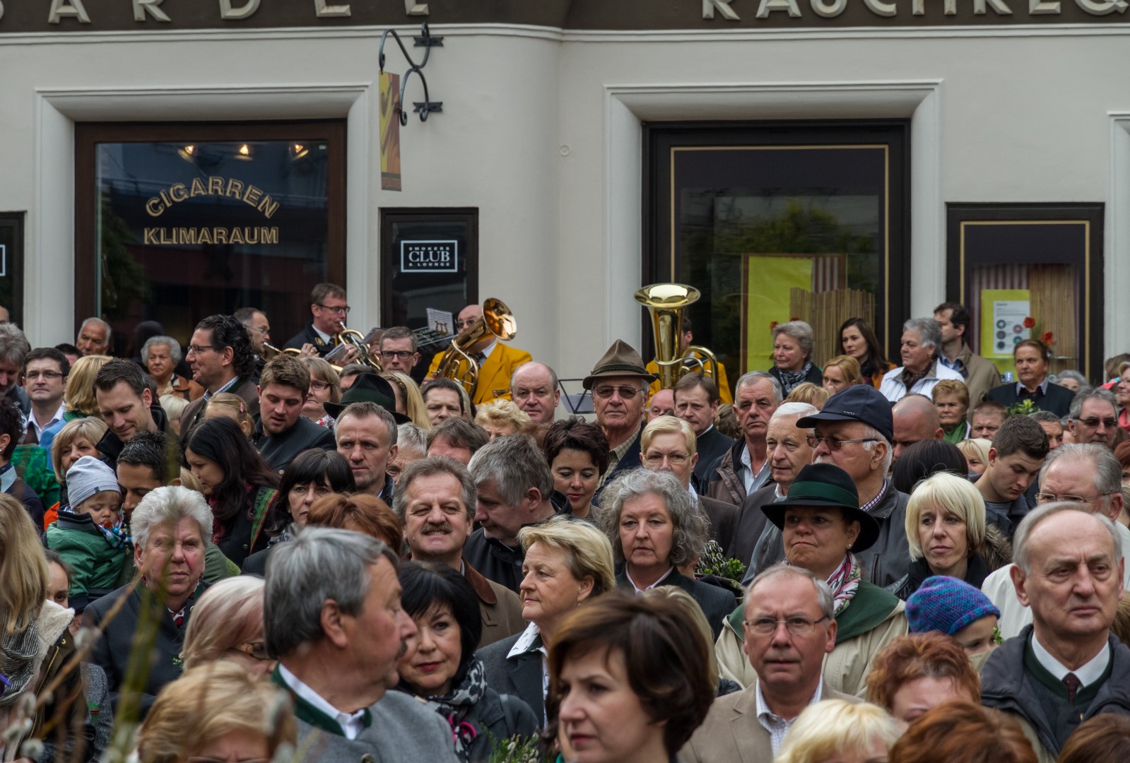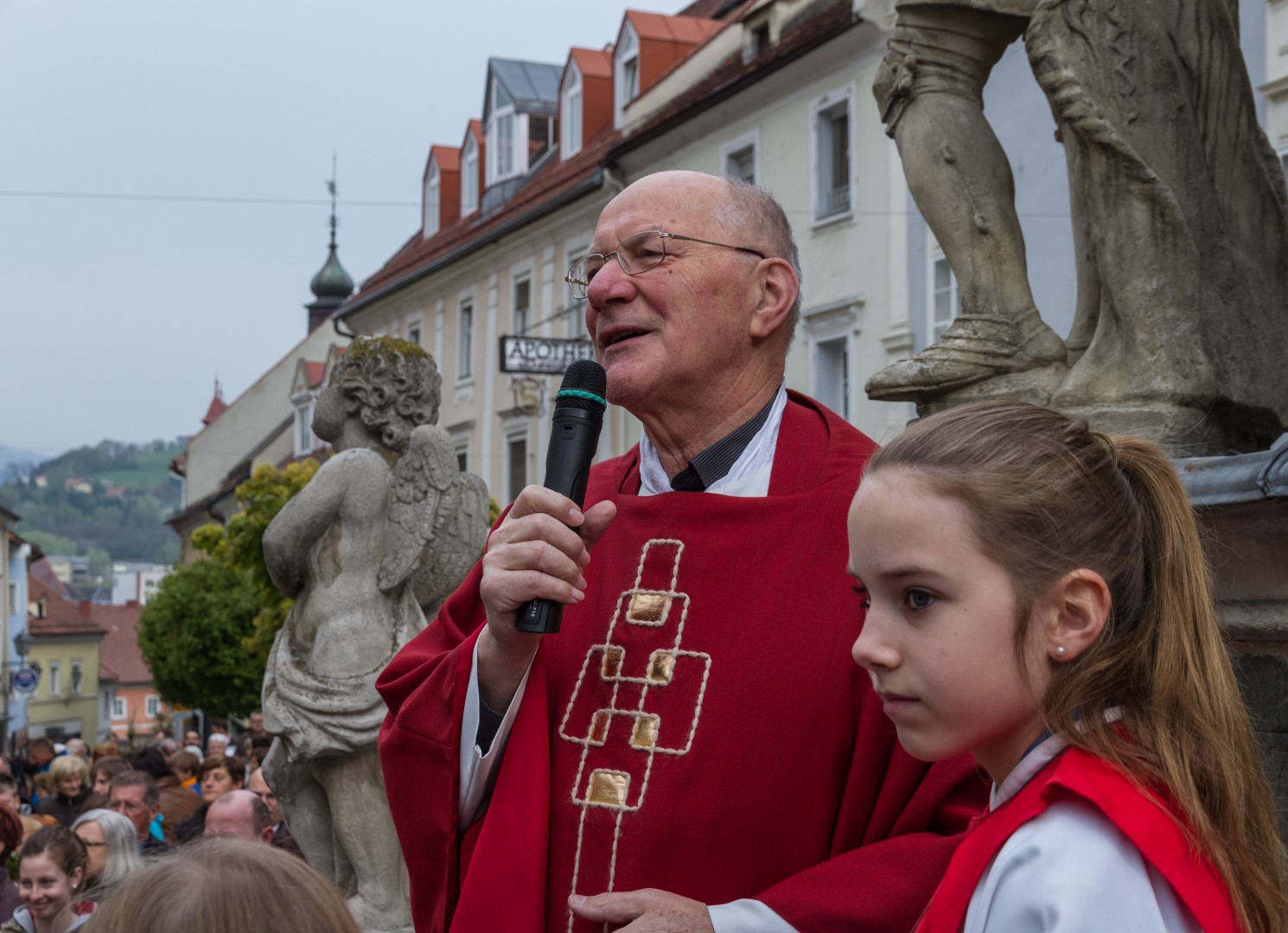 Eine Vielzahl an Gläubigen versammelte sich zur Palmweihe am Hohen Platz um die Mariensäule, unter ihnen selbstverständlich auch die Mitglieder der Brauchtumsgruppe Wolfsberg-Lavanttal mit prächtigen, eigengefertigten Palmbesen. Ein Bläserquartett der Stadtkapelle übernahm die musikalische Gestaltung.