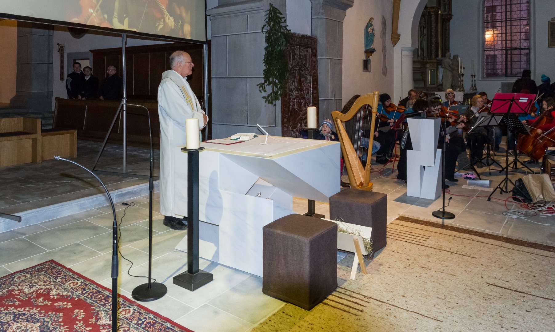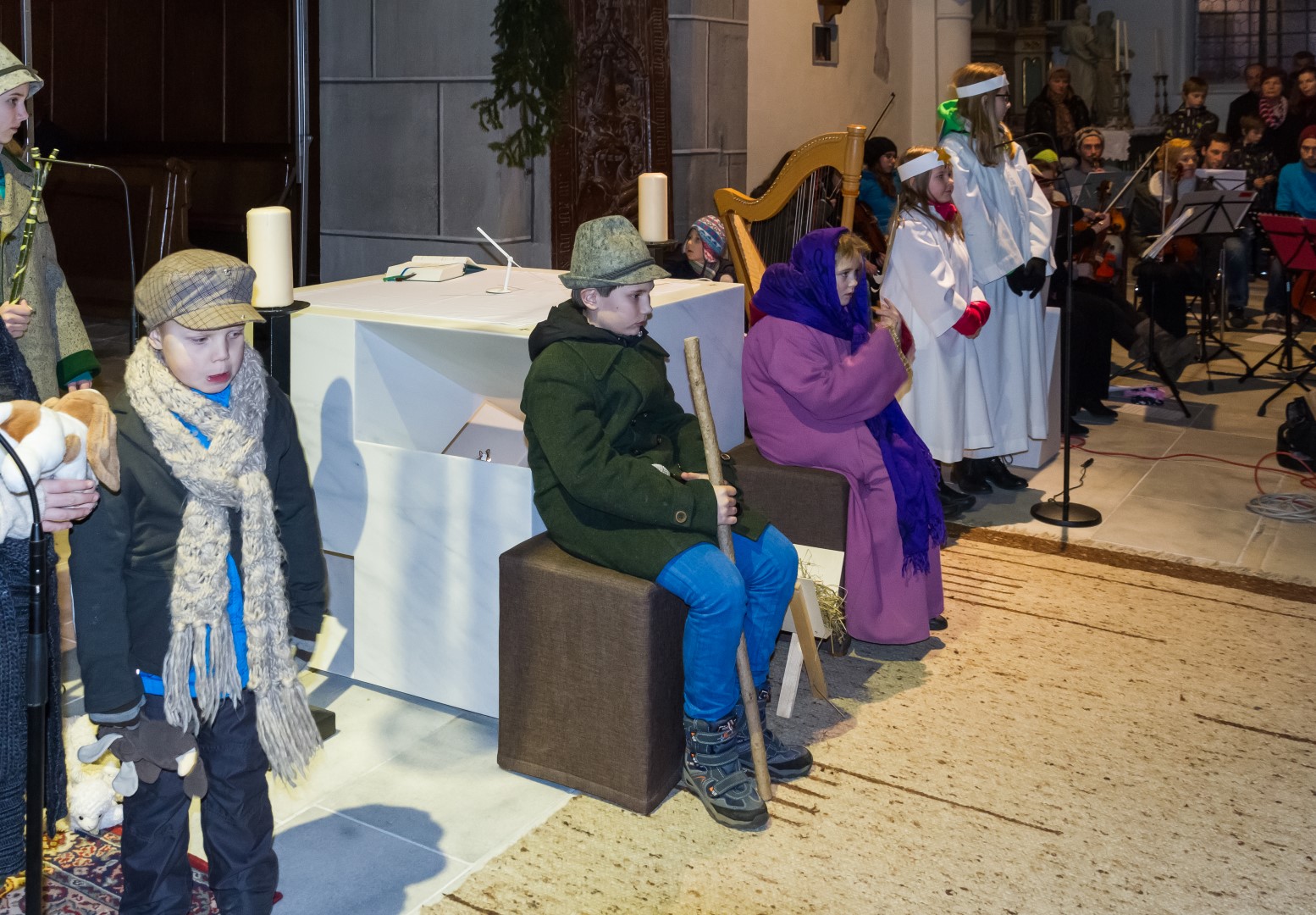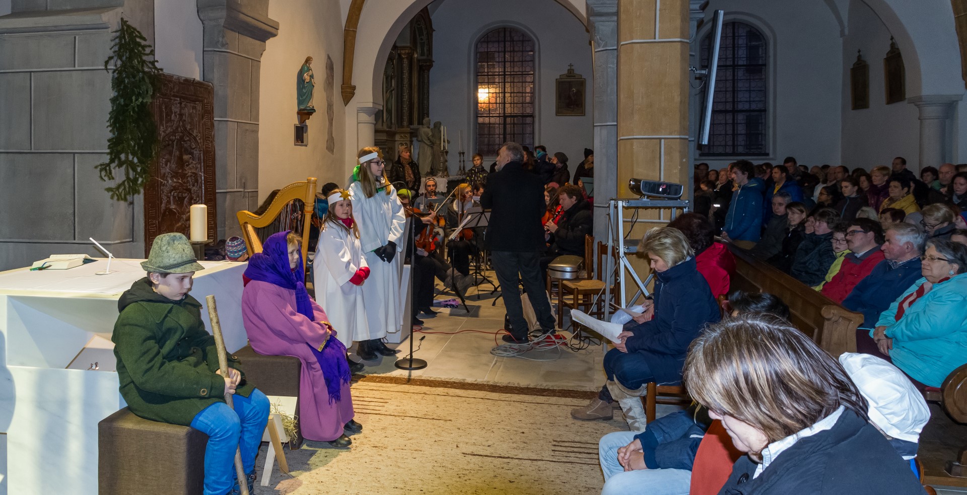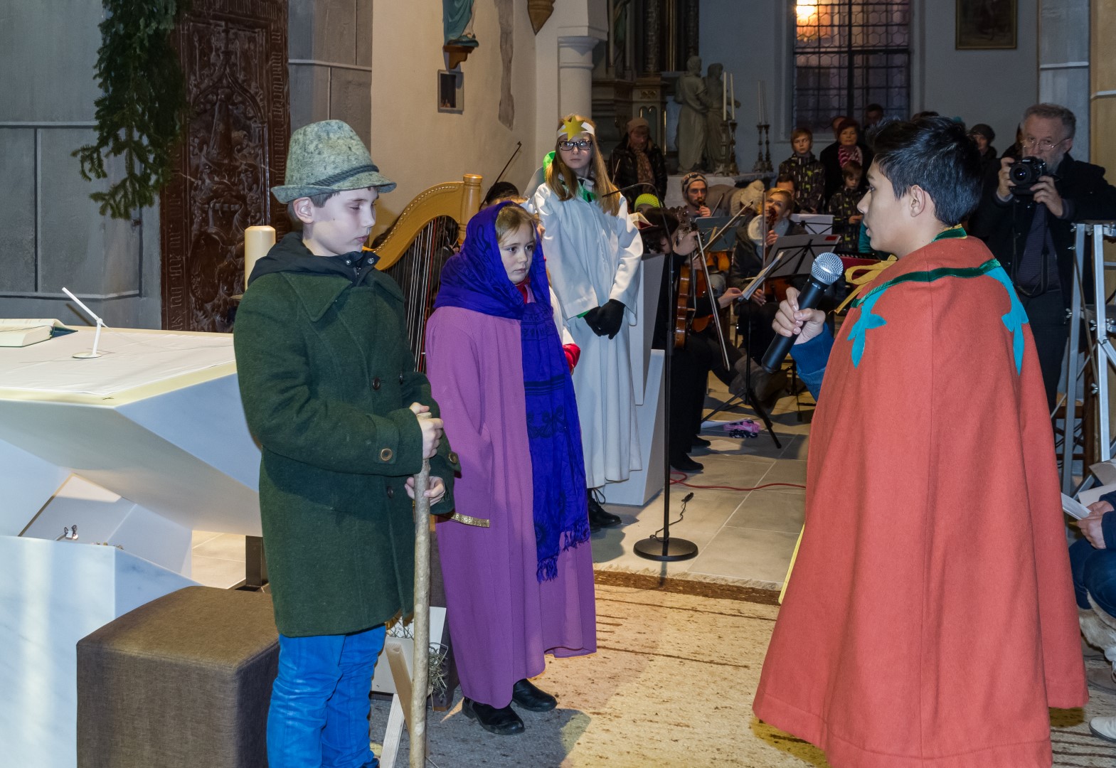 Den Kern der Kinderchristmette bildete wie stets ein von den MI-MA-Kindern (Ministranten und Markusspatzen) dargebrachtes Krippenspiel, das Geschehen in Bethlehem in kindlich-schöner Weise zum Ausdruck bringend. Herr Prof. Mag. Josef Barth war persönlich anwesend um mit einer digitalen Spiegelreflexkamera und einem Beamer den Ablauf der Feier, speziell aber das Krippenspiel und das Streicher-Ensemble, für alle Anwesenden möglichst gut einsehbar auf eine Großbild-Leinwand zu übertragen.