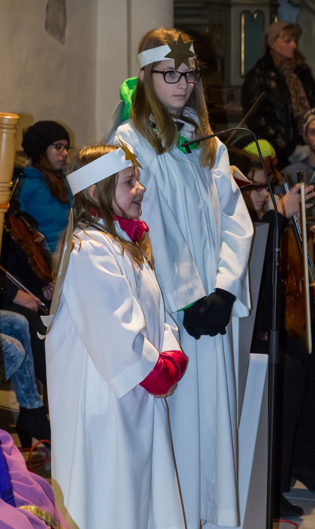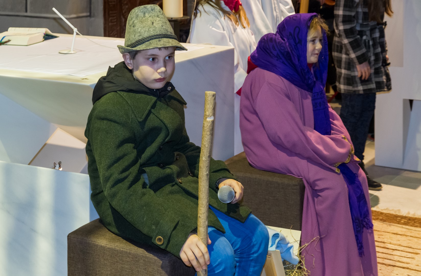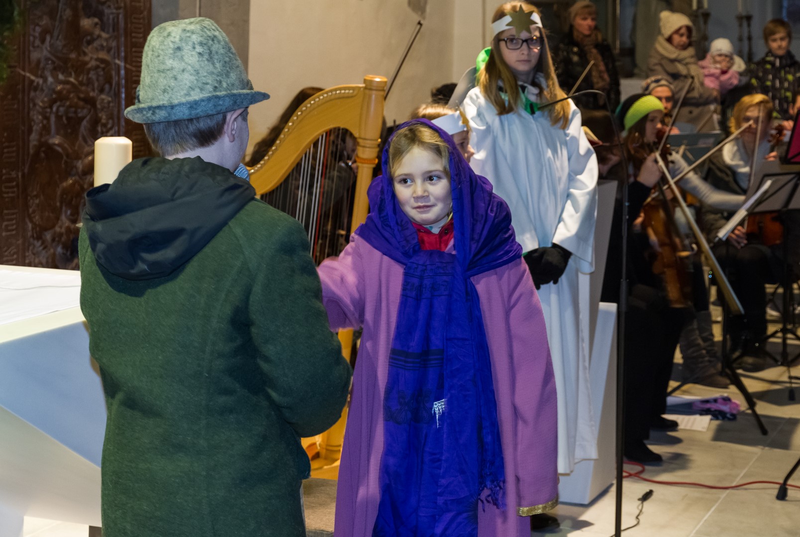 Den Kern der Kinderchristmette bildete wie stets ein von den MI-MA-Kindern (Ministranten und Markusspatzen) dargebrachtes Krippenspiel, das Geschehen in Bethlehem in kindlich-schöner Weise zum Ausdruck bringend. Herr Prof. Mag. Josef Barth war persönlich anwesend um mit einer digitalen Spiegelreflexkamera und einem Beamer den Ablauf der Feier, speziell aber das Krippenspiel und das Streicher-Ensemble, für alle Anwesenden möglichst gut einsehbar auf eine Großbild-Leinwand zu übertragen.