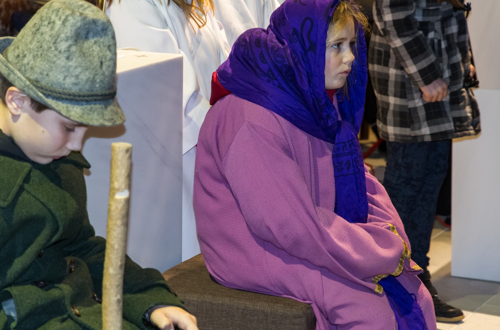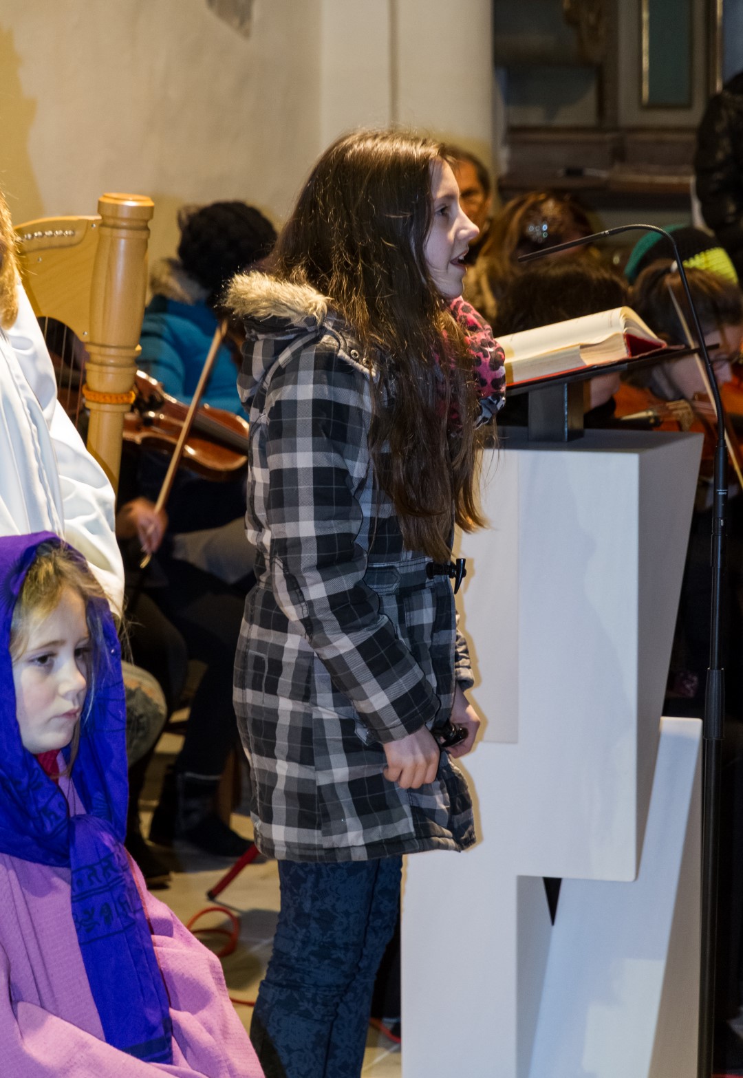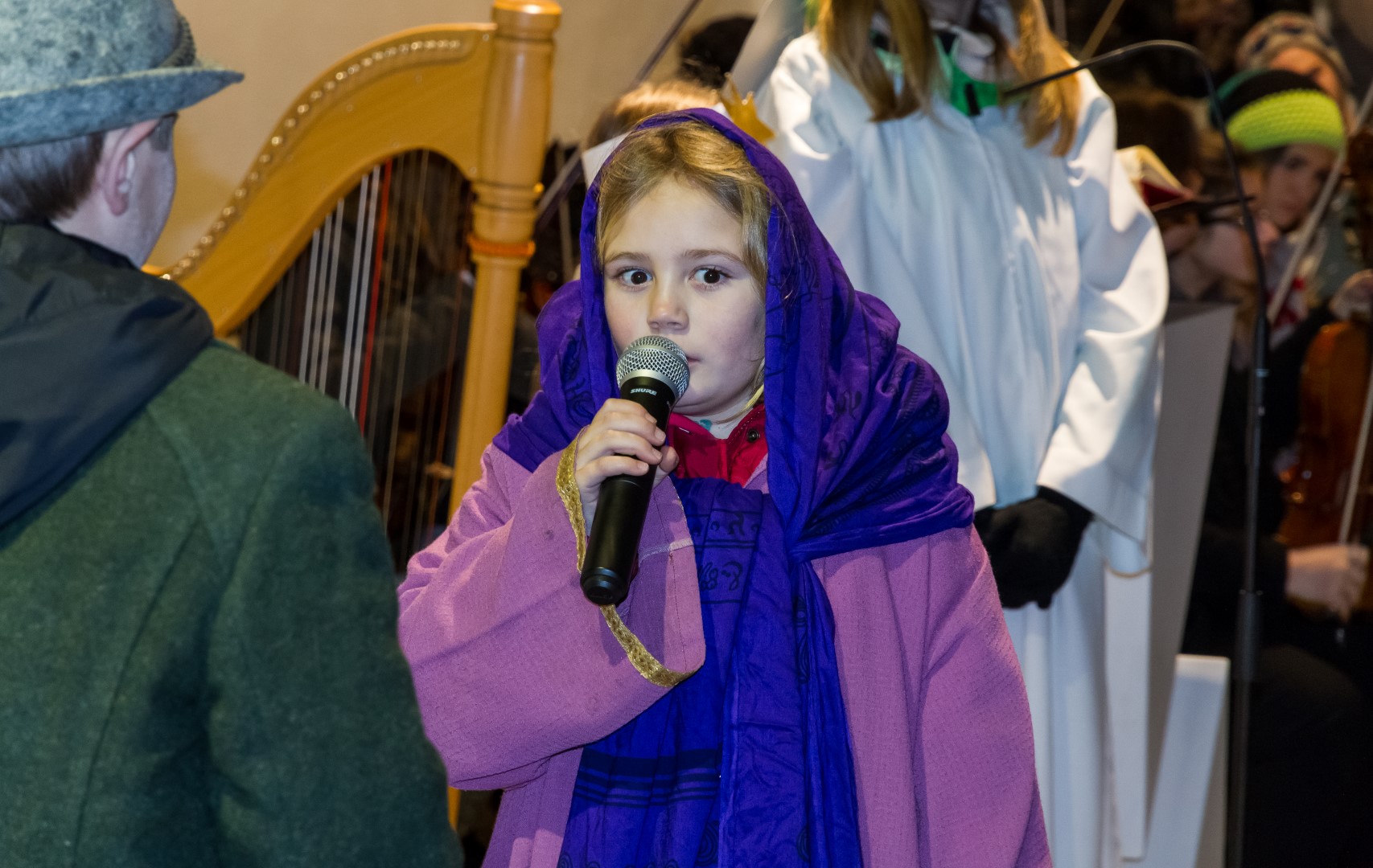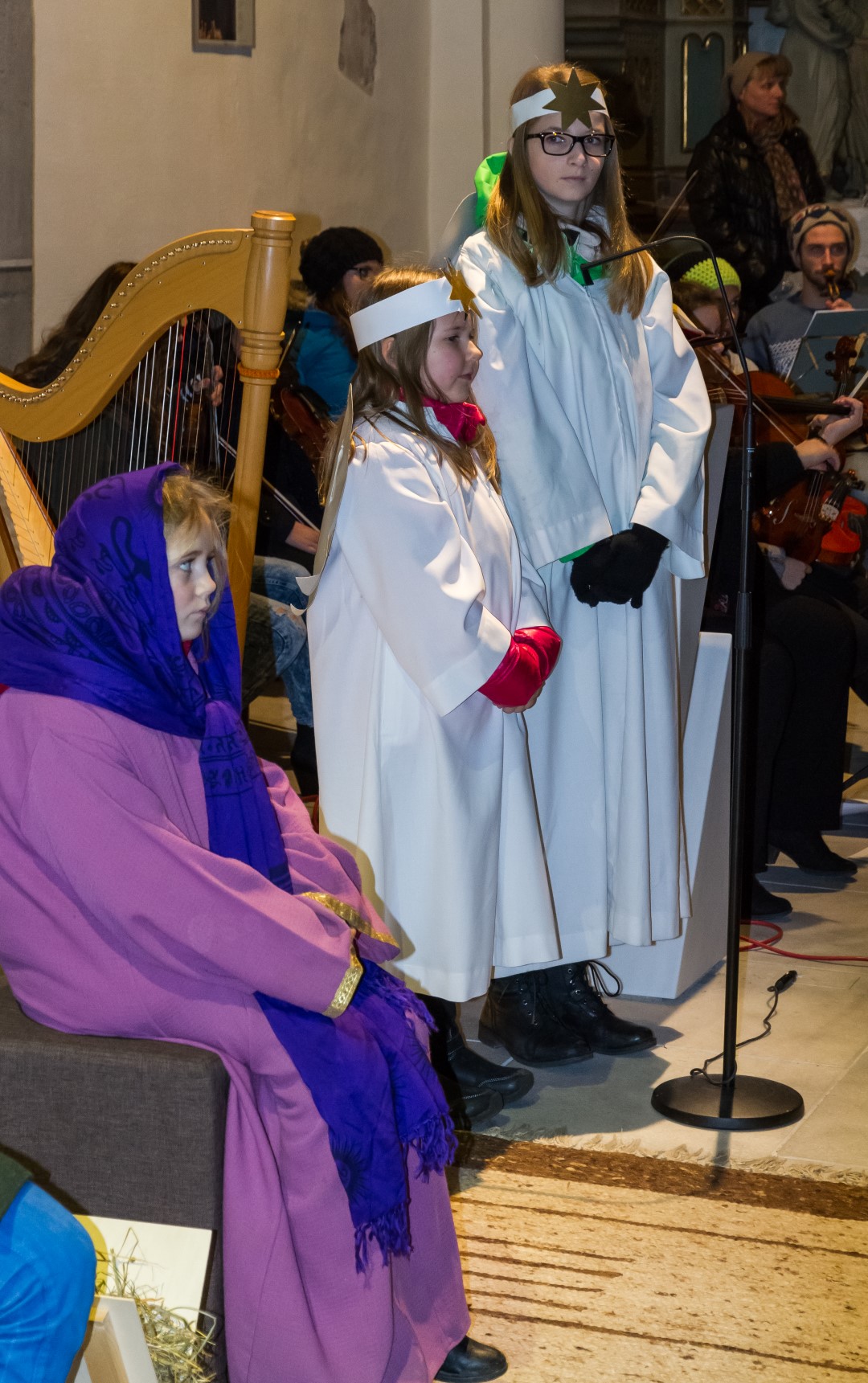 Den Kern der Kinderchristmette bildete wie stets ein von den MI-MA-Kindern (Ministranten und Markusspatzen) dargebrachtes Krippenspiel, das Geschehen in Bethlehem in kindlich-schöner Weise zum Ausdruck bringend. Herr Prof. Mag. Josef Barth war persönlich anwesend um mit einer digitalen Spiegelreflexkamera und einem Beamer den Ablauf der Feier, speziell aber das Krippenspiel und das Streicher-Ensemble, für alle Anwesenden möglichst gut einsehbar auf eine Großbild-Leinwand zu übertragen.