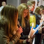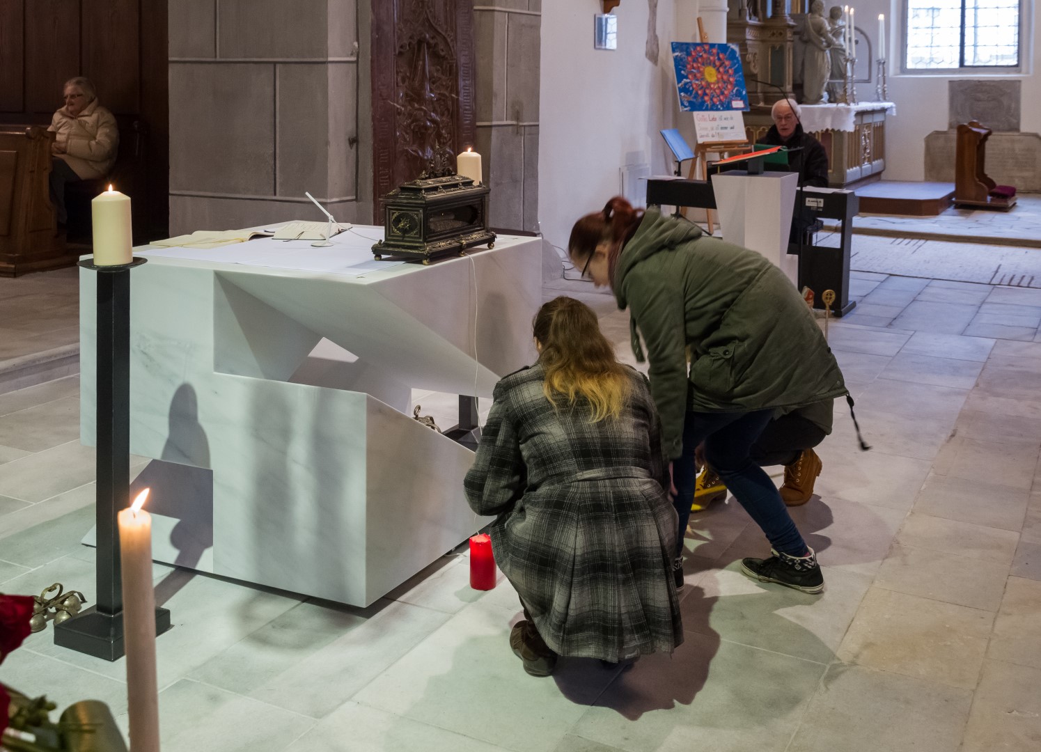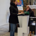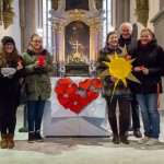 Im Anschluss an den Gottesdienst wurden vor dem Hauptportal der Markuskirche Pralinen der „Naschen mit FAIRstand-Aktion“ verkauft und kleine Valentins-Herzen verteilt, sodann stellte man sich gemeinsam mit Herrn Prof. Karl Traußnig zum Gruppenfoto vor dem neuen Volksaltar auf (© Herr Mag. Bernhard Wagner).
