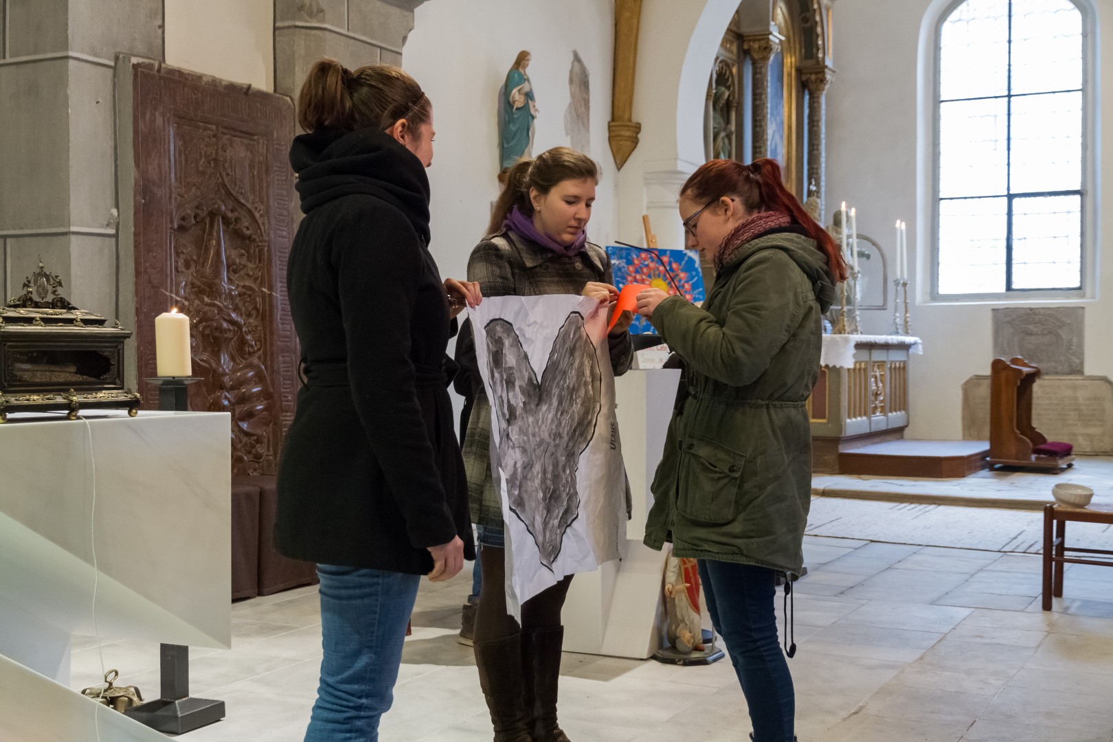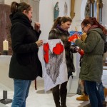 Die anwesenden Firmlinge befestigen rote Valentinsherzen … (© Herr Mag. Bernhard Wagner)