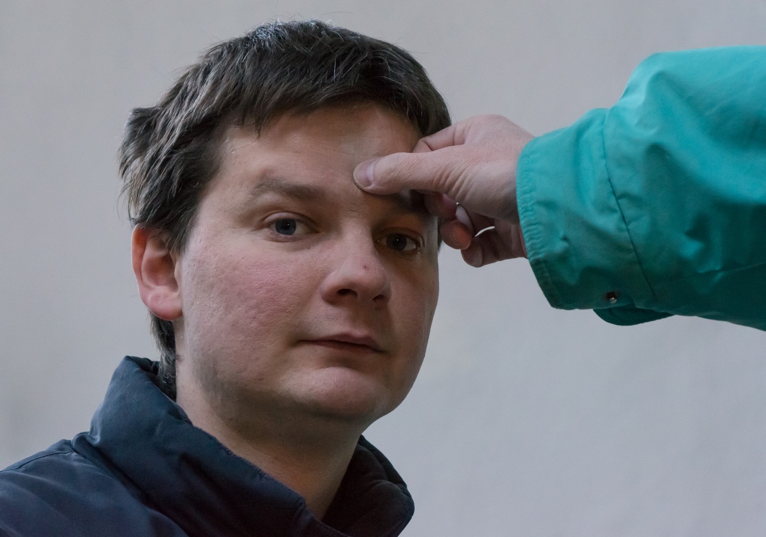 Stadtpfarrmessner Herr Markus Karner bekommt in der Turmkapelle der Markuskirche das Aschenkreuz aufgelegt (© Herr Mag. Bernhard Wagner).