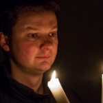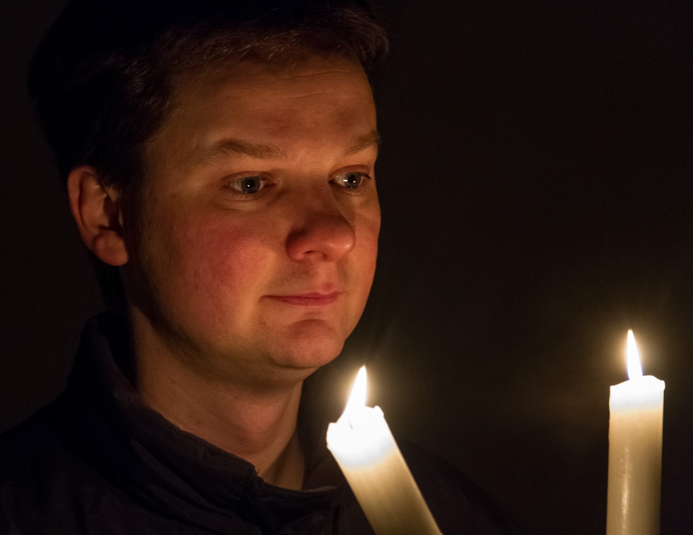 Stadtpfarrmessner Herr Markus Karner mit überkreuzten Kerzen zum Blasiussegen in der Turmkapelle der Markuskirche (© Herr Mag. Bernhard Wagner).
