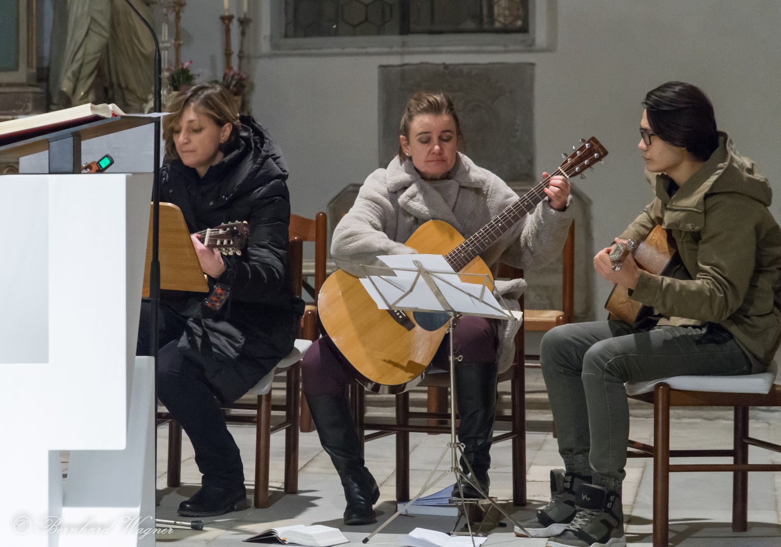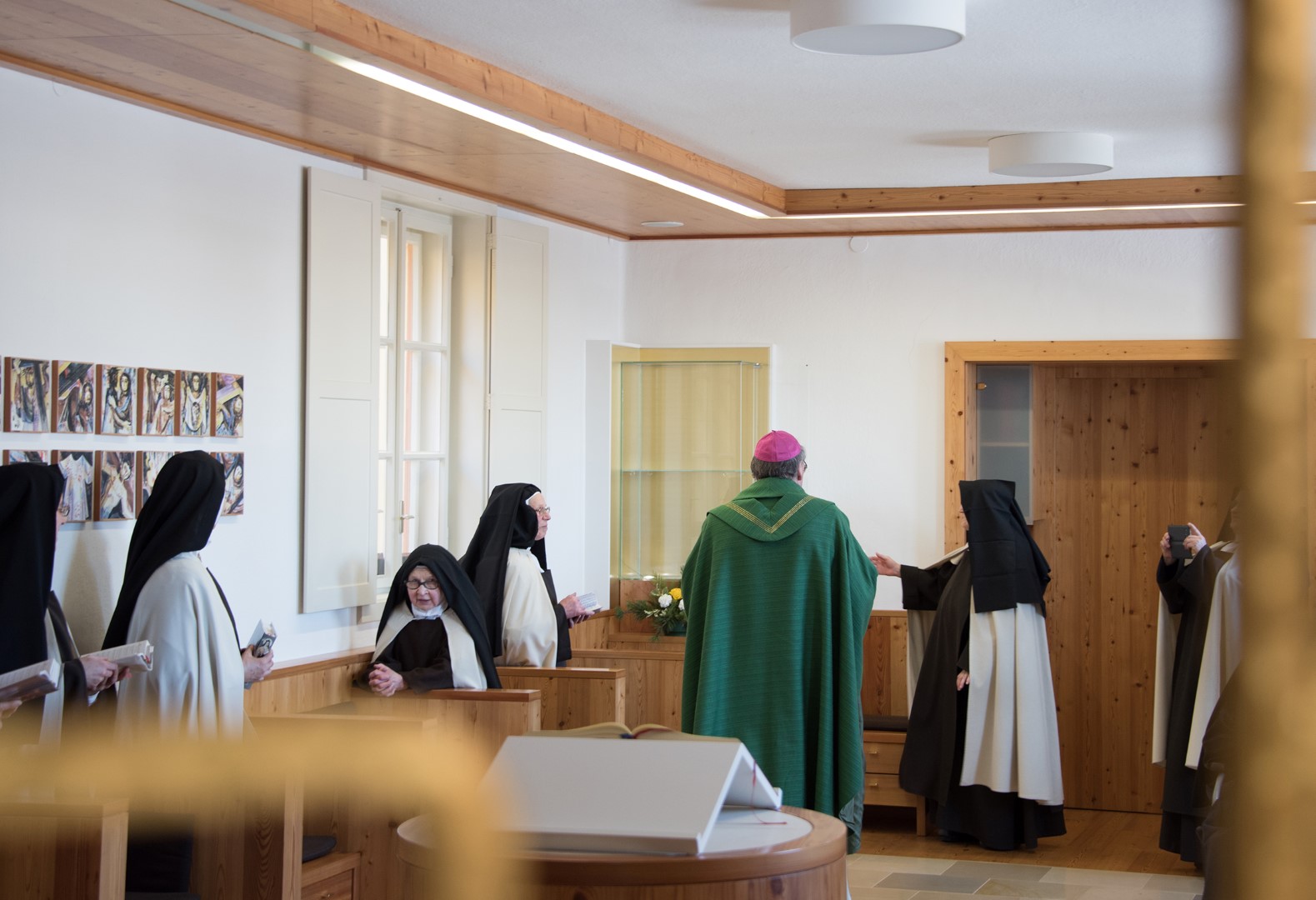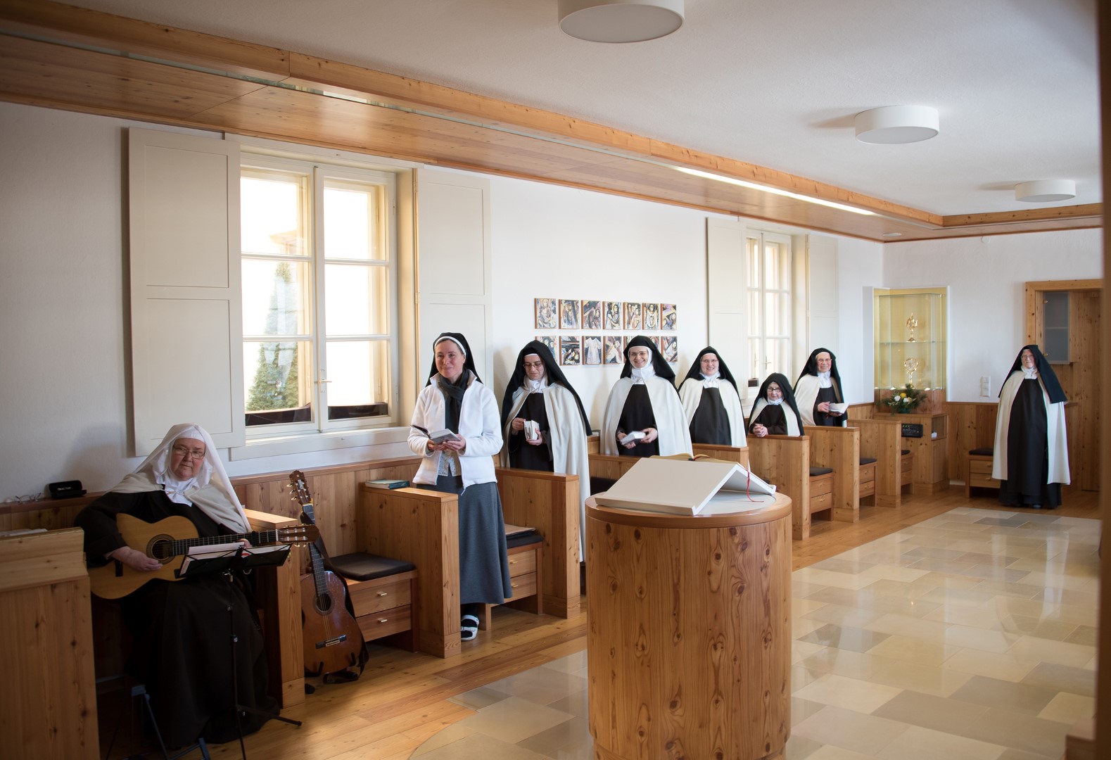 Blick in den Gebetsraum zu den Schwestern, die Feier wird auch mit Gitarrenklängen musikalisch umrahmt.