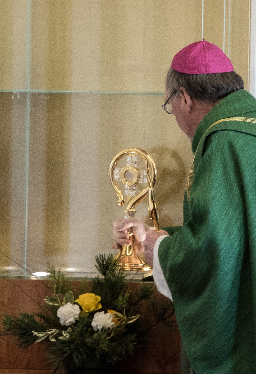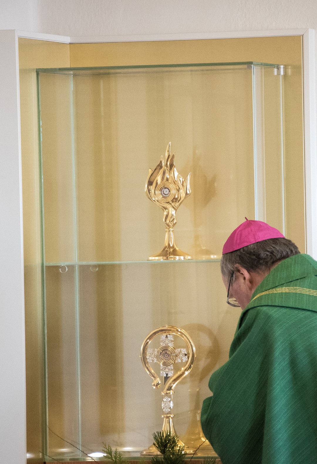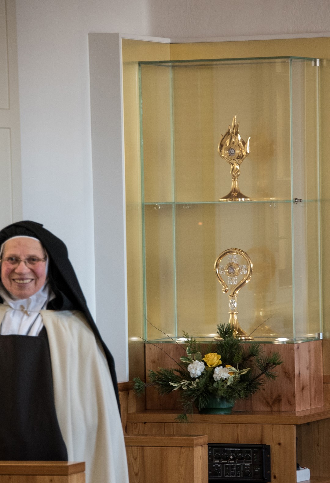 Bischof Schwarz mit einer der Schwestern neben dem für die Reliquiengefäße vorgesehenen Glasschrein.