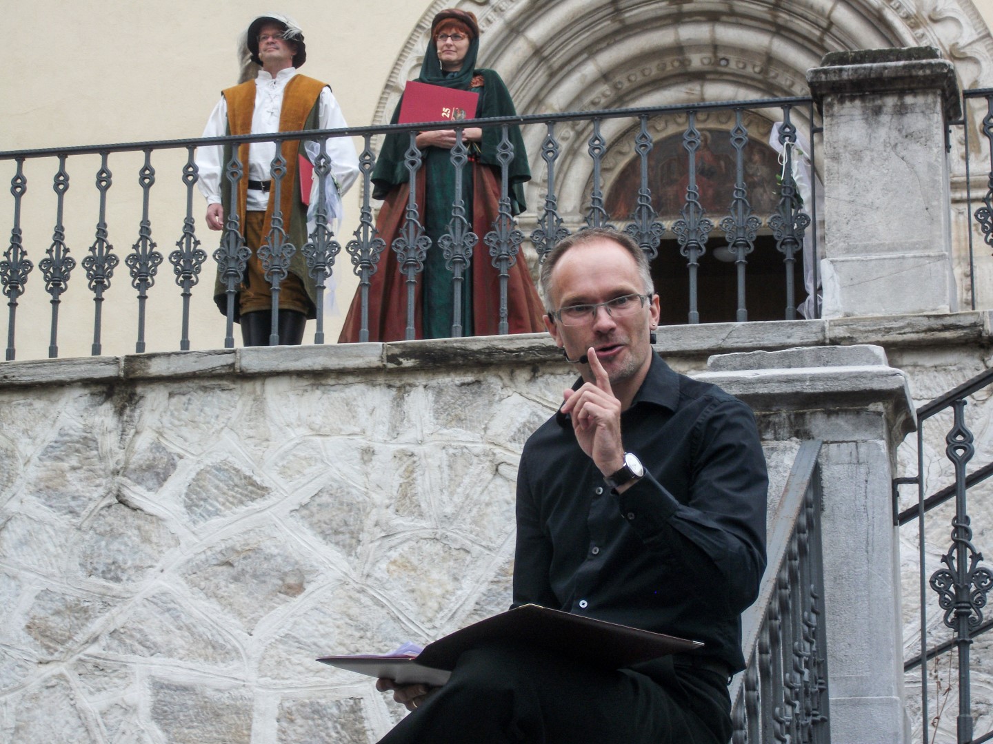 Unter diesem Leitwort gestalteten wir am 13. Juli einen Festgottesdienst zu Ehren des Heiligen Bamberger Herrscherpaares Heinrich und Kunigunde, die auch in unserer Kirche mehrmals dargestellt sind. Danach gab es eine Audienz vor der Kirche, wobei der Stiegenaufgang am Schulplatz zur „Kaiserstiege“ erhoben wurde. Unter einer Festfanfare der Stadtkapelle erschien das Kaiserpaar, dargestellt von Spielern der Markusbühne. Sie rezitierten einen Festprolog, verfasst von Mag. Igor Pucker und Heimo Töfferl, in dem viele Ereignisse aus der Geschichte unserer Stadt Gegenwart wurden. Nach einem feierlichen Segensgebet über die Stadt und dem „Te Deum“ waren alle Mitfeiernden zu einer Agape eingeladen, wo Wein und Kunigundis-Brezen serviert wurden.