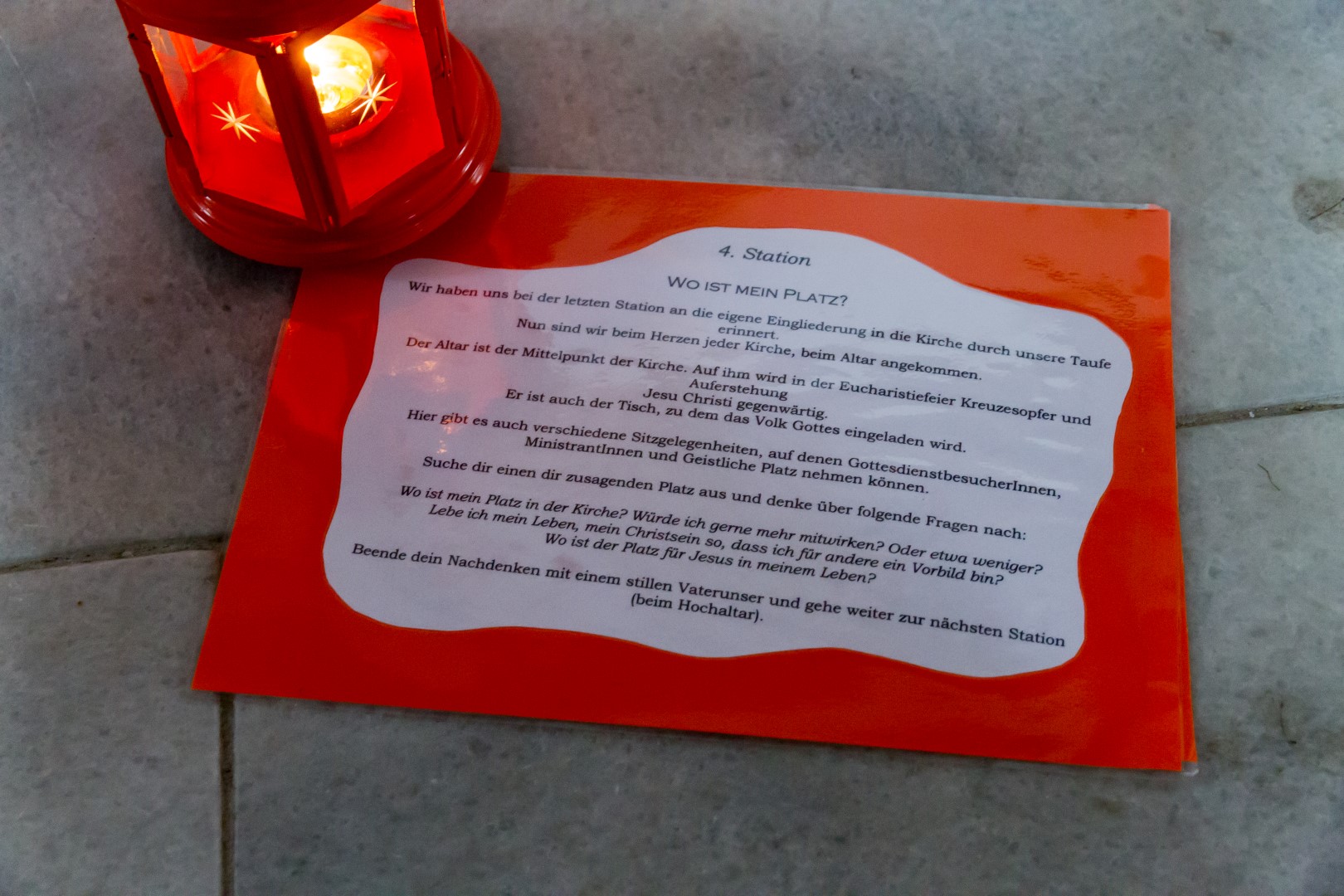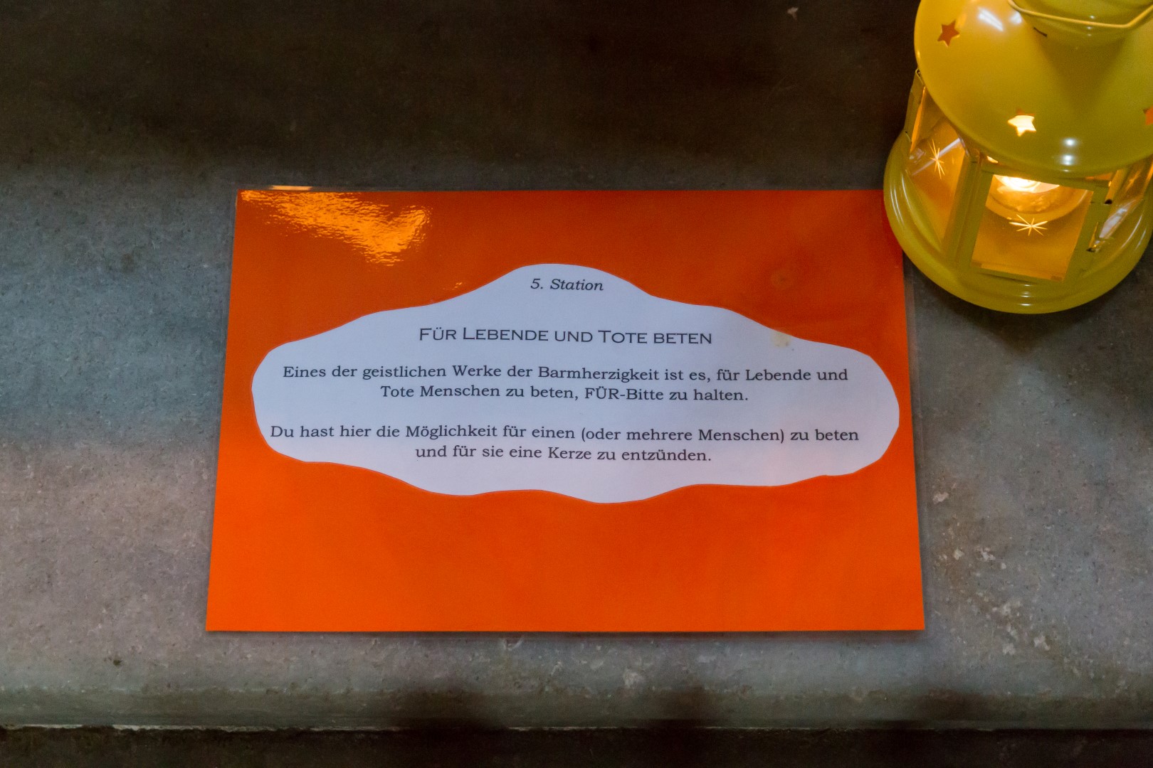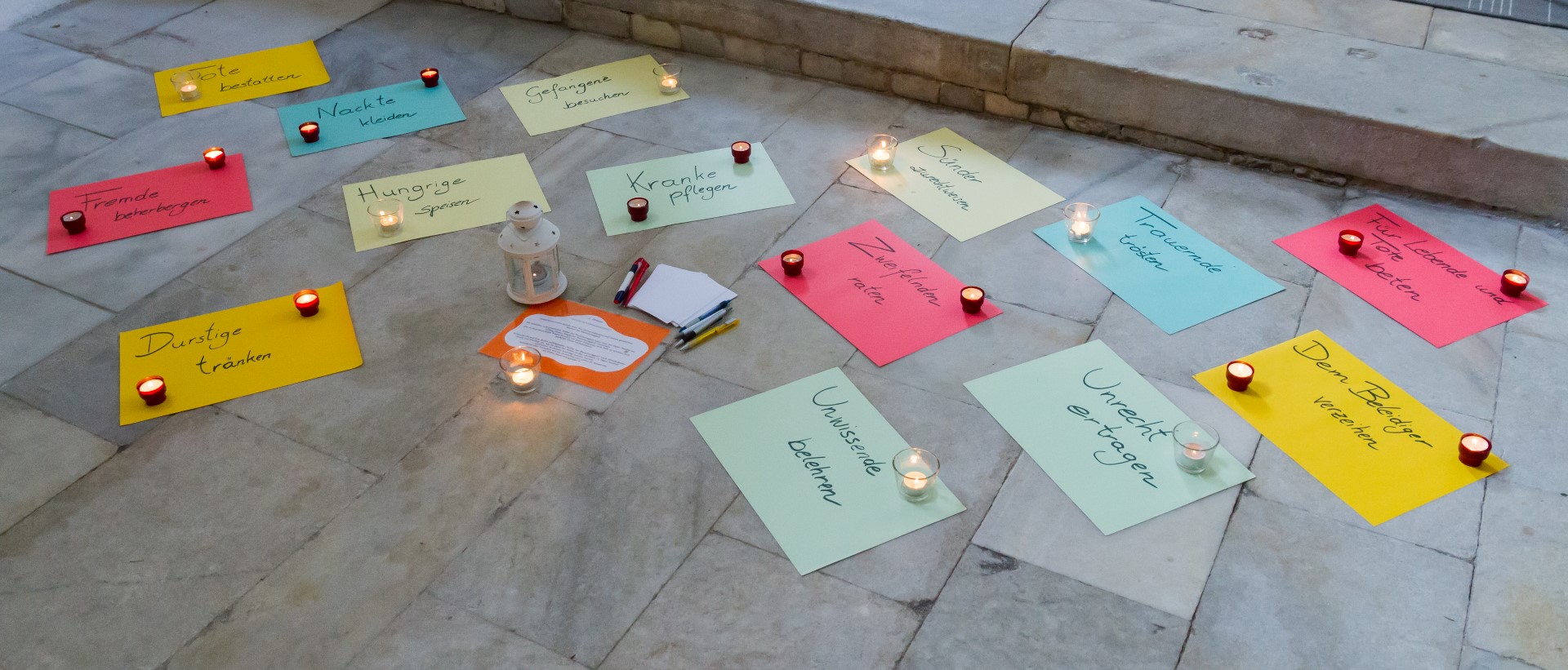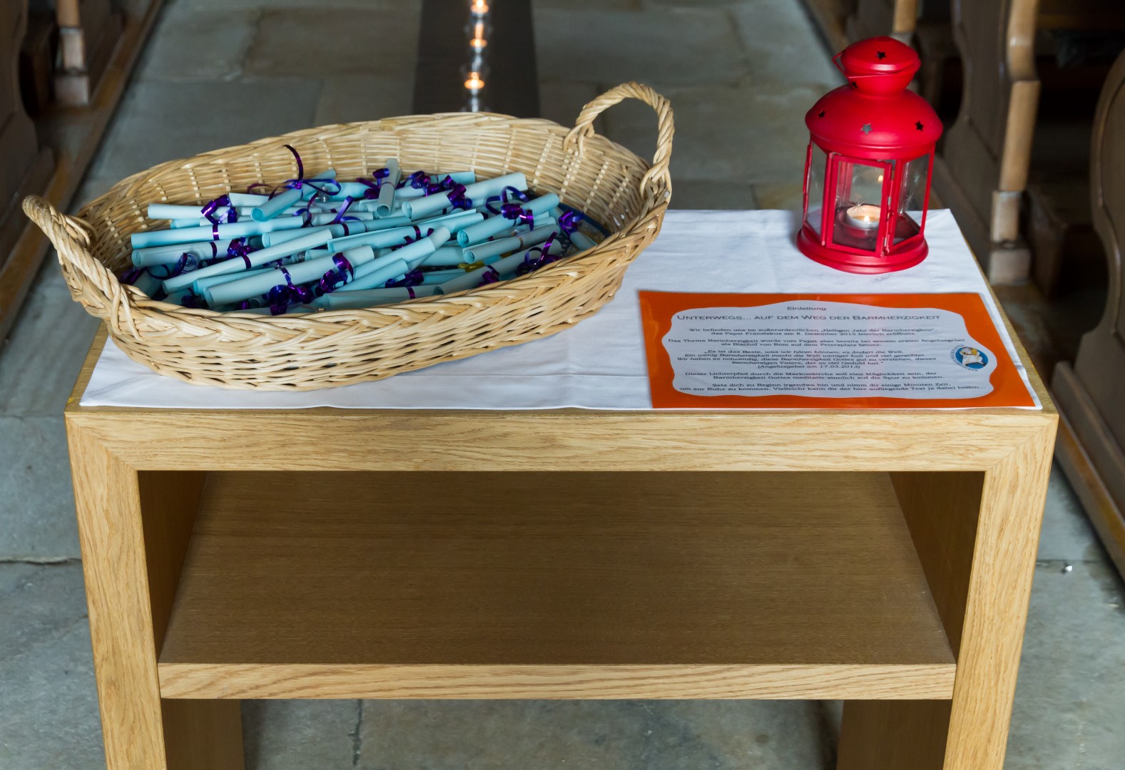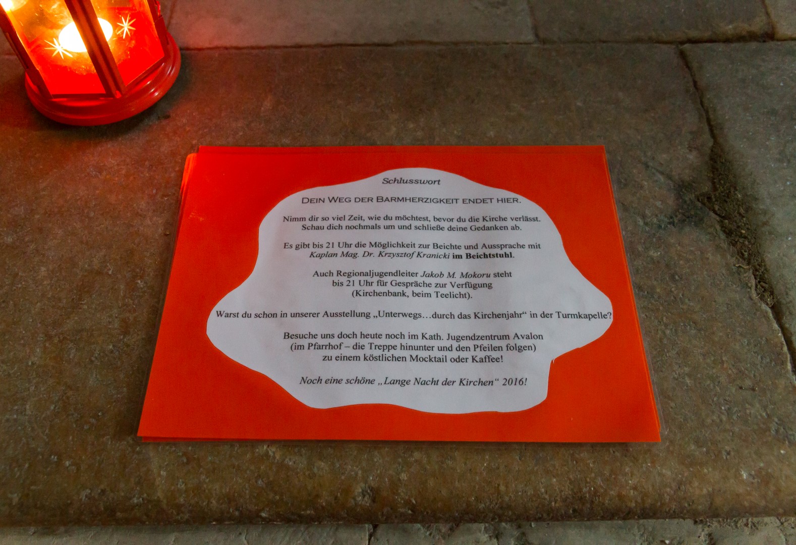 3. Unterwegs … auf dem Weg der Barmherzigkeit: Den Höhepunkt der diesjährigen „Langen Nacht“ in Wolfsberg bildete von 19.30 Uhr bis 21 Uhr ein Lichterpfad welcher zu einem völlig neuen Erleben der Markuskirche Wolfsberg führte. Auf dem Weg konnten die Besucherinnen und Besucher auch die „Pforte der Barmherzigkeit“ in der Markuskirche durchschreiten. Der im Verlauf der Abenddämmerung langsam dunkler werdende Kirchenraum wurde mittels vieler Teelichter in reizvolles Licht getaucht und die Besucherinnen und Besucher hatten die Möglichkeit, an insgesamt sechs Stationen beginnend innerhalb des Hauptportals der Kirche, weiters entlang des nördlichen Seitenschiffes vorbei am Volksaltar hinauf zum Hochaltar und zurück entlang des südlichen Seitenschiffes verschiedene Aufgaben auszuführen sowie in Gebet und Meditation zu verweilen. Darüber hinaus konnte man bei Kaplan Kranicki beichten und mit Regionaljugendleiter Herrn Mokoru ein Gespräch führen.
