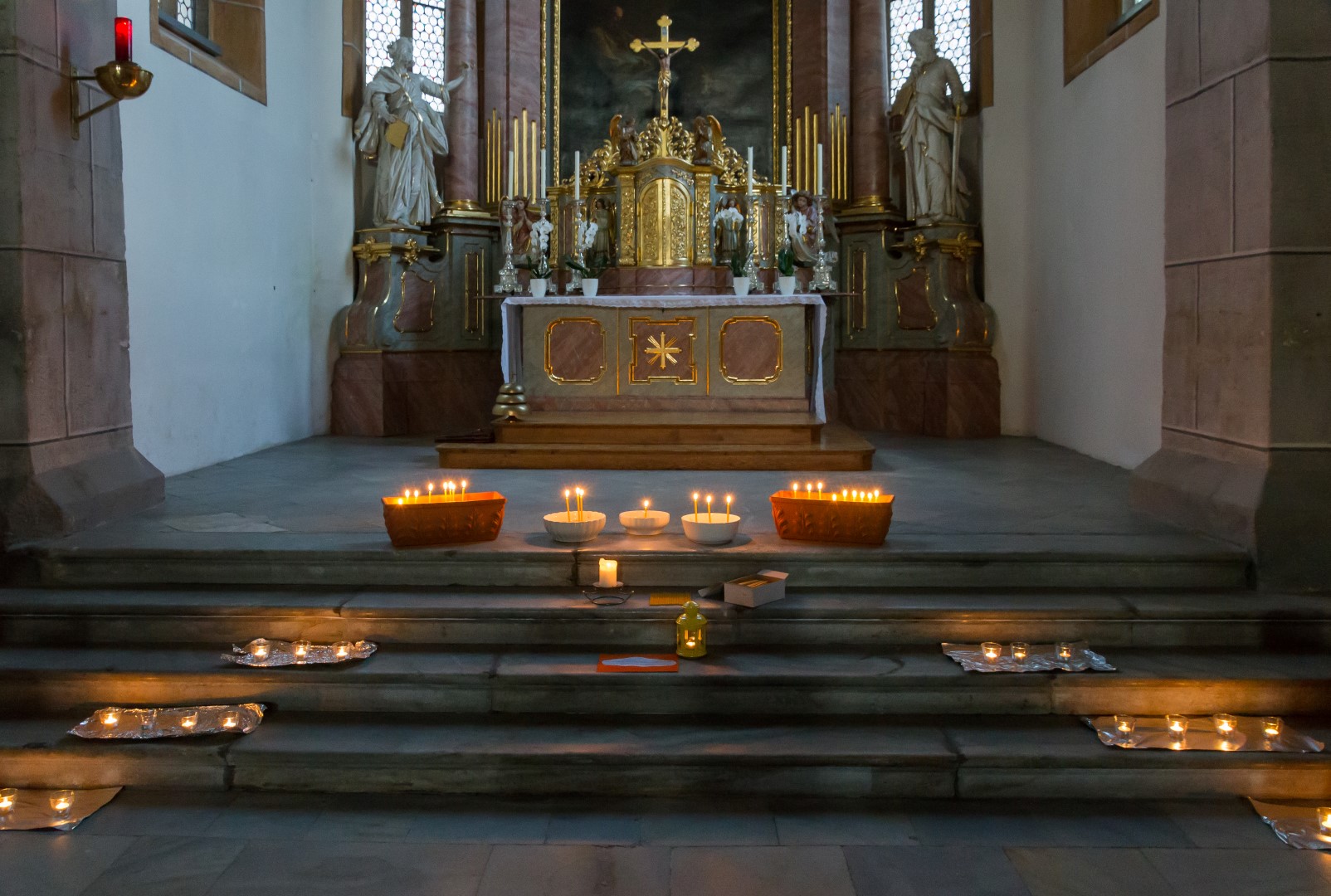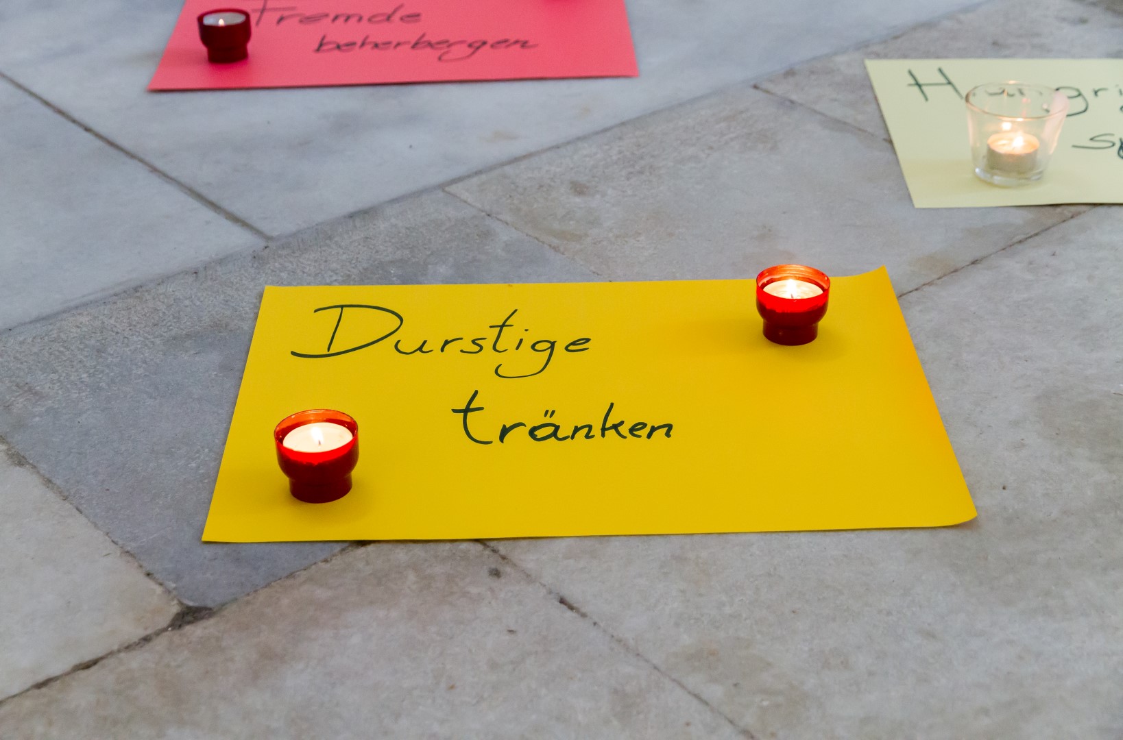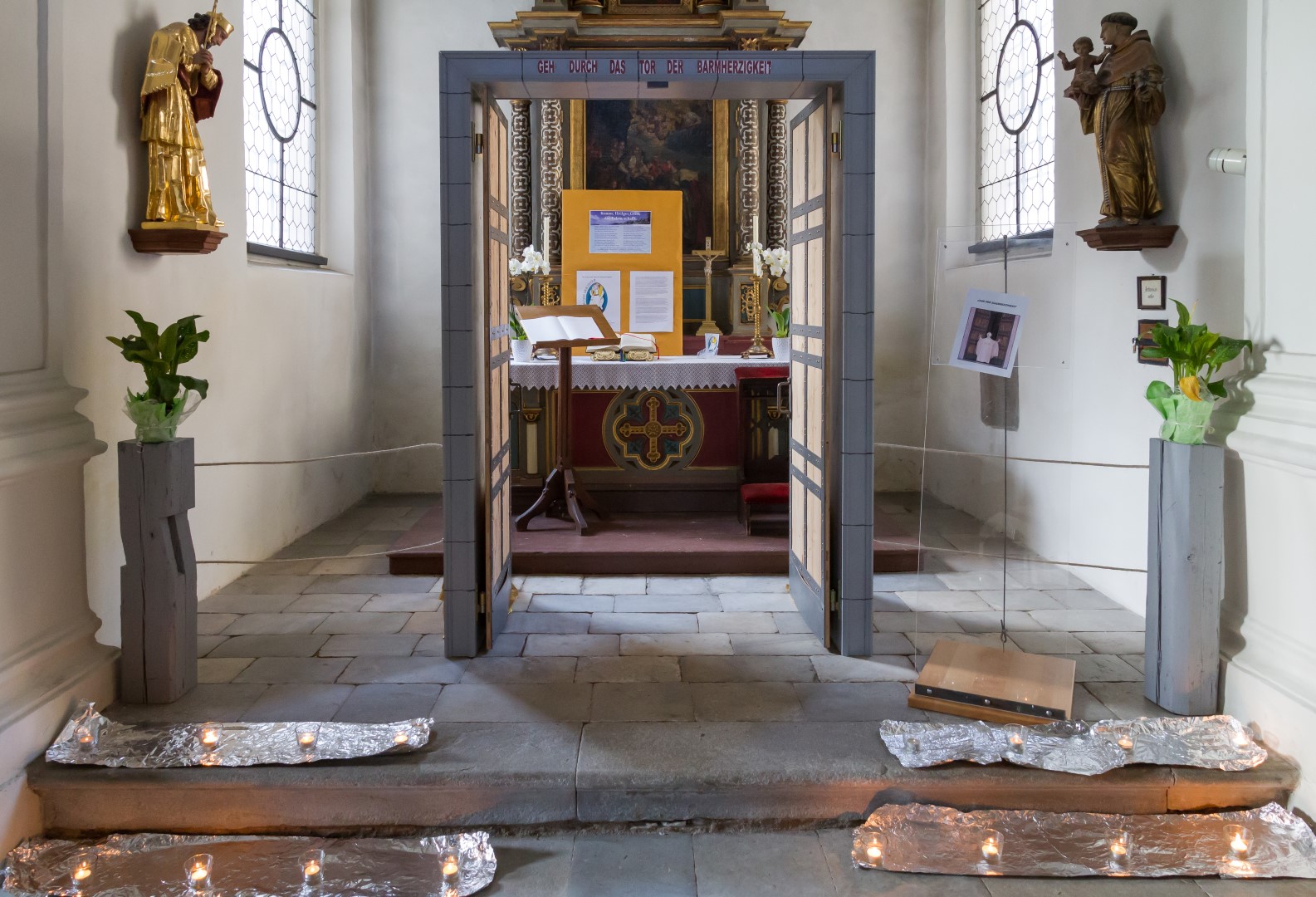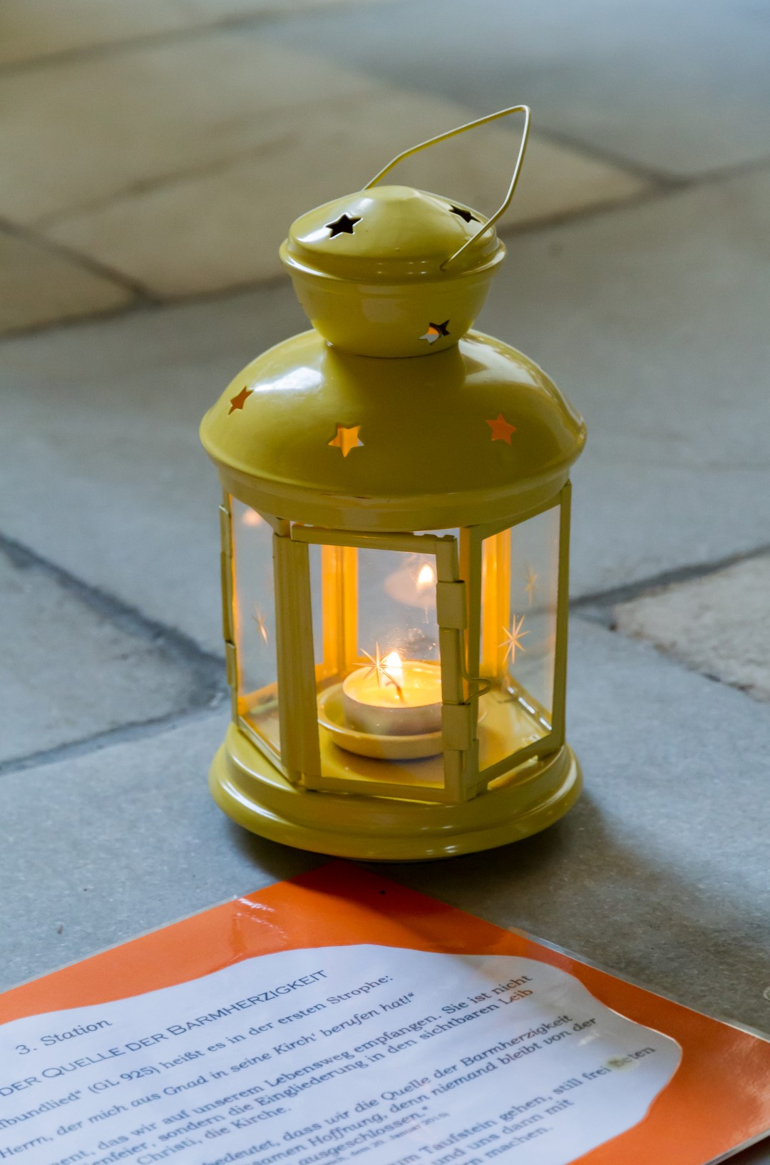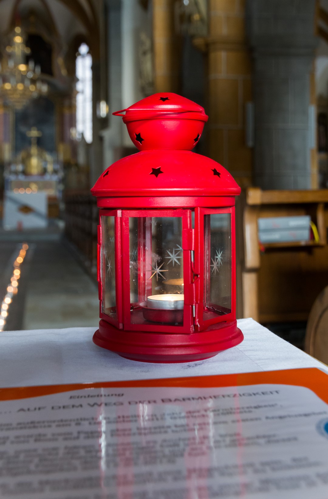 3. Unterwegs … auf dem Weg der Barmherzigkeit: Den Höhepunkt der diesjährigen „Langen Nacht“ in Wolfsberg bildete von 19.30 Uhr bis 21 Uhr ein Lichterpfad welcher zu einem völlig neuen Erleben der Markuskirche Wolfsberg führte. Auf dem Weg konnten die Besucherinnen und Besucher auch die „Pforte der Barmherzigkeit“ in der Markuskirche durchschreiten. Der im Verlauf der Abenddämmerung langsam dunkler werdende Kirchenraum wurde mittels vieler Teelichter in reizvolles Licht getaucht und die Besucherinnen und Besucher hatten die Möglichkeit, an insgesamt sechs Stationen beginnend innerhalb des Hauptportals der Kirche, weiters entlang des nördlichen Seitenschiffes vorbei am Volksaltar hinauf zum Hochaltar und zurück entlang des südlichen Seitenschiffes verschiedene Aufgaben auszuführen sowie in Gebet und Meditation zu verweilen. Darüber hinaus konnte man bei Kaplan Kranicki beichten und mit Regionaljugendleiter Herrn Mokoru ein Gespräch führen.