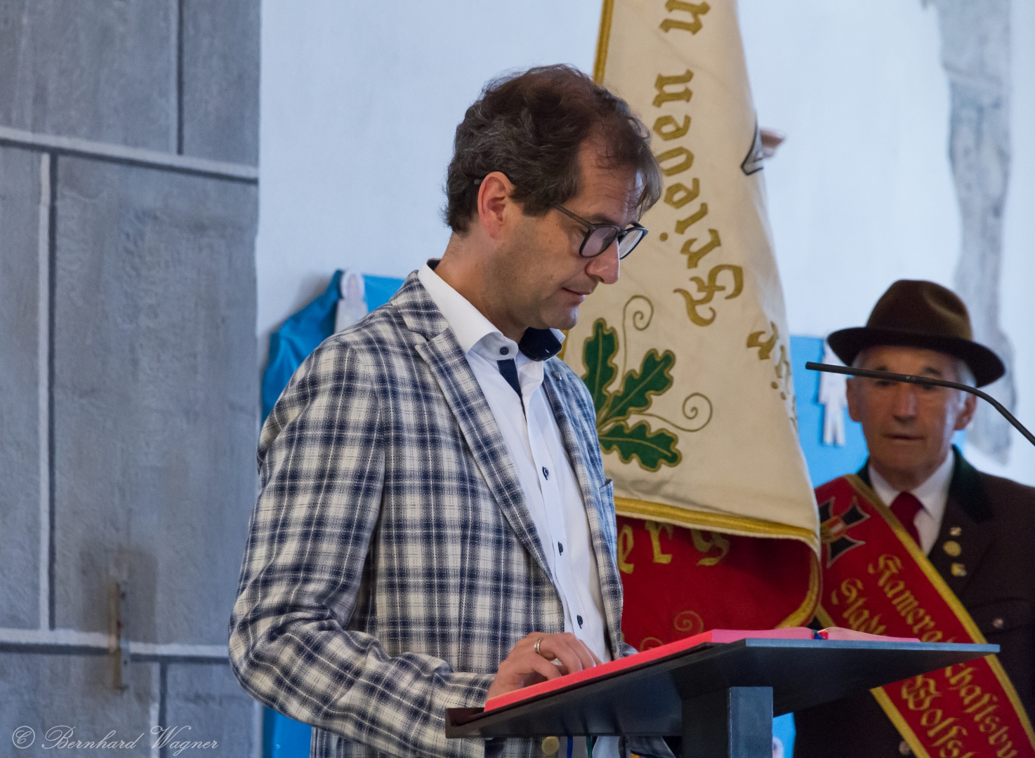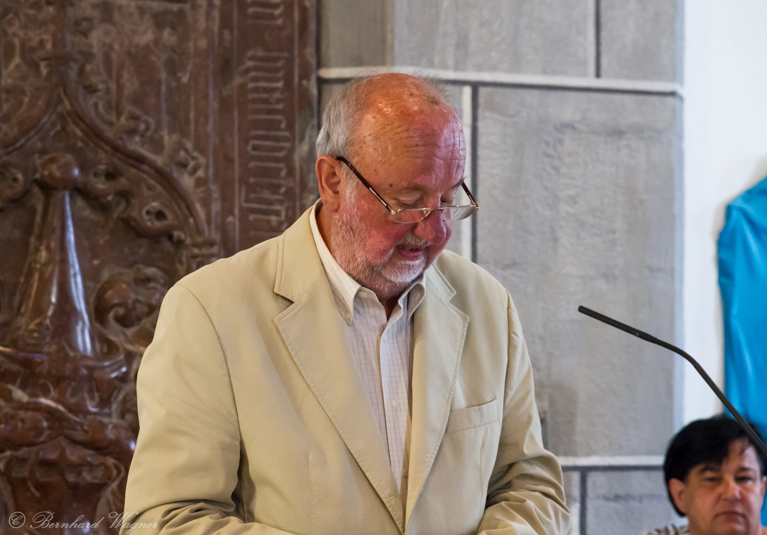 „Hier, beim Eingang unserer Markuskirche, begrüßt man eigentlich nur den Bischof, wenn er zur Firmung oder Visitation kommt, oder einen anderen besonderen Gast. Das möchte ich aber heute, lieber Engelbert, nicht tun, weil du bist und bleibst für uns hier in Wolfsberg kein Gast. Das war, das ist und das bleibt dein Zuhause. Als Träger des Wappenringes der Stadt bist du ein Teil unserer Geschichte, für viele ein Vorbild und eine wichtige, prägende Persönlichkeit. Aus diesen Gründen habe ich dem Finanzausschuss der Pfarre Wolfsberg vorgeschlagen (und diese meine Bitte hat volle Zustimmung gefunden), dass als Zeichen unserer Dankbarkeit und Wertschätzung dir gegenüber hier eine Danktafel angebracht wird, aus der die kommenden Generationen die durch dein Leben geschriebene Geschichte lesen und lernen werden. Das ist unser Geschenk für dich zum Abschluss deines offiziellen Wirkens bei uns. Und in diesem Zeichen, durch diese Danktafel, bleibst du auch für immer ein Teil unserer Gegenwart, unseres ‚Hier und jetzt’“