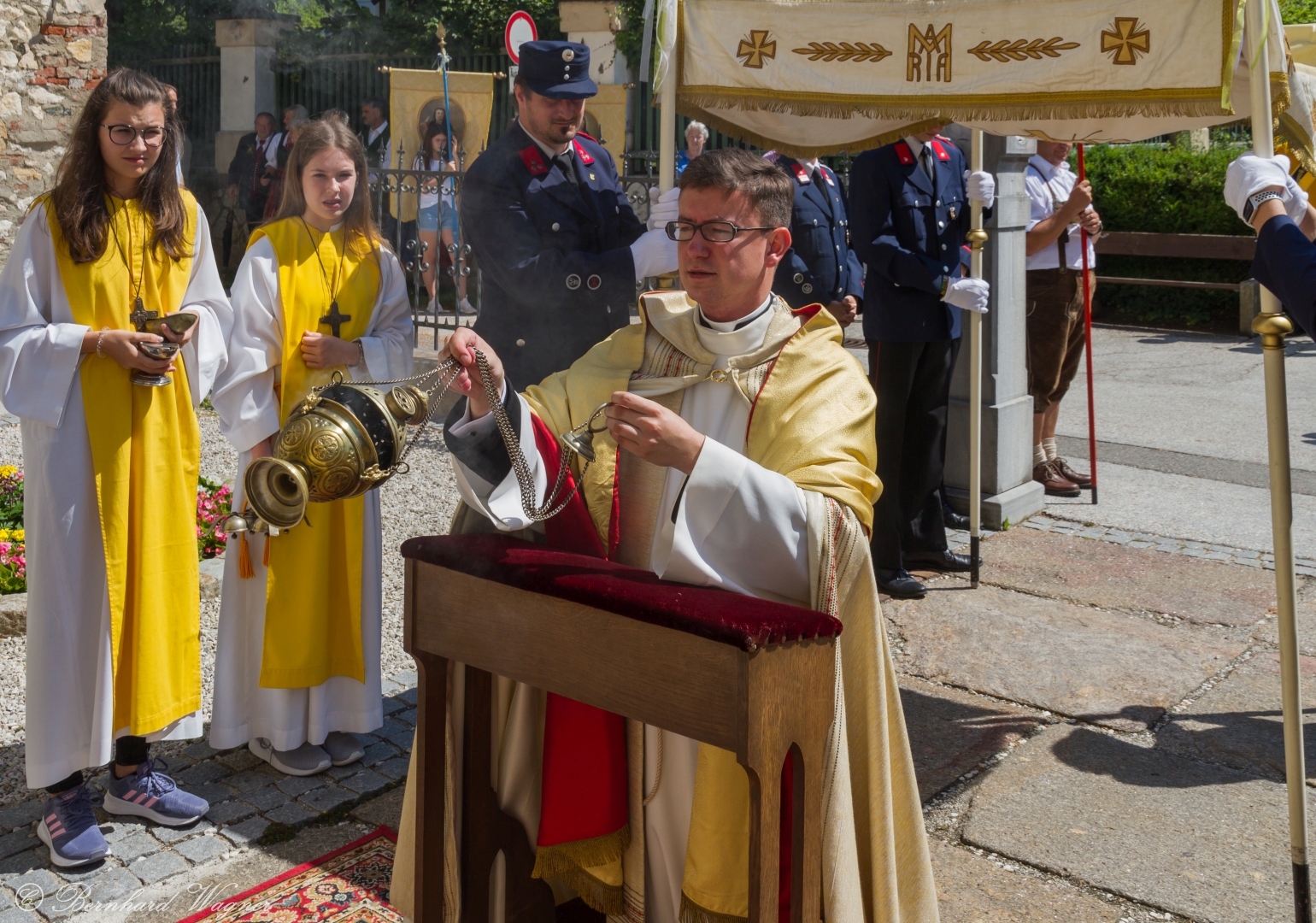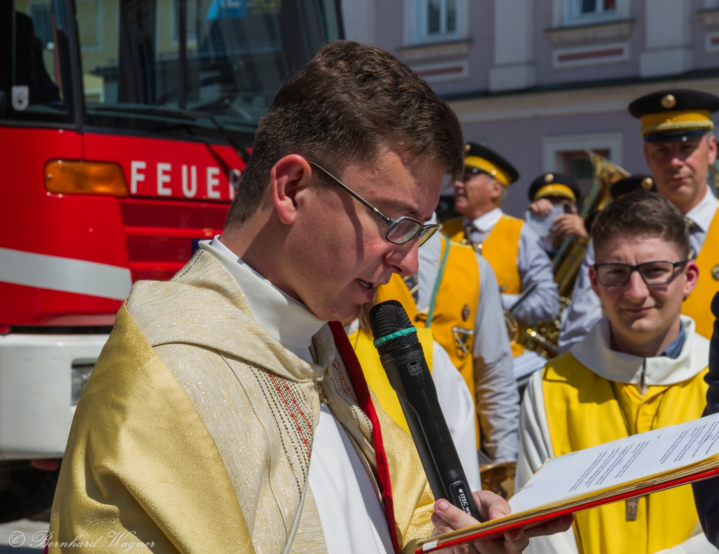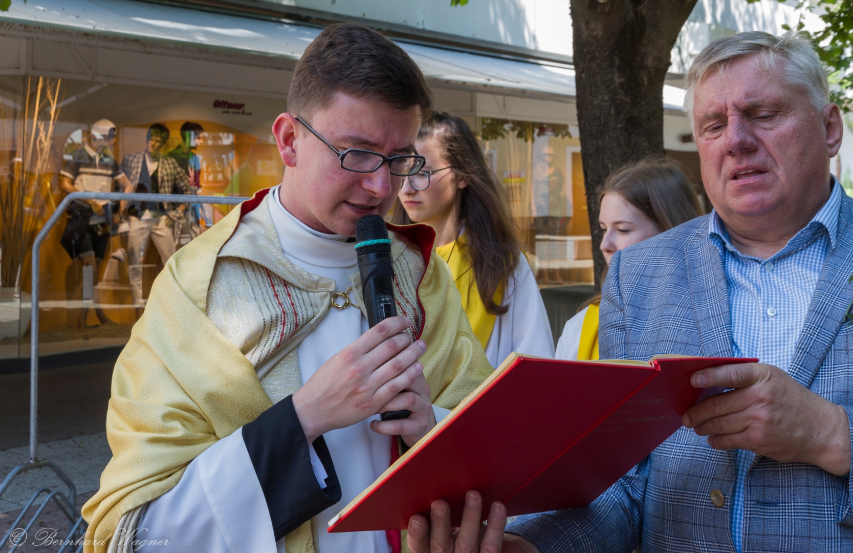 Pfarrprovisor Mag. Dr. Christoph Kranicki feierte am Donnerstag, den 20. Juni in der Stadtpfarrkirche St. Markus das Hochfest des Leibes und Blutes unseres Herrn Jesus Christus, Fronleichnam. Der Festgottesdienst begann um 9.30 Uhr und wurde von einer Vielzahl an Gläubigen besucht, darunter auch zahlreiche Frauen und Männer von Traditionsträgern, Vereinen und Gruppen der Stadt.