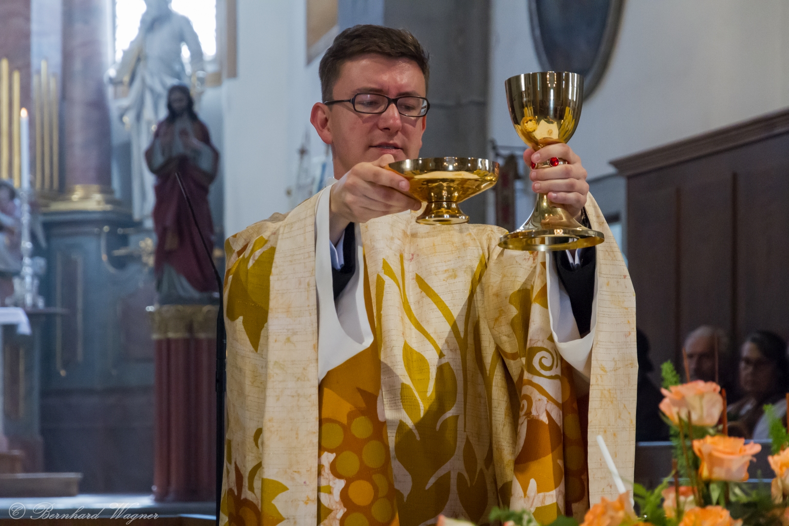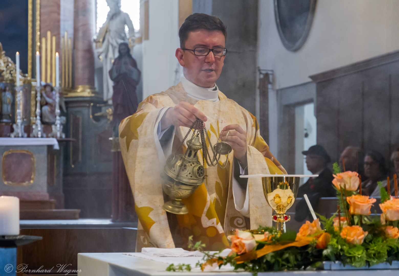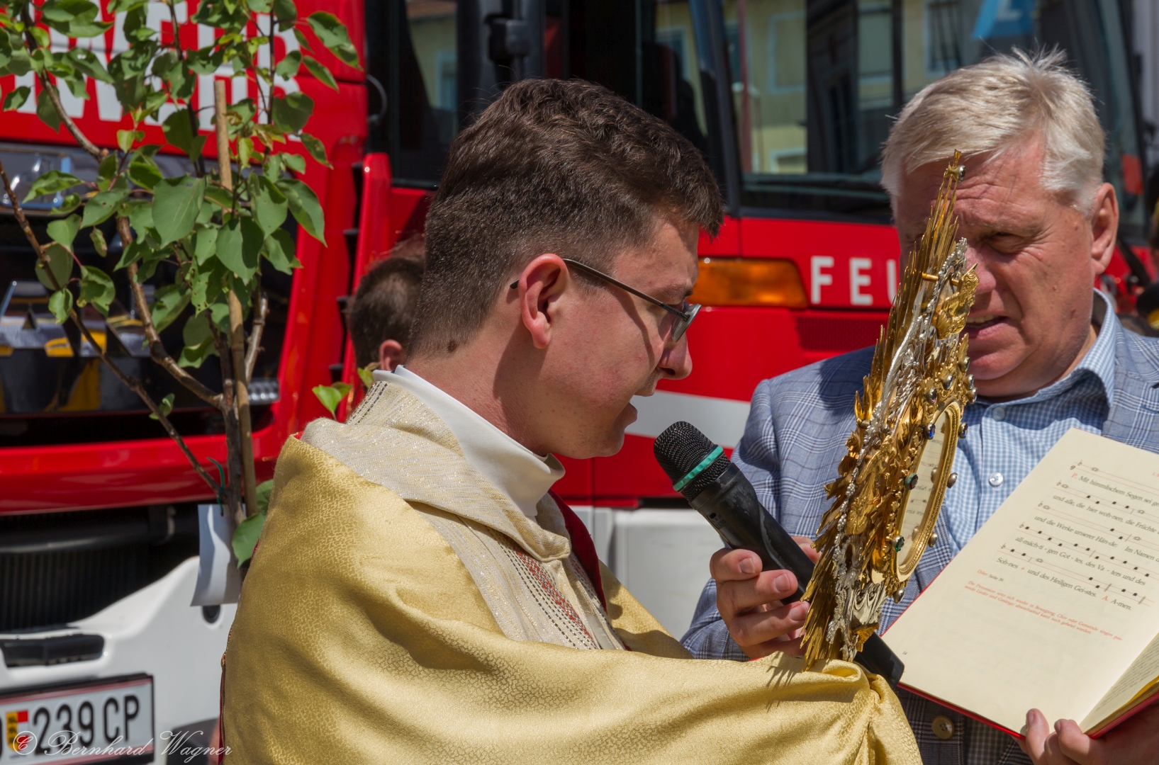 Pfarrprovisor Mag. Dr. Christoph Kranicki feierte am Donnerstag, den 20. Juni in der Stadtpfarrkirche St. Markus das Hochfest des Leibes und Blutes unseres Herrn Jesus Christus, Fronleichnam. Der Festgottesdienst begann um 9.30 Uhr und wurde von einer Vielzahl an Gläubigen besucht, darunter auch zahlreiche Frauen und Männer von Traditionsträgern, Vereinen und Gruppen der Stadt.