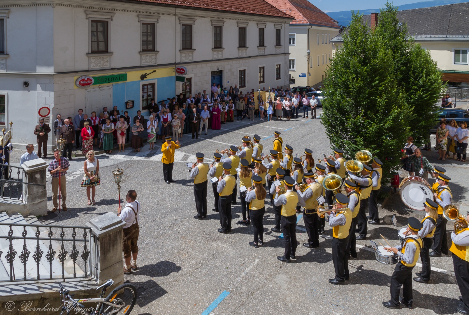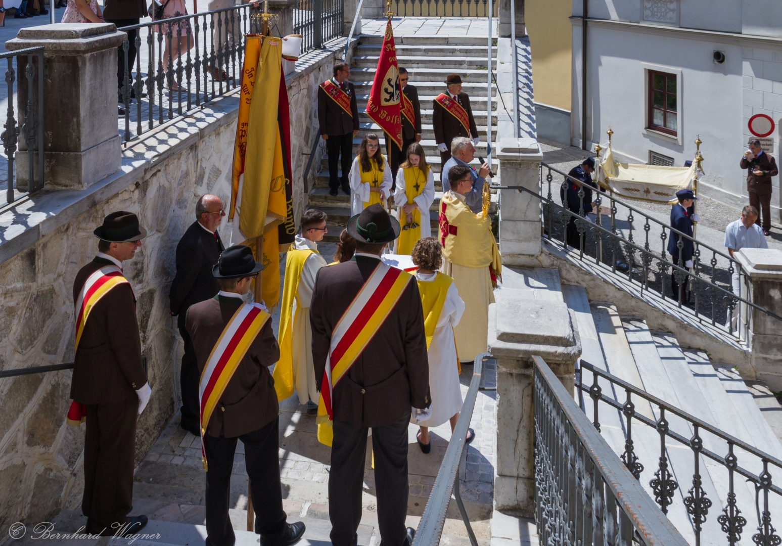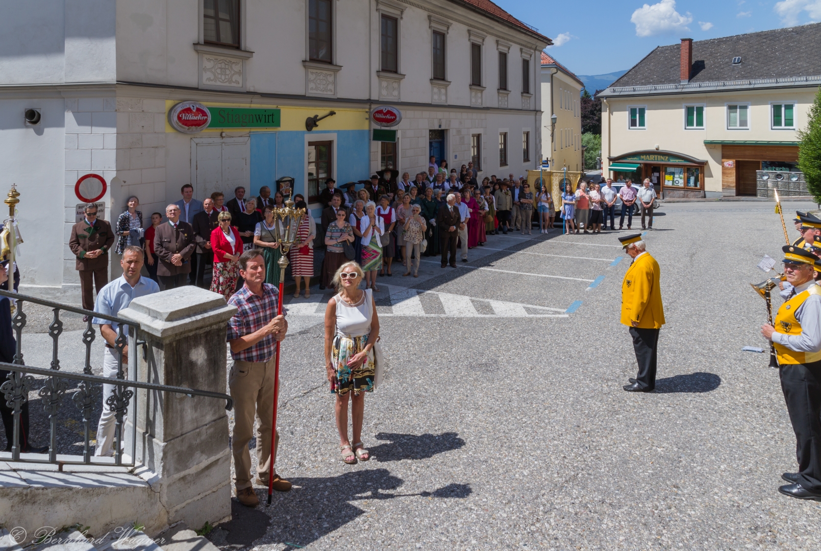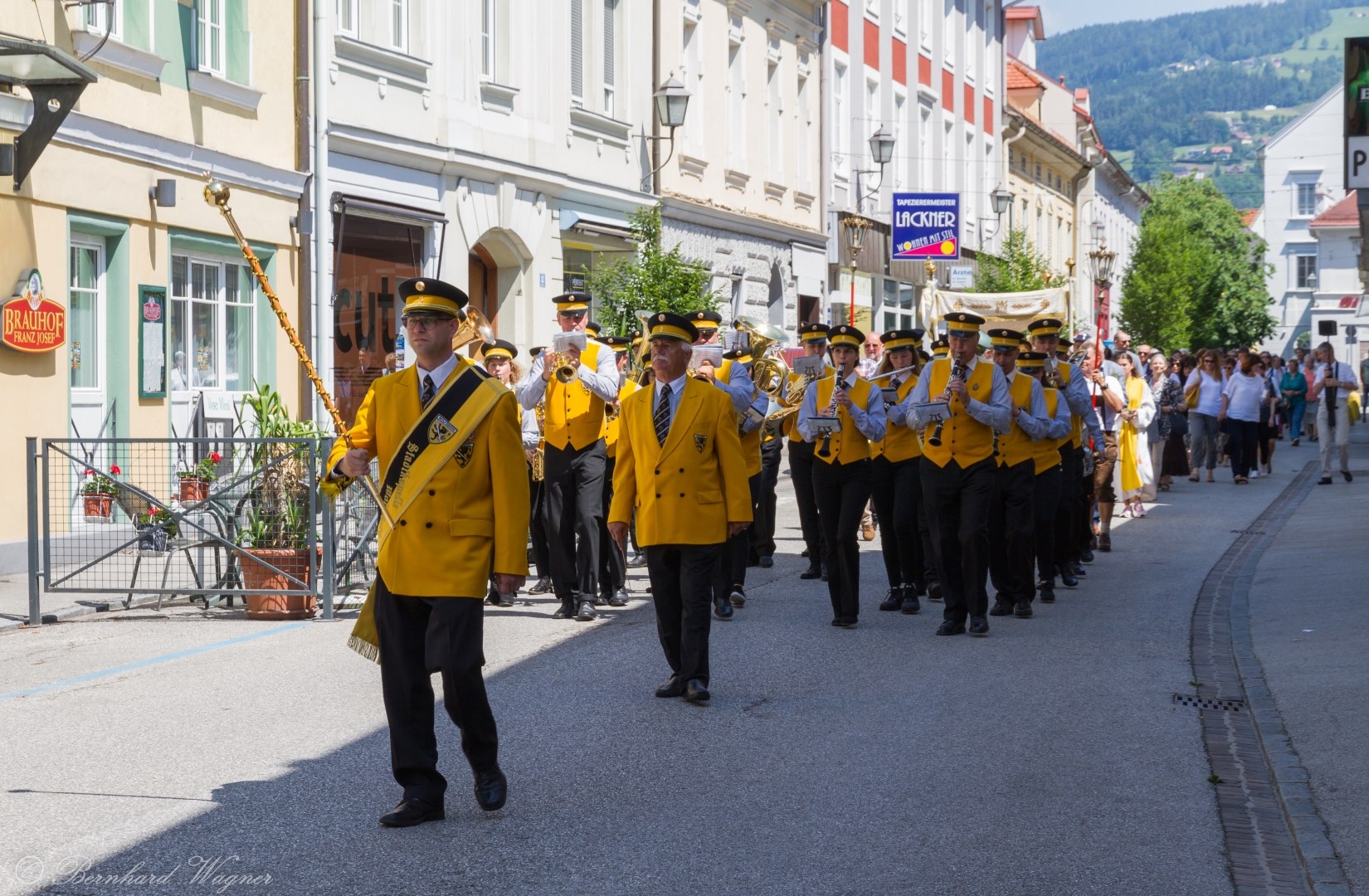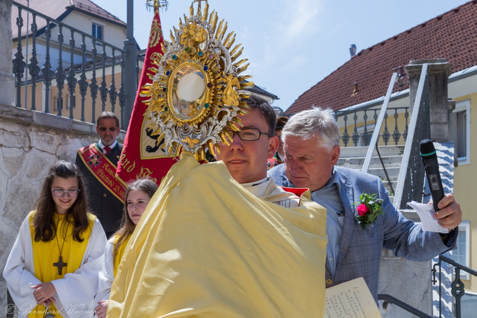 Im Anschluss an den Festgottesdienst folgte bei prächtigem Sommerwetter die Fronleichnamsprozession durch die Stadt. Musikalisch gestaltete diese wie alljährlich die Stadtkapelle Wolfsberg. Vier Altäre, und zwar bei der Rektoratskirche Mariä Himmelfahrt, dem Feuerwehr-Rüsthaus, am Offnerplatzl sowie am Schulplatz beim Stiegenaufgang zum Markusplatz, bildeten hierbei Stationen der Prozession. Am Hohen Platz bei der dortigen Mariensäule konnte in diesem Jahr aufgrund von Bauarbeiten kein Altar errichtet werden weshalb man wie schon am Palmsonntag den Schulplatz wählte.