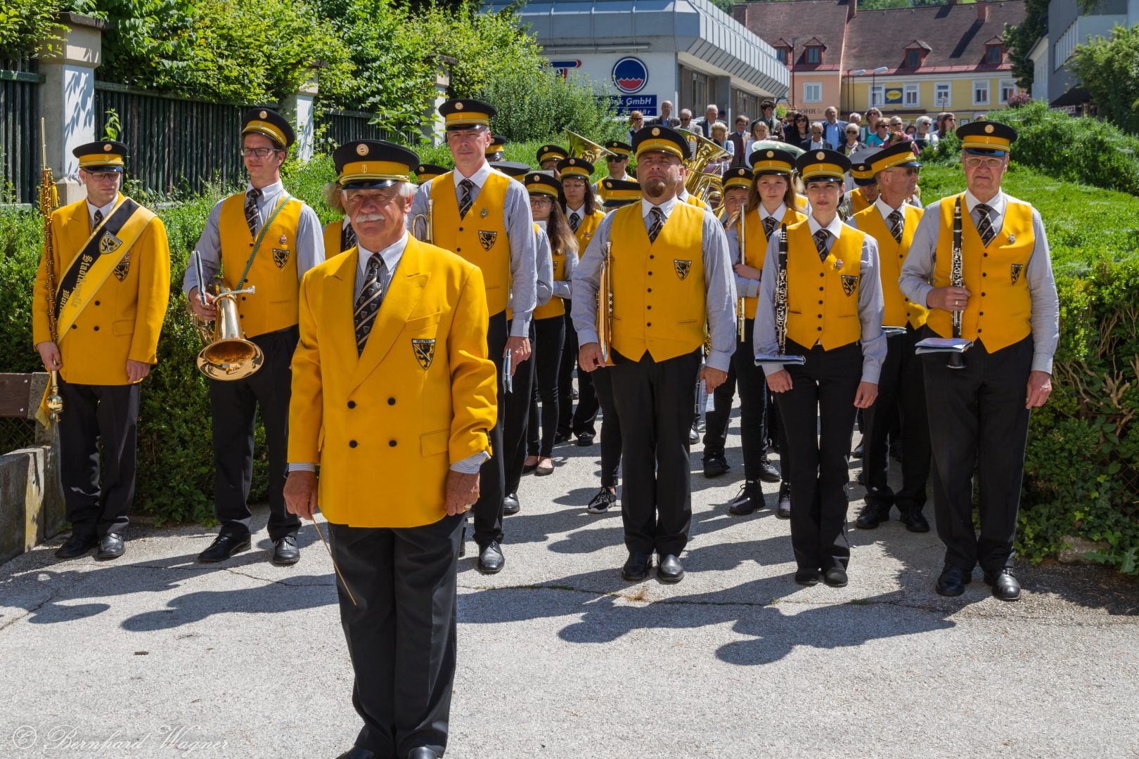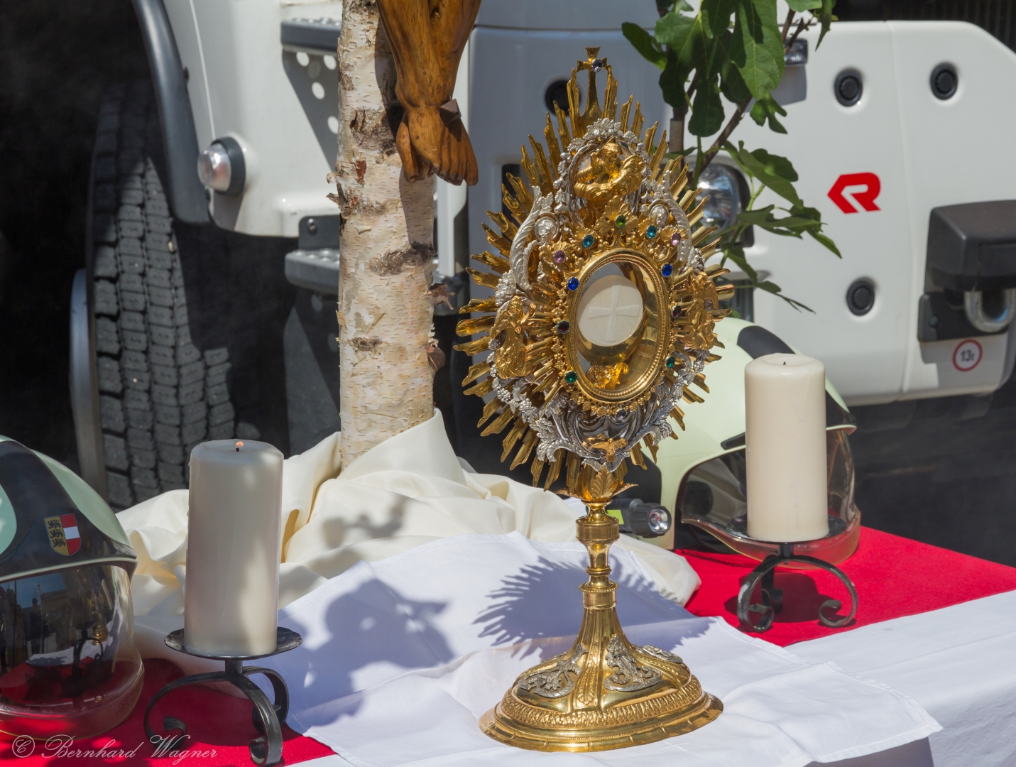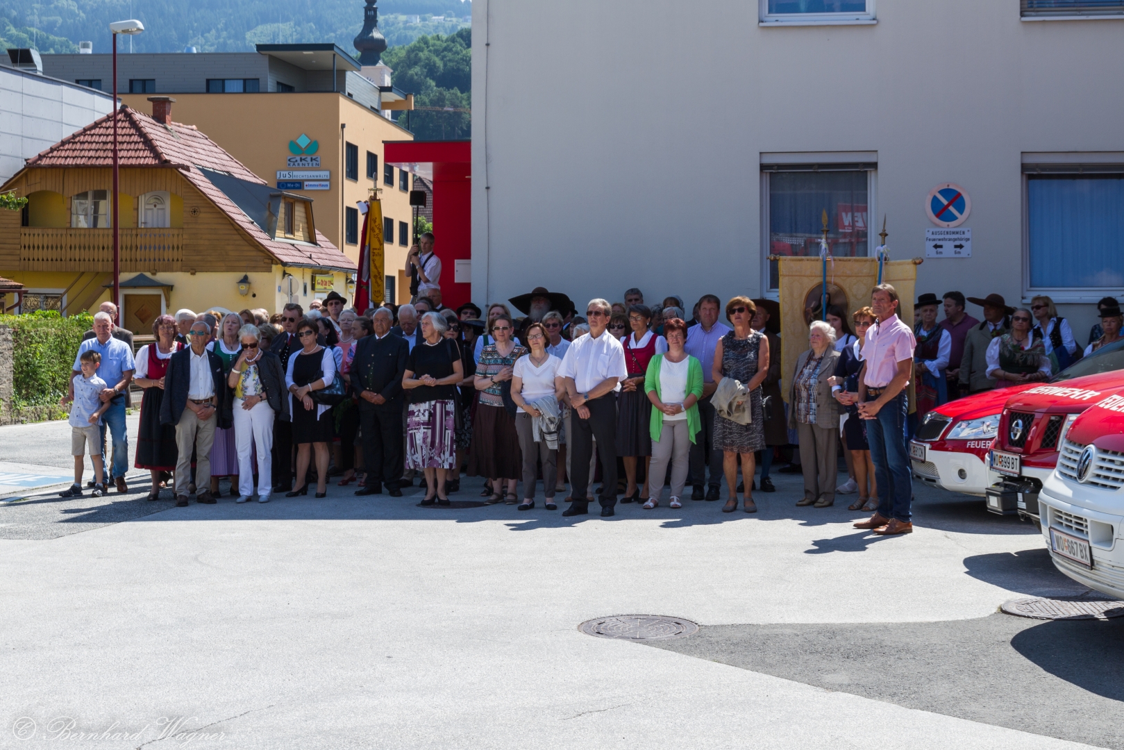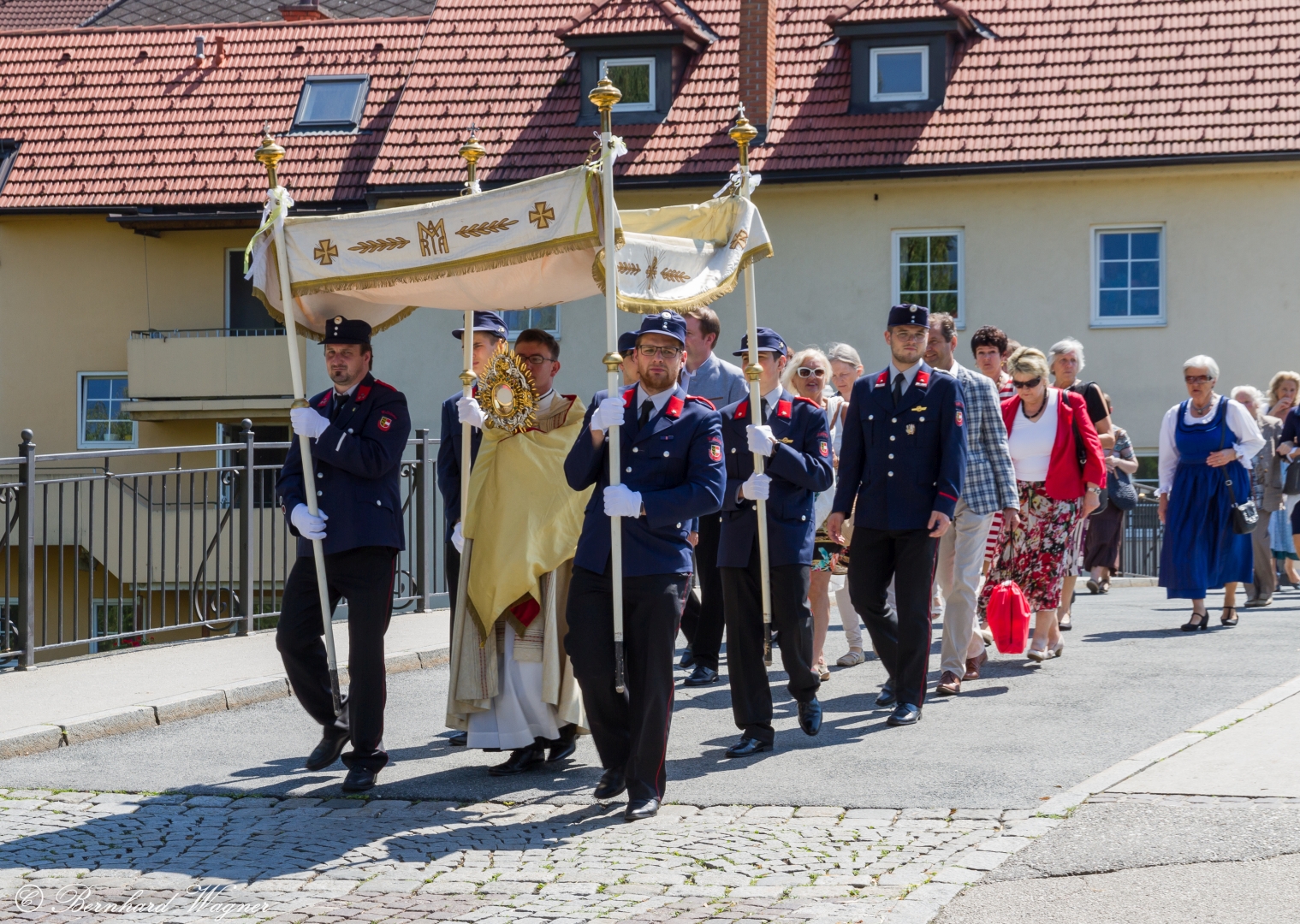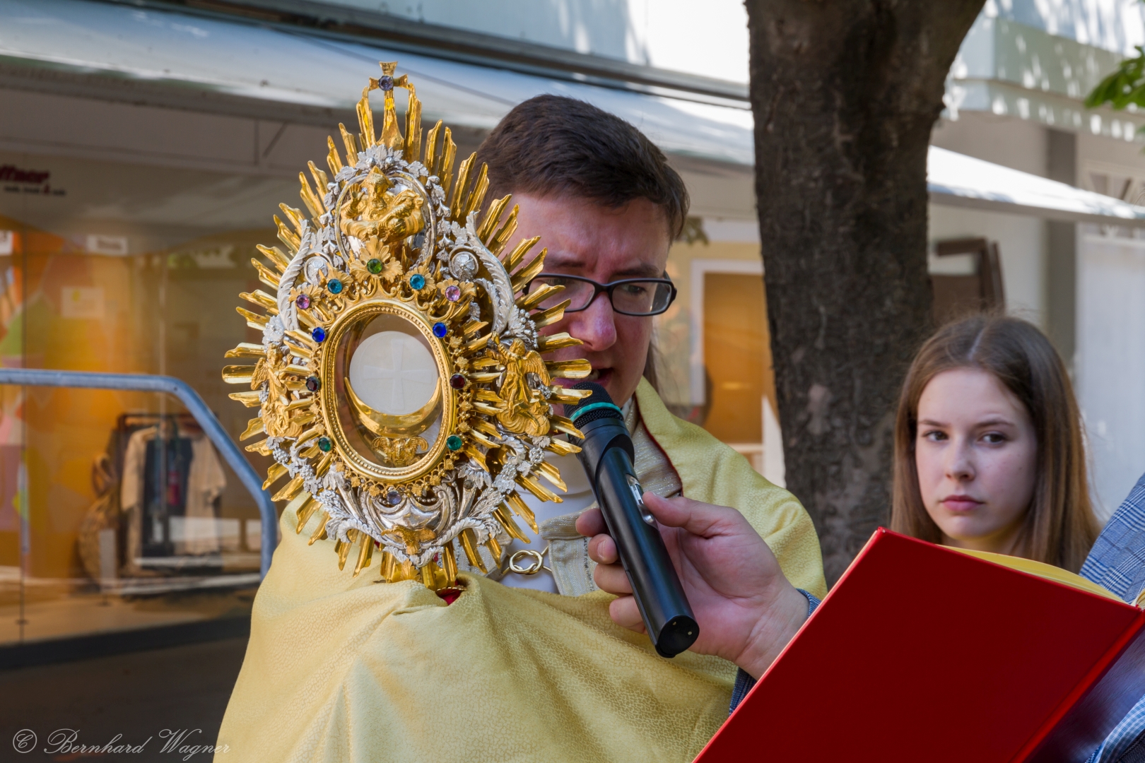 Im Anschluss an den Festgottesdienst folgte bei prächtigem Sommerwetter die Fronleichnamsprozession durch die Stadt. Musikalisch gestaltete diese wie alljährlich die Stadtkapelle Wolfsberg. Vier Altäre, und zwar bei der Rektoratskirche Mariä Himmelfahrt, dem Feuerwehr-Rüsthaus, am Offnerplatzl sowie am Schulplatz beim Stiegenaufgang zum Markusplatz, bildeten hierbei Stationen der Prozession. Am Hohen Platz bei der dortigen Mariensäule konnte in diesem Jahr aufgrund von Bauarbeiten kein Altar errichtet werden weshalb man wie schon am Palmsonntag den Schulplatz wählte.