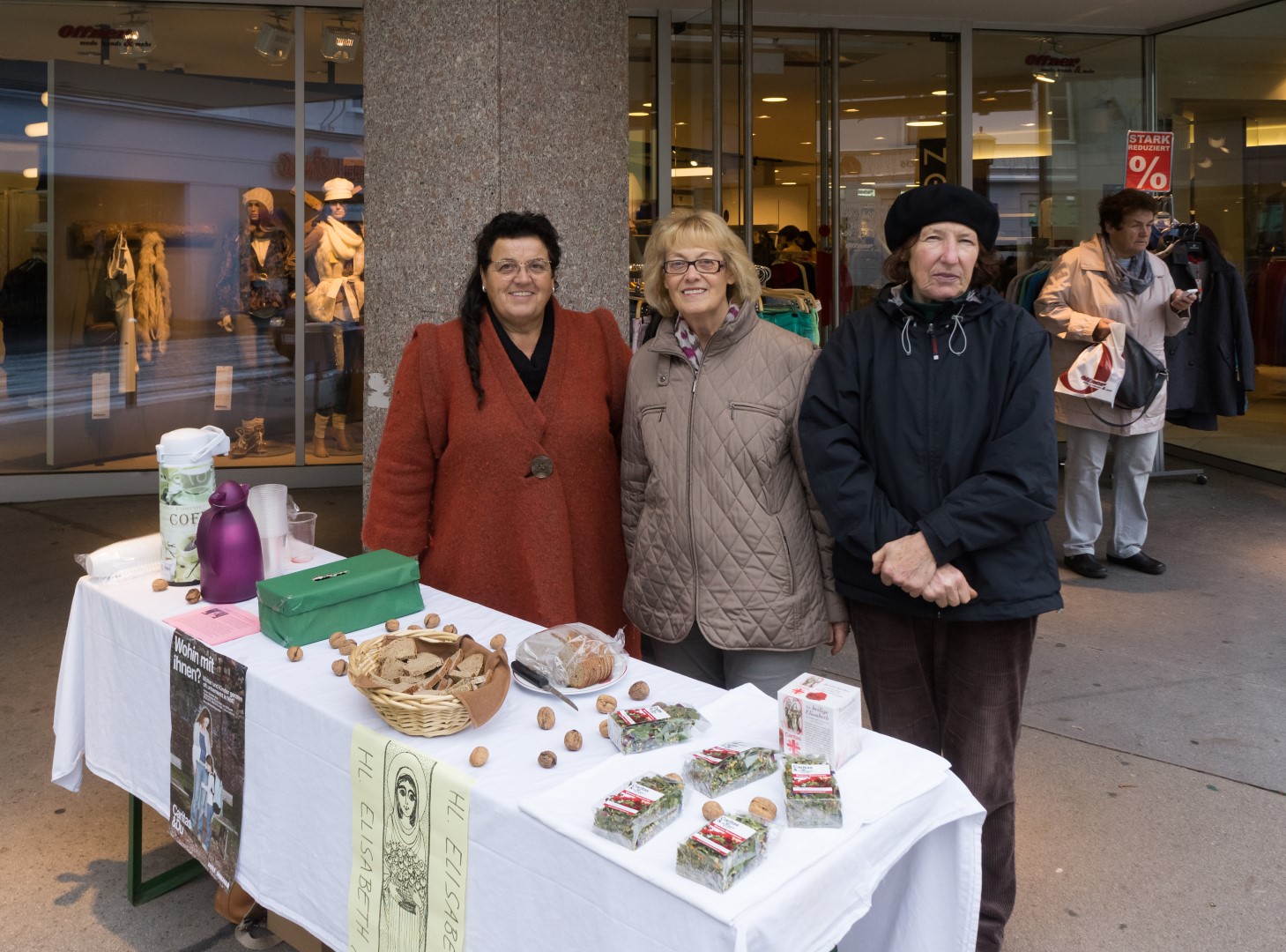 Frau Melitta Moser gemeinsam mit Frau Hermine Jennewein und Frau Elisabeth Sperr (von links) bei der Elisabethsammlung am Offnerplatzl. Des Weiteren findet sich ein Stand beim Lagerhaus (© Herr Mag. Bernhard Wagner).