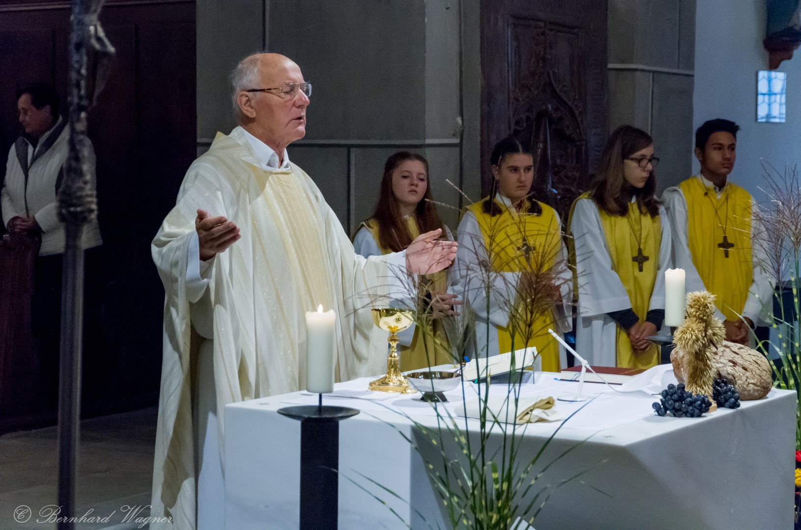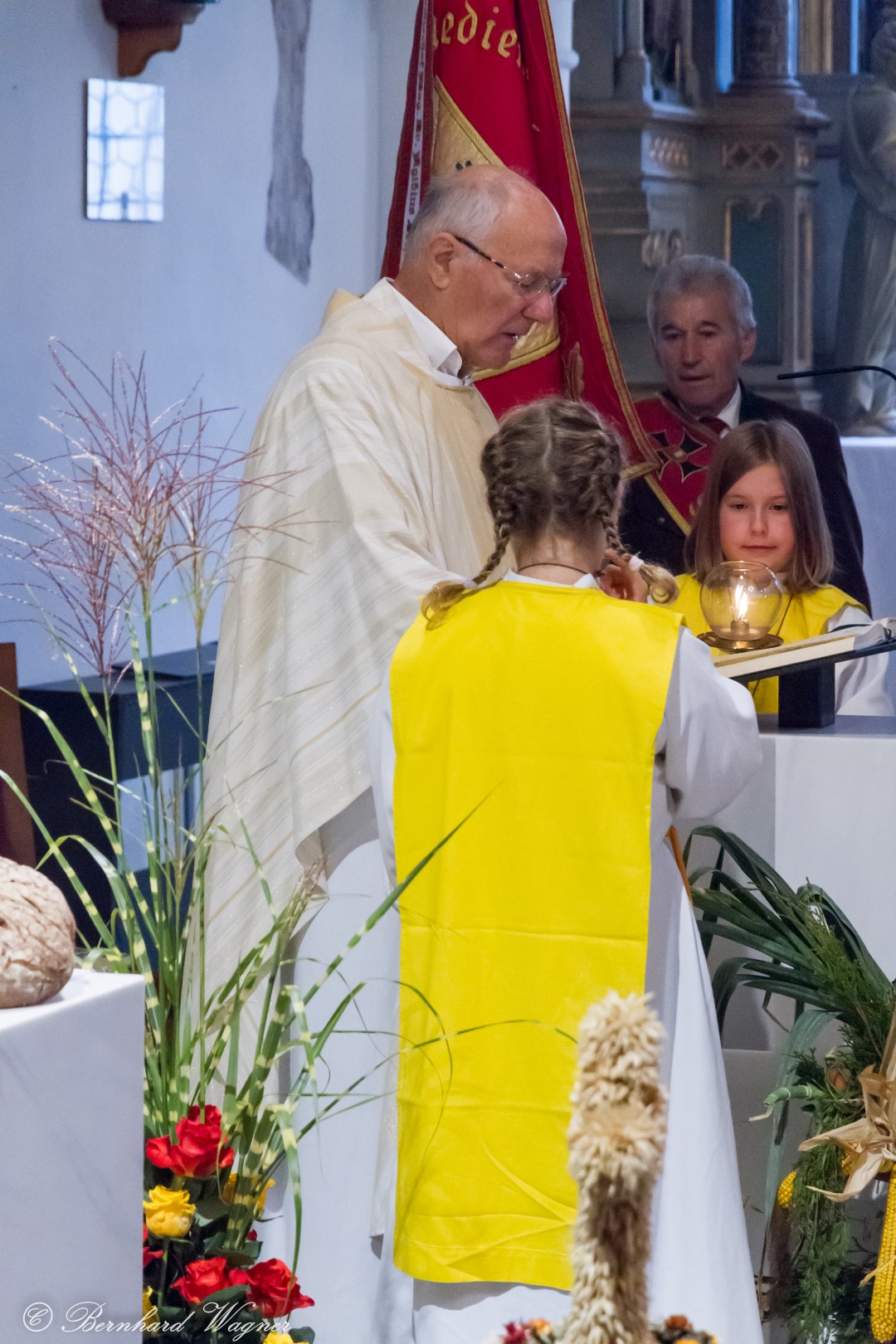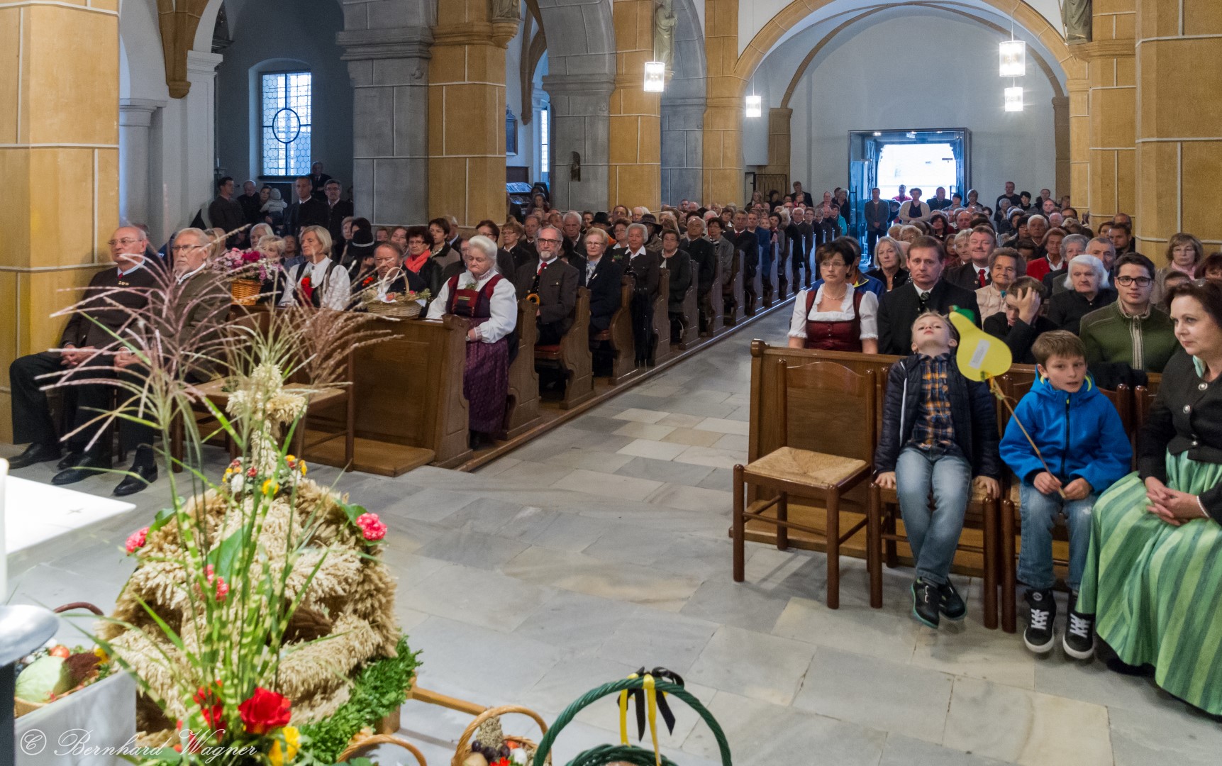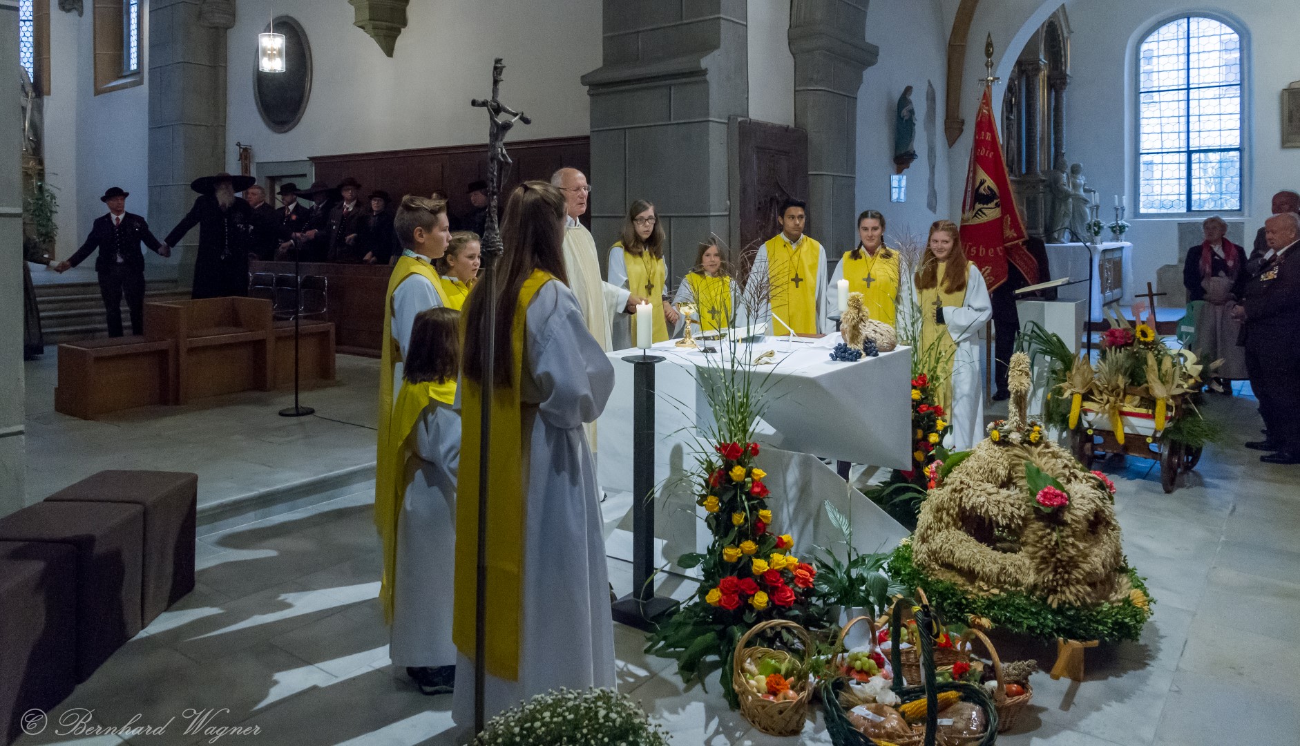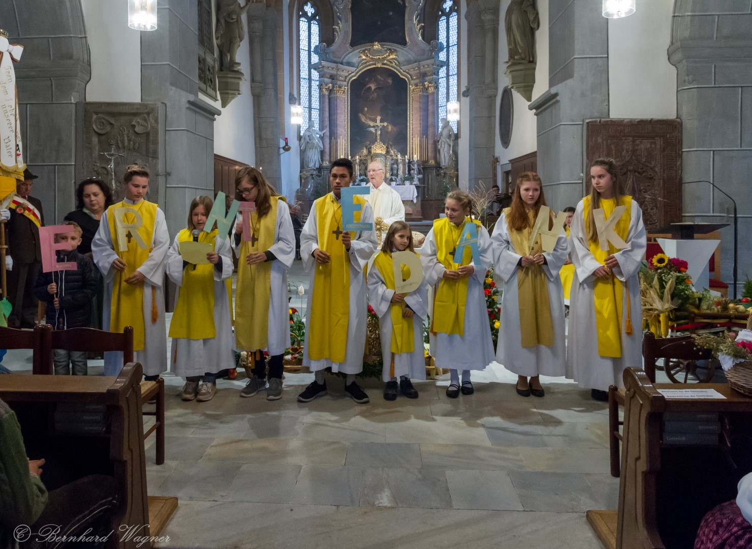 Am ersten Sonntag im Monat, den 2. Oktober, wurde in der Pfarre Wolfsberg das Erntedankfest gefeiert um für die Ernte des Jahres Dank zu sagen. Die Feier sollte eigentlich wie jedes Jahr um 10.00 Uhr am Weiherplatz beginnen wo traditionell die Erntegaben gesegnet werden und schließlich ein Festzug über den Hohen Platz zur Markuskirche stattfindet. Aufgrund regnerischen Wetters musste dieser Teil leider entfallen weshalb die gesamte Feier im Rahmen des Erntedankgottesdienstes, zelebriert von Dechant Mag. Engelbert Hofer, in der Markuskirche stattfand. Im Zuge der Segnung der Erntegaben hielten die anwesenden Ministranten einen ursprünglich für den Weiherplatz vorgesehenen, schönen Textvortrag bei welchem zu jedem aus Papier gefertigten Buchstaben des Wortes Erntedank ein hierzu passender, kurzer Text gelesen wurde.