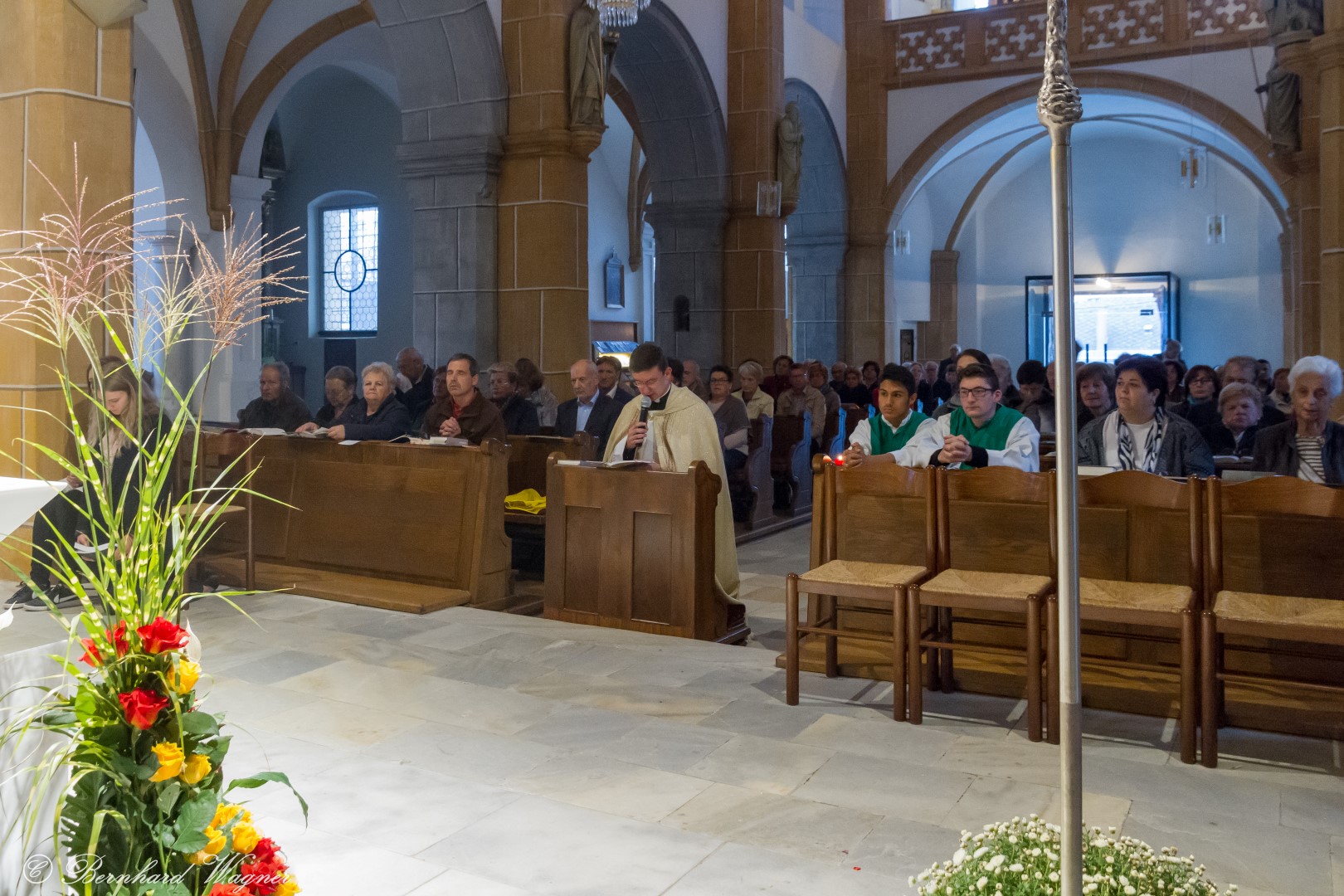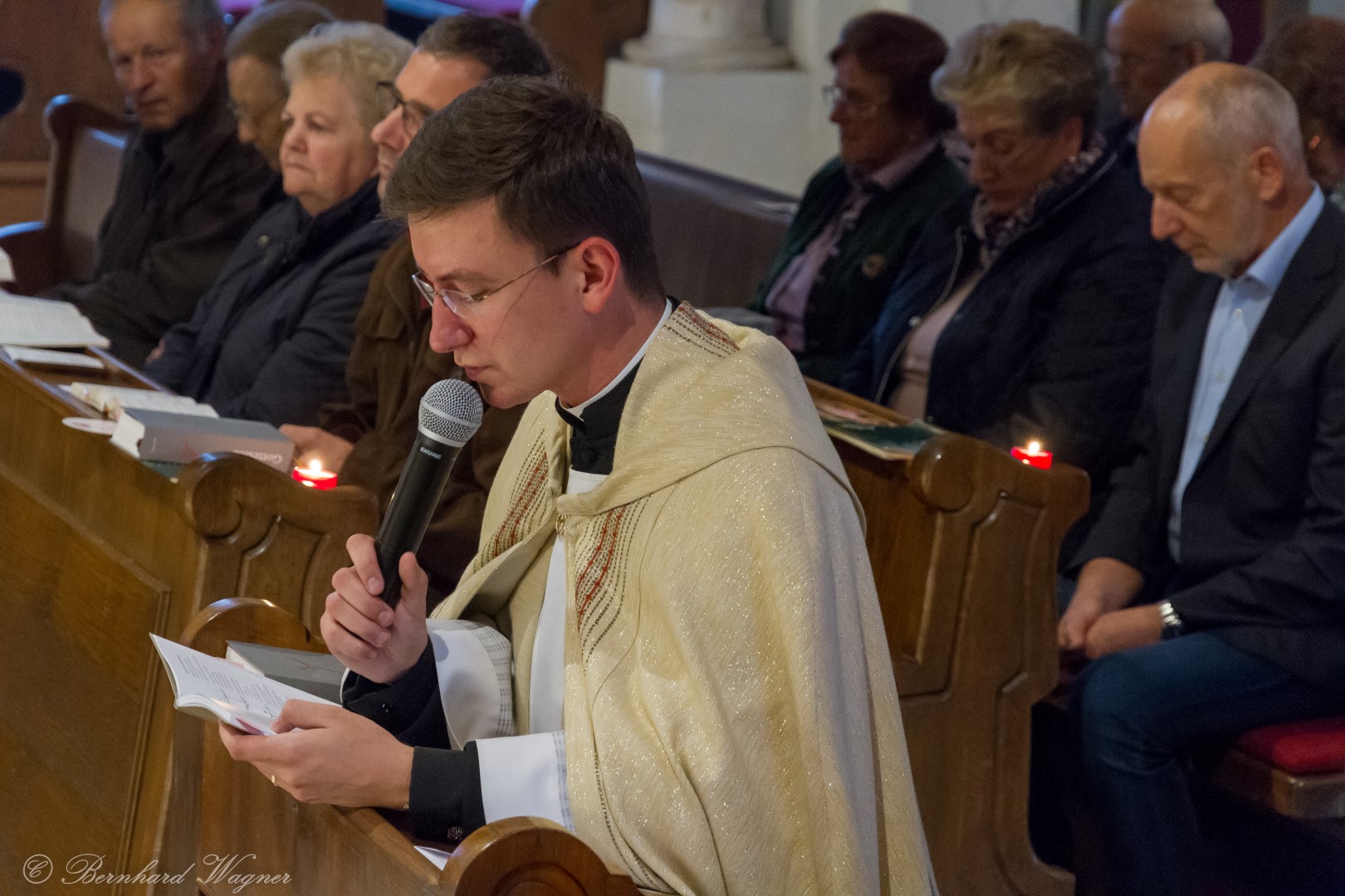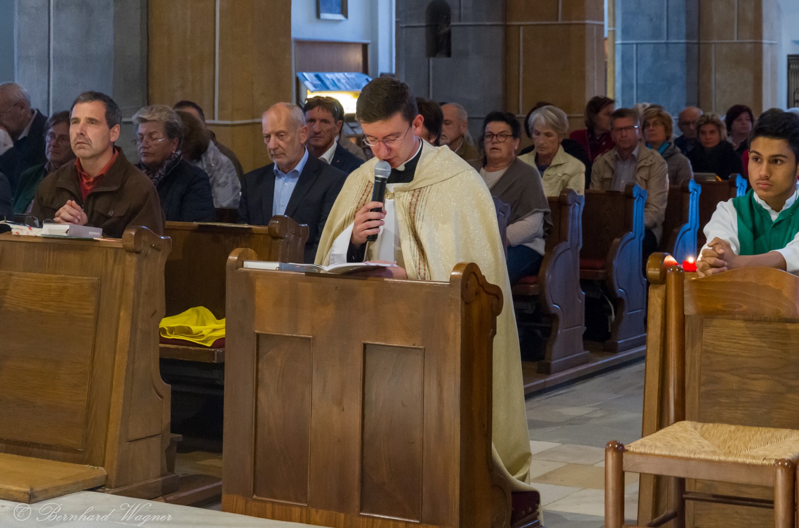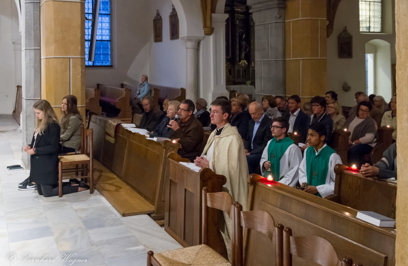 Nach erfolgter Einsetzung des Allerheiligsten im Tabernakel des Hochaltars feierte Kaplan Kranicki mit Diakon Schönhart und den Gläubigen den Abendgottesdienst in welchem die Predigt des Kaplans zum Thema Gottesbild einen besonderen Schwerpunkt bildete. Es ging darin im Wesentlichen um die Frage wer Gott für den Menschen eigentlich ist, nämlich zumeist jemand an den man ausschließlich Gebete richtet nur in Erwartung einer mehr oder weniger großen Hilfeleistung, und wer er eigentlich sein sollte, nämlich jemand dem man beispielsweise in Liebe begegnet.
