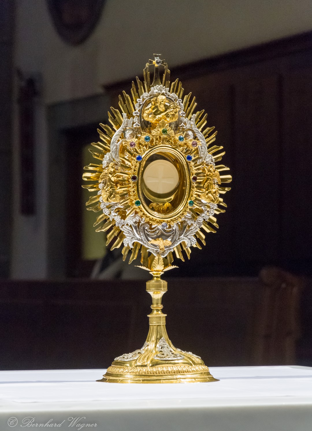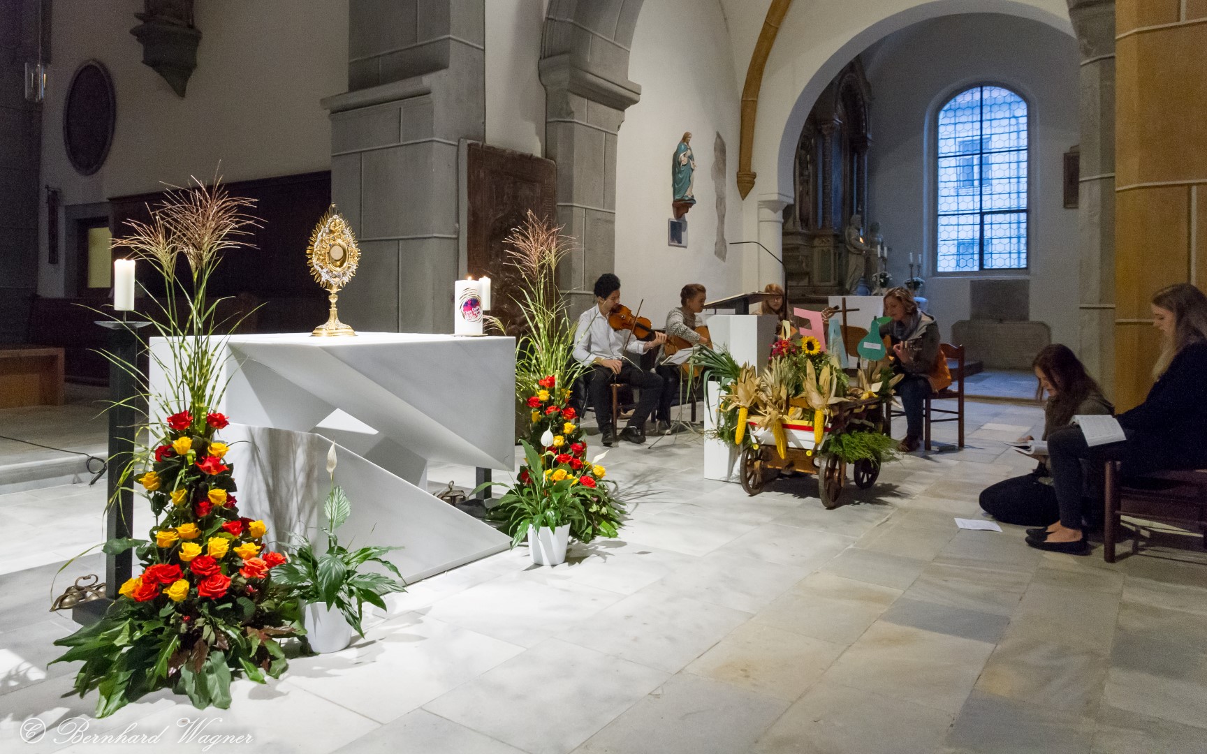 Kaplan Kranicki begrüßte zunächst die Gemeinde ehe er das Allerheiligste in der Monstranz zum Volksaltar übertrug und inzensierte worunter eine feierliche Beräucherung zu verstehen ist. Sodann wurde die Feier mit einem Volksgesang, an der Orgel begleitet durch Organistin Frau Christina Kaufmann, eröffnet und die folgende Stunde stand schließlich ganz im Zeichen der Anbetung Jesu mit unterschiedlichen Gebeten, betrachtenden Texten und Liedern. Die musikalische Gestaltung hatte eine Gitarrengruppe um Pastoralassistentin und Krankenhausseelsorgerin Frau Eva-Maria Kölbl-Perner zusammen mit einem Violinisten inne. Schöne Gesänge, u.a. auch wieder solche aus Taizé, stellten dabei eine besondere Bereicherung der Feier dar. Zum Abschluss des ersten Teils beteten Diakon Andreas Schönhart und eine Jugendliche den Barmherzigen Rosenkranz.