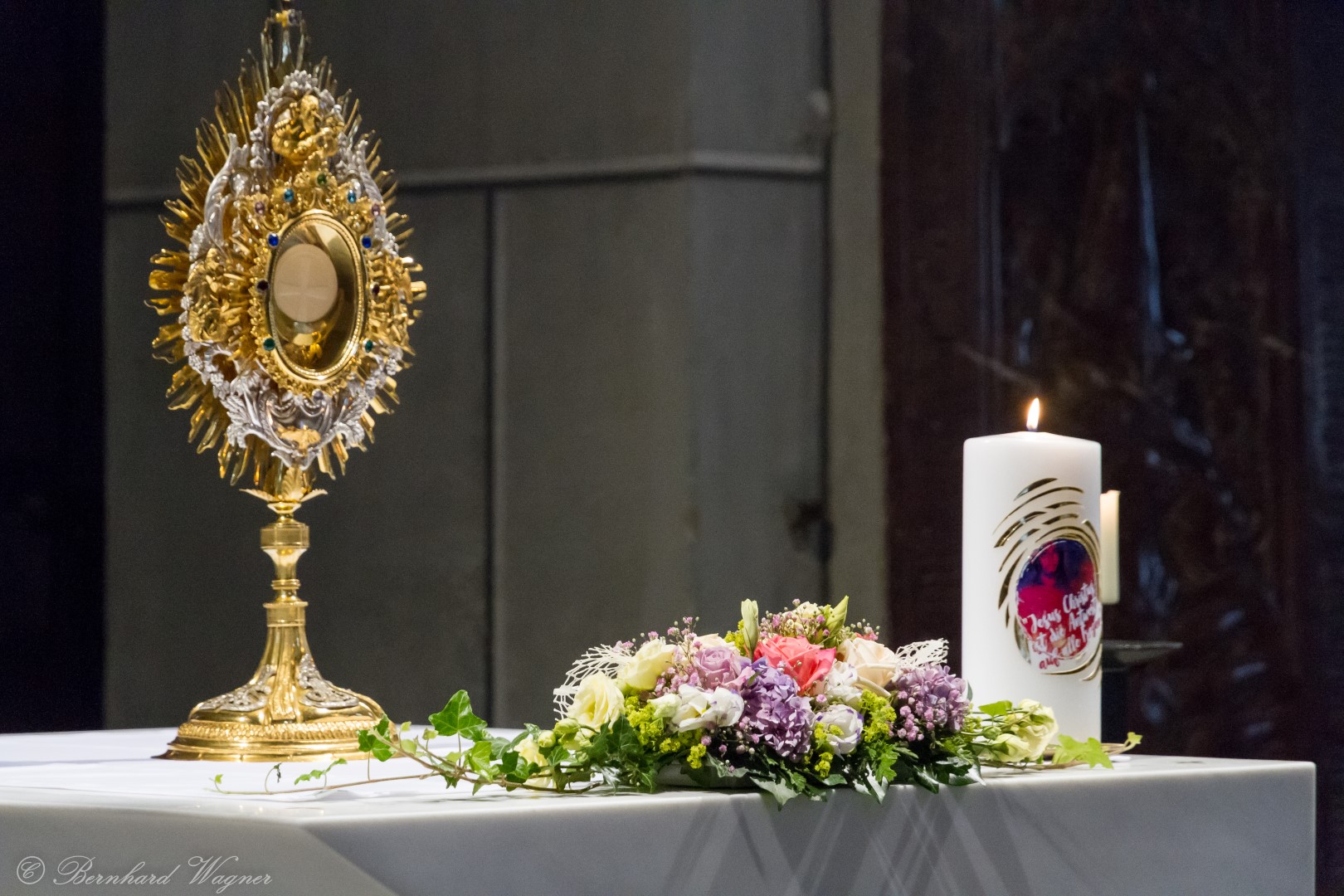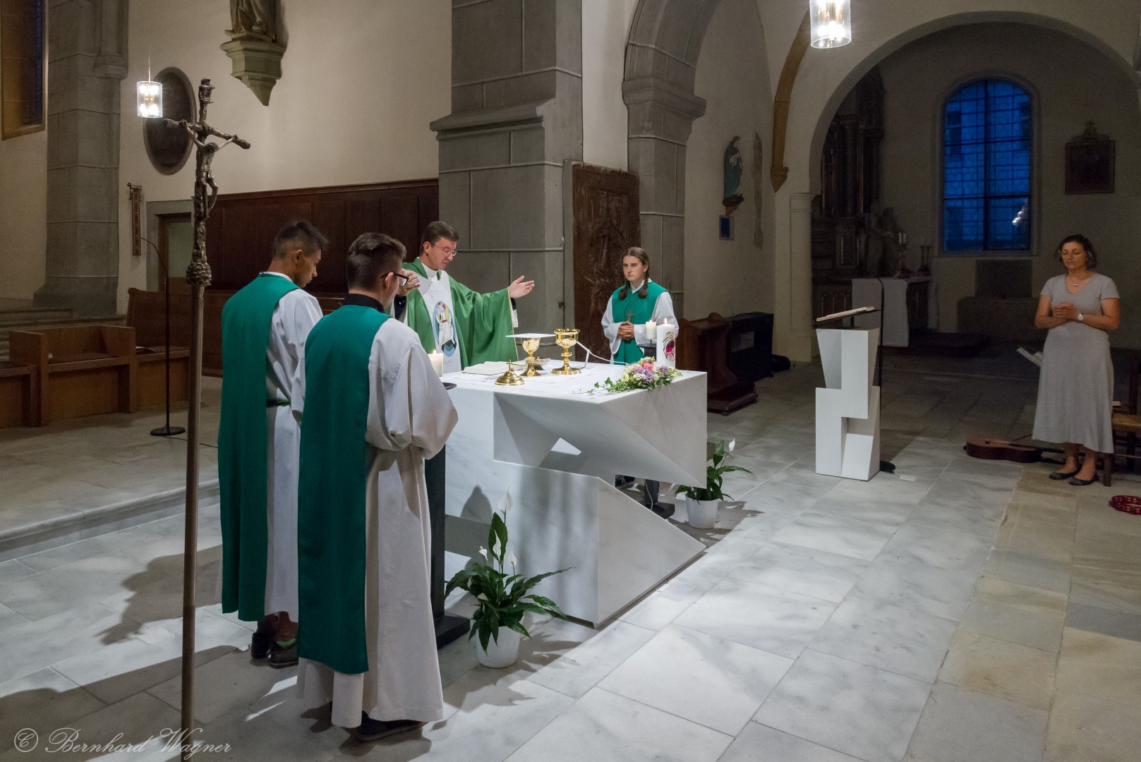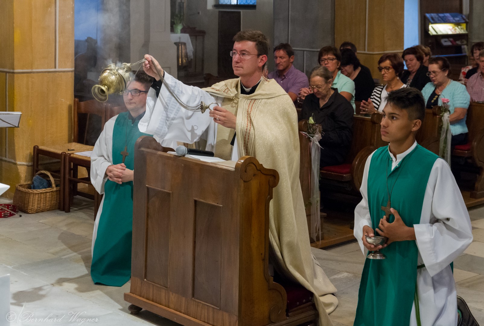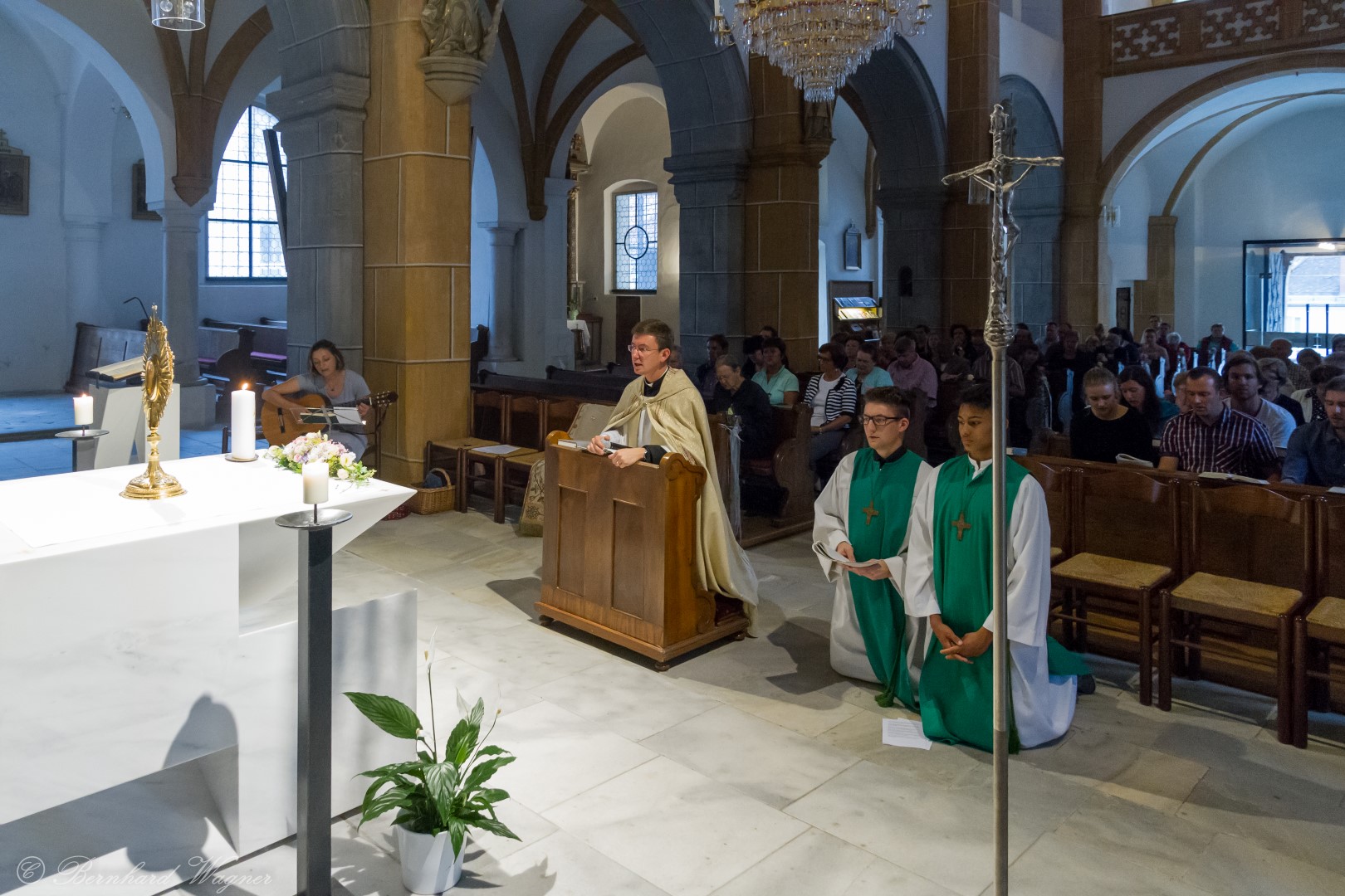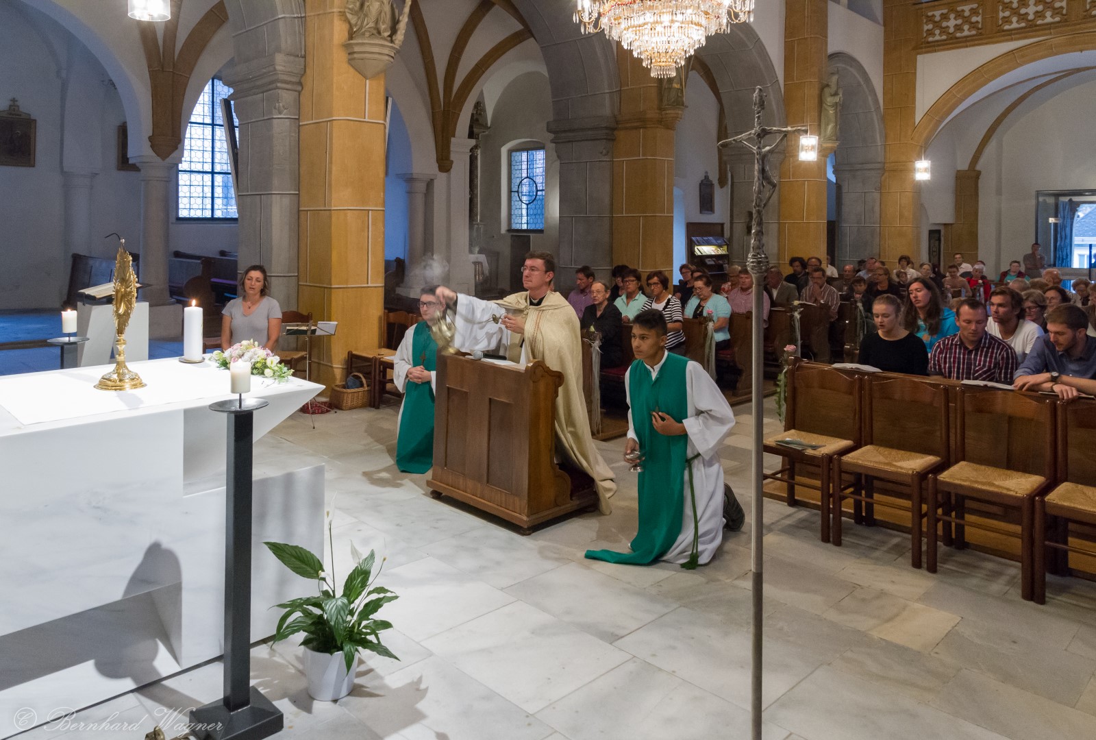 Nach der Begrüßung der anwesenden Gläubigen durch Kaplan Kranicki übertrug er das Allerheiligste in der Monstranz zum Volksaltar und nahm anschließend die Inzens, also eine feierliche Beräucherung, vor. Es folgte die festliche Eröffnung der Feier mit dem bekannten Lied „Großer Gott, wir loben dich”, an der Orgel gespielt durch Organistin Frau Christina Kaufmann, ehe man sich ganz in die Anbetung des Allerheiligsten mit verschiedenen Gebeten, betrachtenden Texten und Liedern vertiefte. Die musikalische Gestaltung übernahm dabei Pastoralassistentin und Krankenhausseelsorgerin Frau Eva-Maria Kölbl-Perner mit verschiedenen Gesängen, u.a. auch solchen aus Taizé, welche sie an ihrer Gitarre begleitete. Zum Abschluss des ersten Teils beteten Jugendliche den Barmherzigen Rosenkranz.